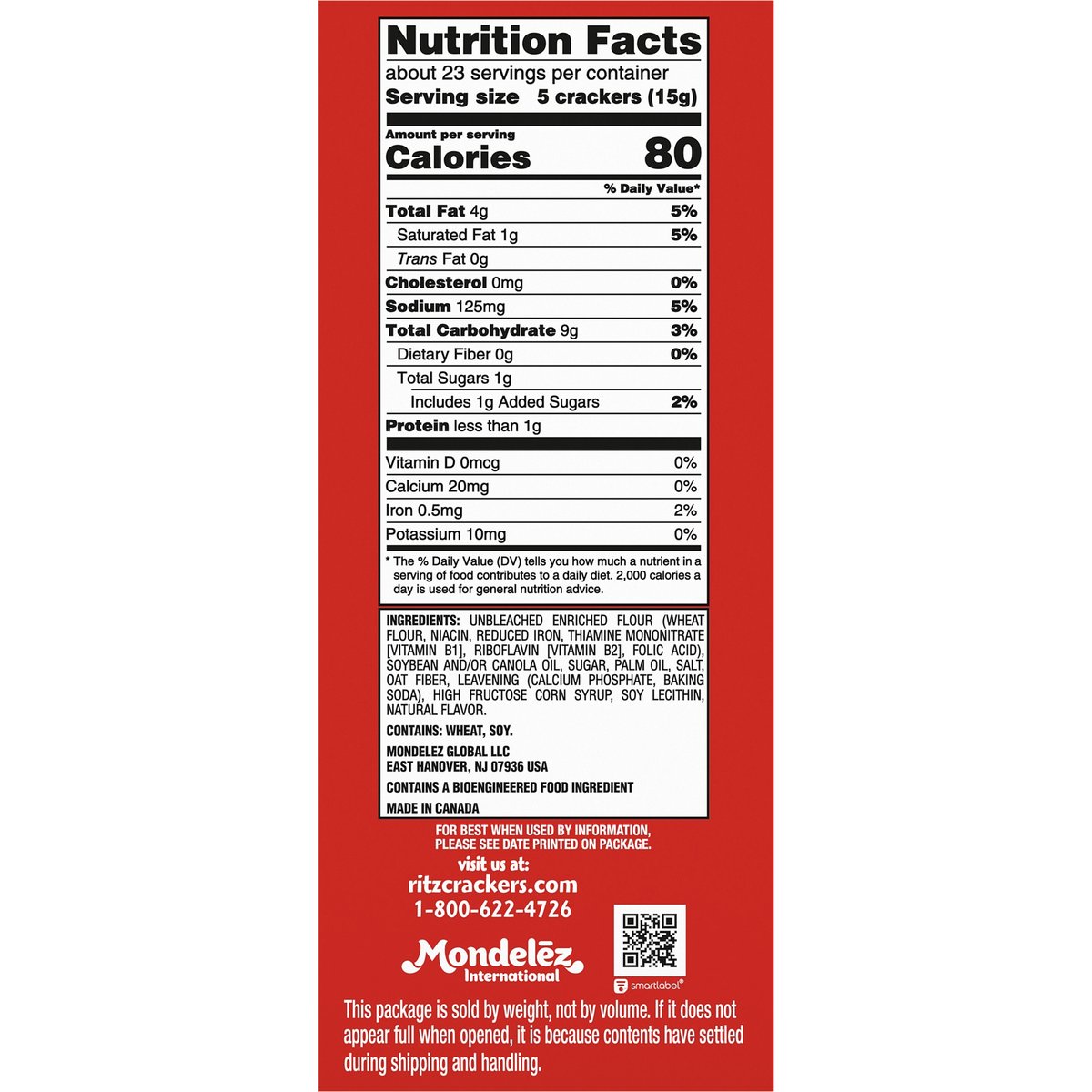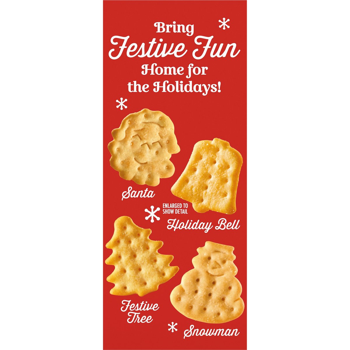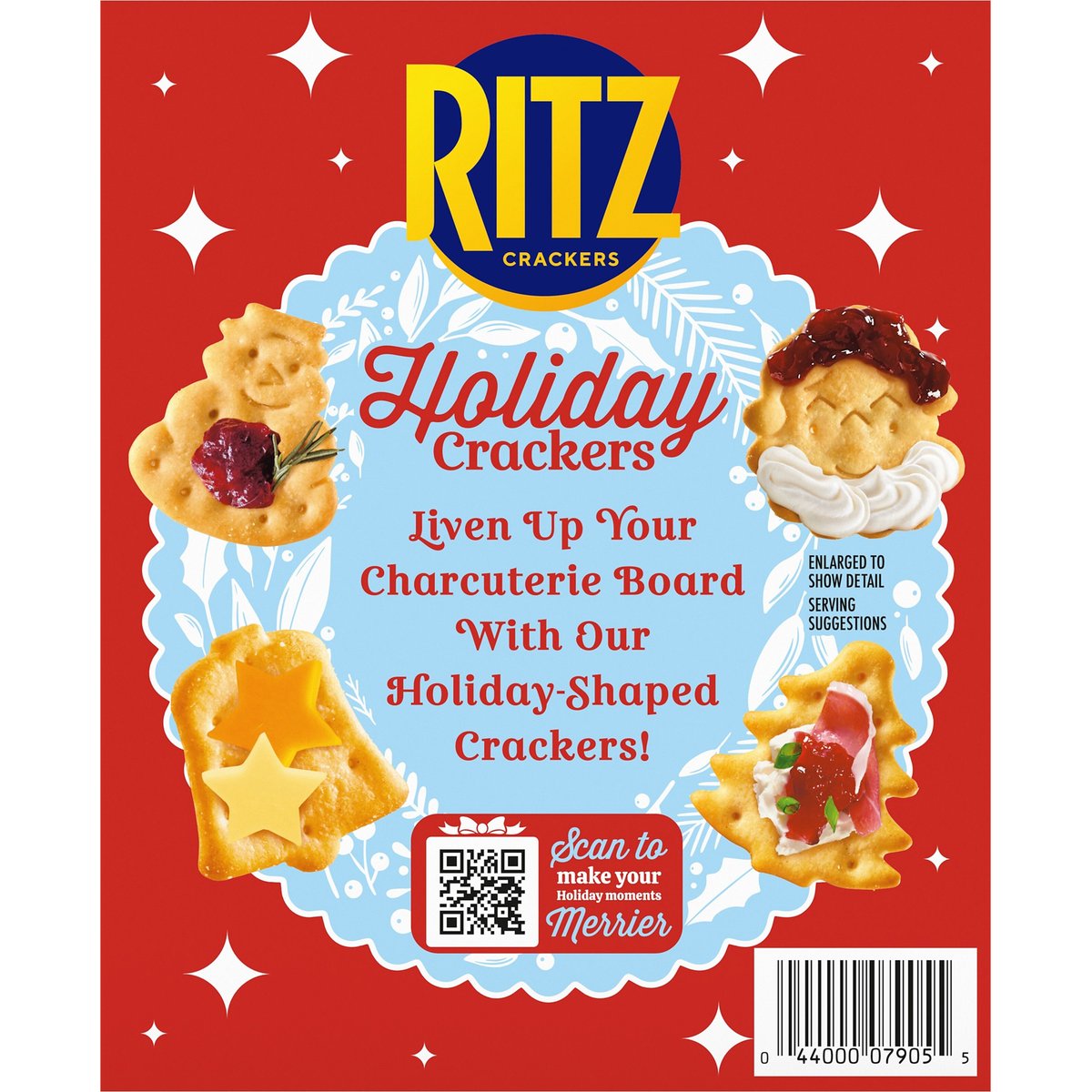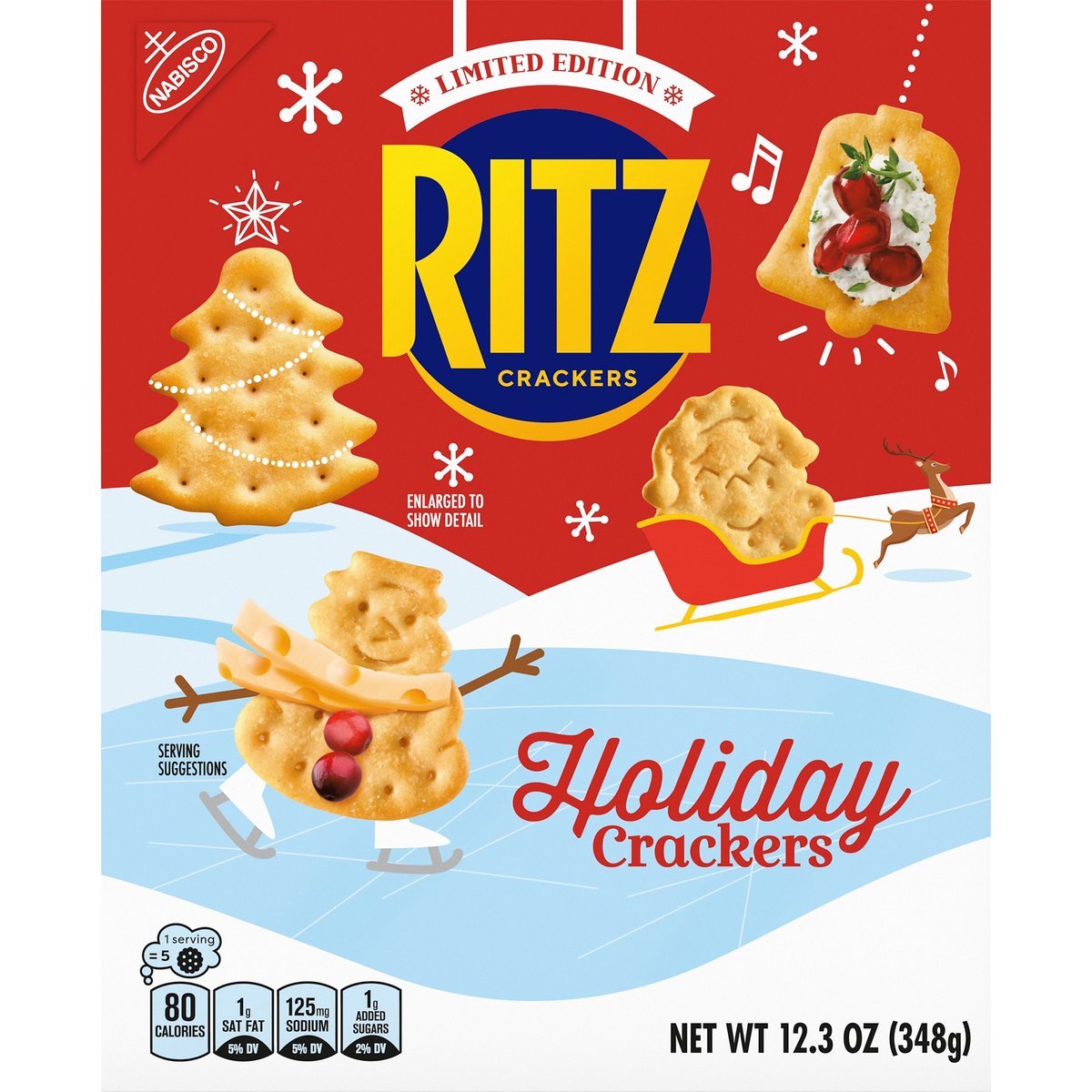 Limited Edition 1 Serving = 5 Crackers: 80 calories; 1 g sat fat (5% DV); 125 mg sodium (5% DV); 1 g added sugars (2% DV). Contains a bioengineered food ingredient. Liven up your charcuterie board with our Holiday Shaped Crackers! Bring festive fun home for the holidays! Santa, holiday bell, festive tree, snowman. This package is sold by weight, not by volume. If it does not appear full when opened, it is because contents have settled during shipping and handling. ritzcrackers.com. SmartLabel. Scan to make your holiday moments merrier. Visit us at: ritzcrackers.com. 1-800-622-4726. Made in Canada.