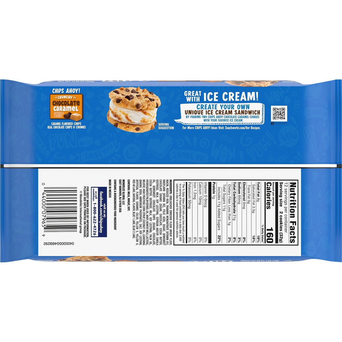 Real chocolate chip cookies. Artificially flavored. 1 serving = 2: 160 calories; 3.5 g sat fat (18% DV); 60 mg sodium (3% DV); 11 g added sugars (22% DV). Contains a bioengineered food ingredient. New. Great with ice cream. Create your own unique ice cream sandwich by pairing two chips ahoy. Chocolate caramel cookies with your favorite ice cream. Snackworks.com/Our-Recipes. SmartLabel. Visit us at: facebook.com/chipsahoy or call weekdays: 1-800-622-4726. For more Chips Ahoy! Ideas visit: Snackworks.com/Our-Recipes. Made in Mexico.