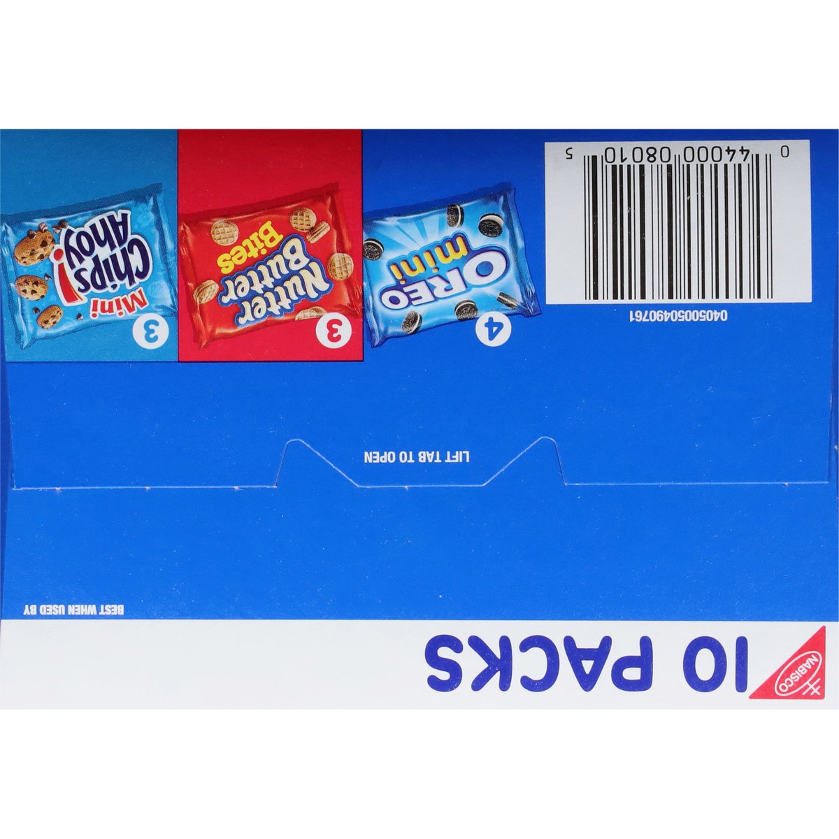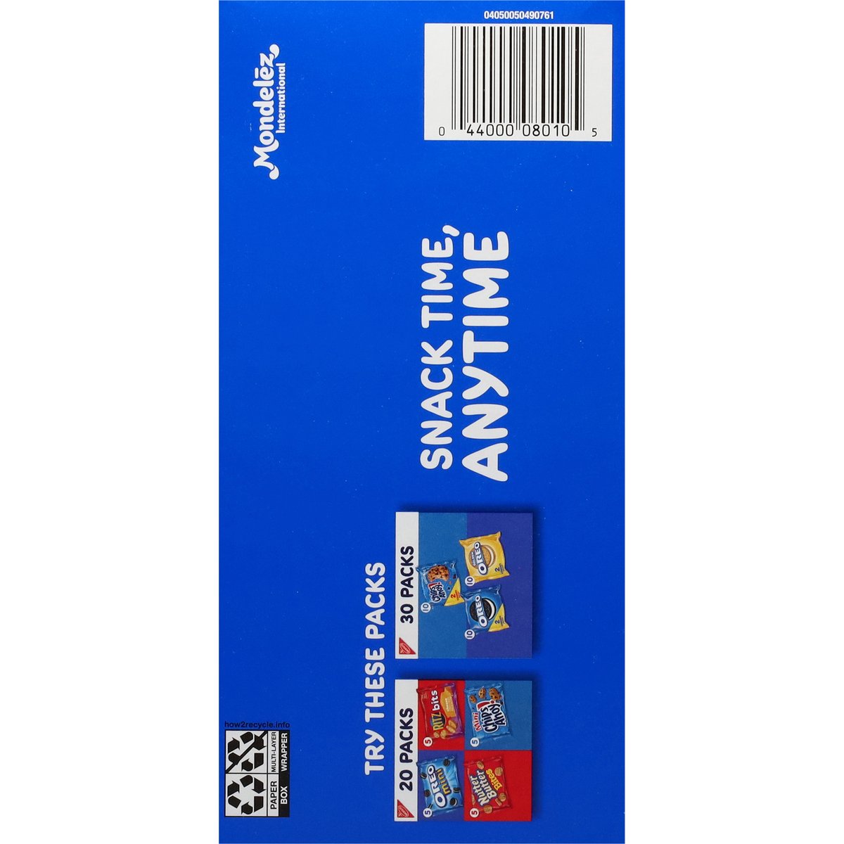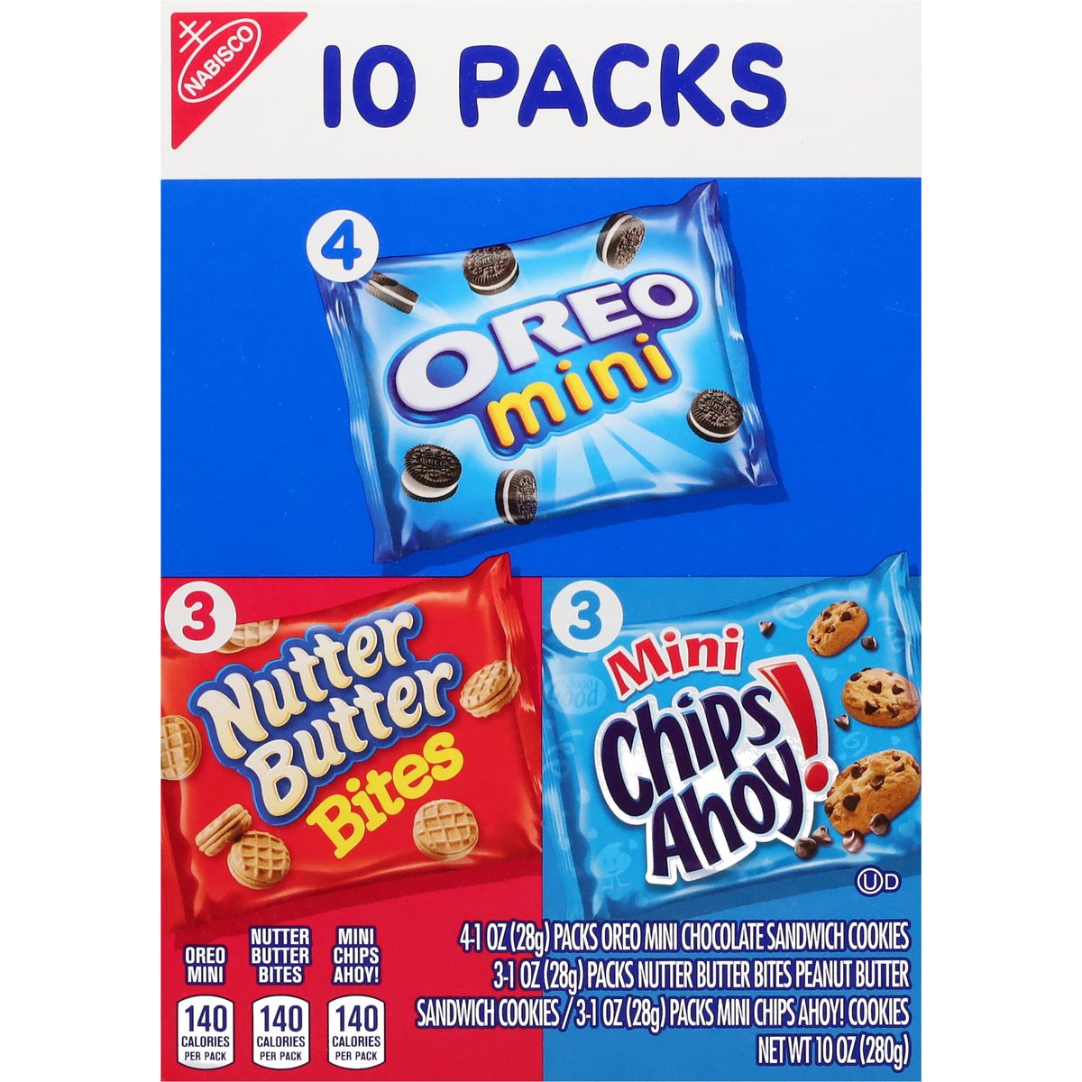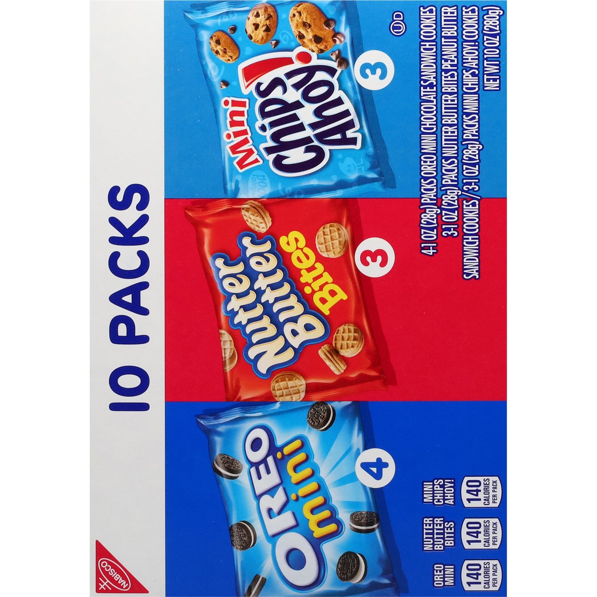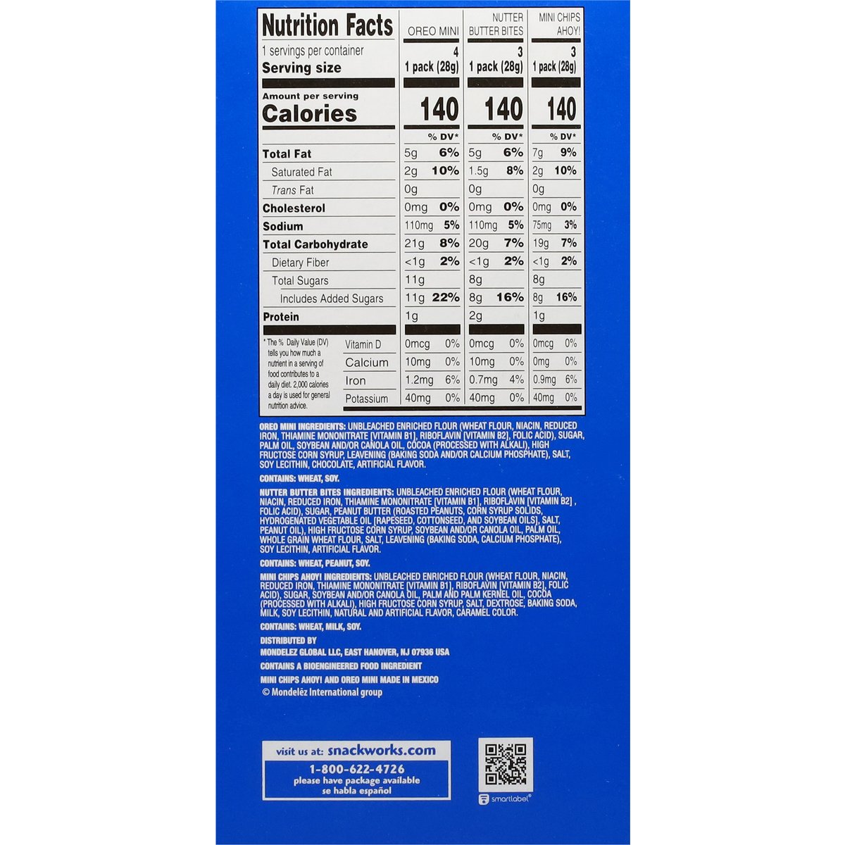 Oreo Mini: 140 calorie per pack. Nutter Butter Bites: 140 calories pack. Mini chips ahoy!: 140 calories pack. Contains a bioengineered food ingredient. Nabisco! Big Chewy Chips Ahoy! how2recycle.info. SmartLabel. Visit us at: snackworks.com. 1-800-622-4726. Please have package available. Try These Packs: 20 Packs: 5 oreo mini; 5 ritz bits; 5 nutter butter bites; 5 mini chips ahoy! 30 Packs: 10 chips ahoy!; 10 oreo; 10 oreo golden. Mini Chips Ahoy! and Oreo Mini Made in Mexico.