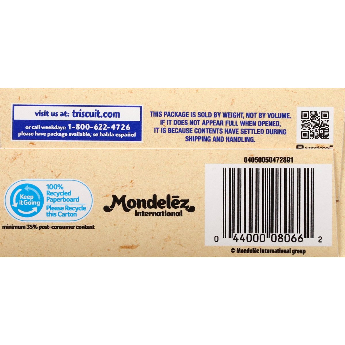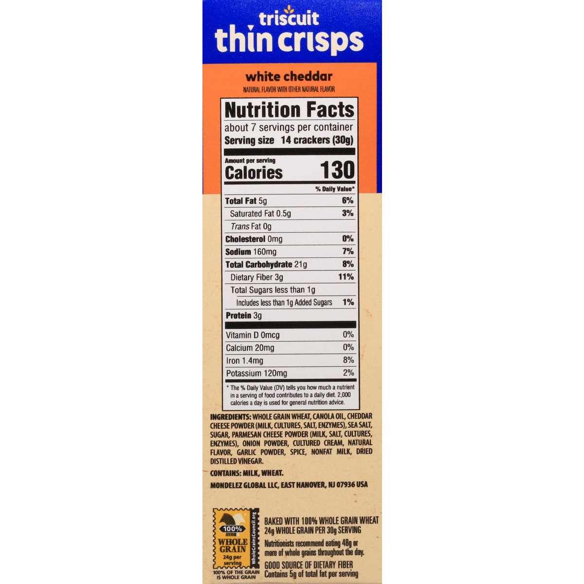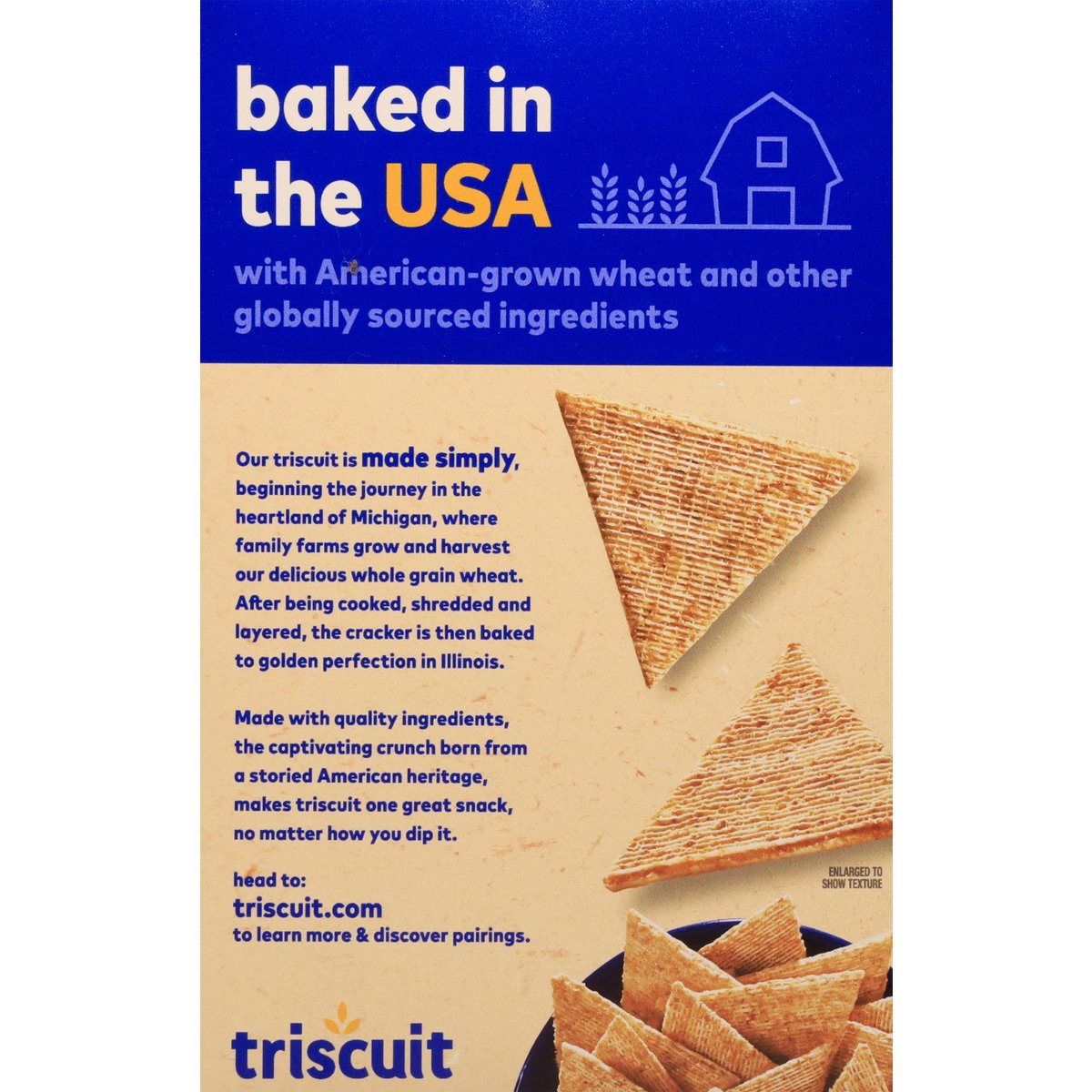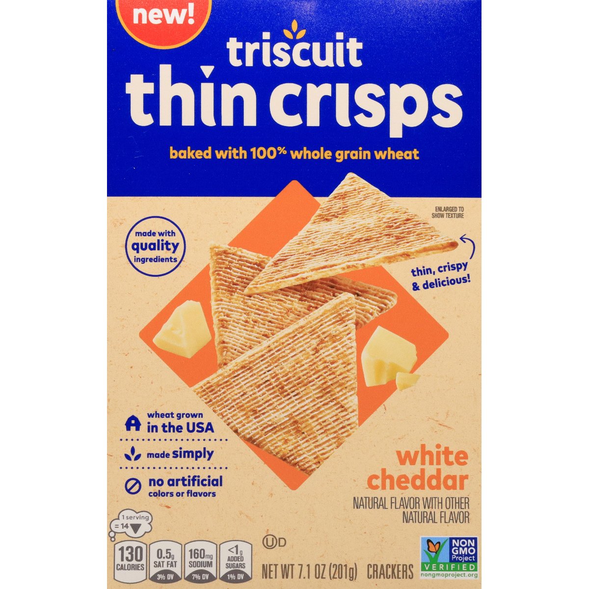 Baked with 100% whole grain wheat. No artificial colors or flavors. Natural flavor with other natural flavor. 1 serving = 14: 130 calories; 0.5 g sat fat (3% DV); 160 mg sodium (7% DV); <1 g total sugars (1% DV). 100% Whole Grain: 24 g per serving. 100% of the grain is whole grain. WholeGrainsCouncil.org. Baked with 100% whole grain wheat 24 g whole grain per 30 g serving. Nutritionists recommend eating 48 g or more of whole grains throughout the day. Good source of dietary fiber. Contains 5 g of total fat per serving. Non-GMO Project verified. nongmoproject.org. New! Thin, crispy & delicious! Made simply. Our Triscuit is made simply, beginning the journey in the heartland of Michigan, where family farms grow and harvest our delicious whole grain wheat. After being cooked, shredded and layered, the cracker is then baked to golden perfection in Illinois. Made with quality ingredients, the captivating crunch born from a storied American heritage, makes Triscuit one great snack, no matter how you dip it. This package is sold by weight, not by volume. If it does not appear full when opened, it is because contents have settled during shipping and handling. triscuit.com. SmartLabel. Head to: triscuit.com to learn more & discover pairings. Visit us at: triscuit.com or call weekdays: 1-800-622-4726 please have package available. Keep it Going: 100% recycled paperboard. Please recycle this carton. Minimum 35% post-consumer content. Wheat grown in the USA. Baked in the USA with American-grown wheat and other globally sourced ingredients.