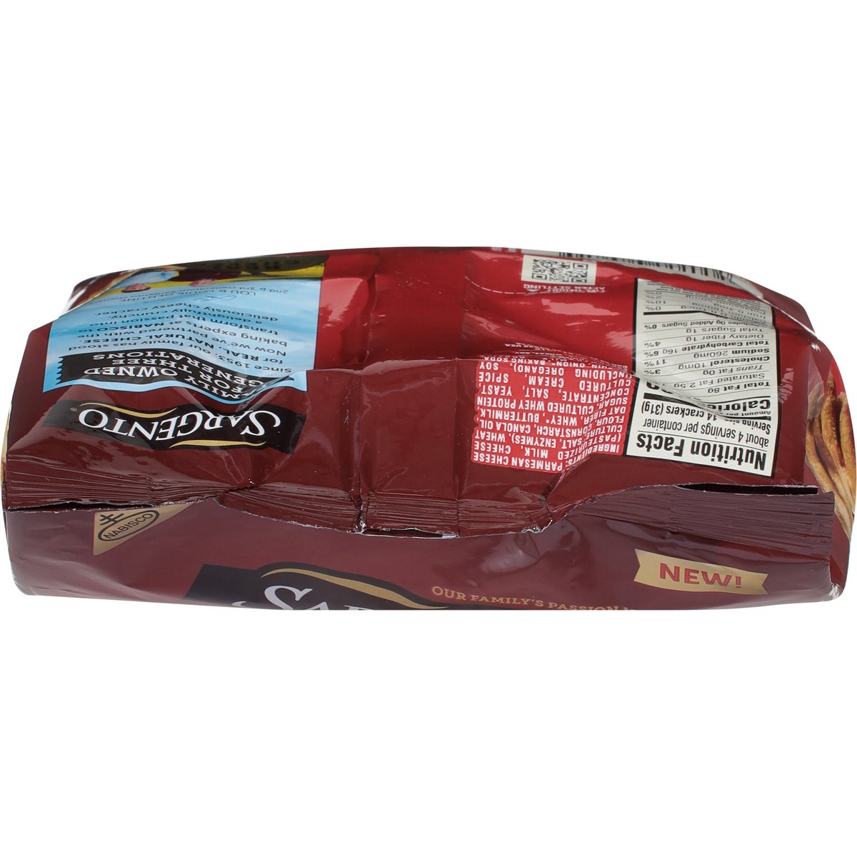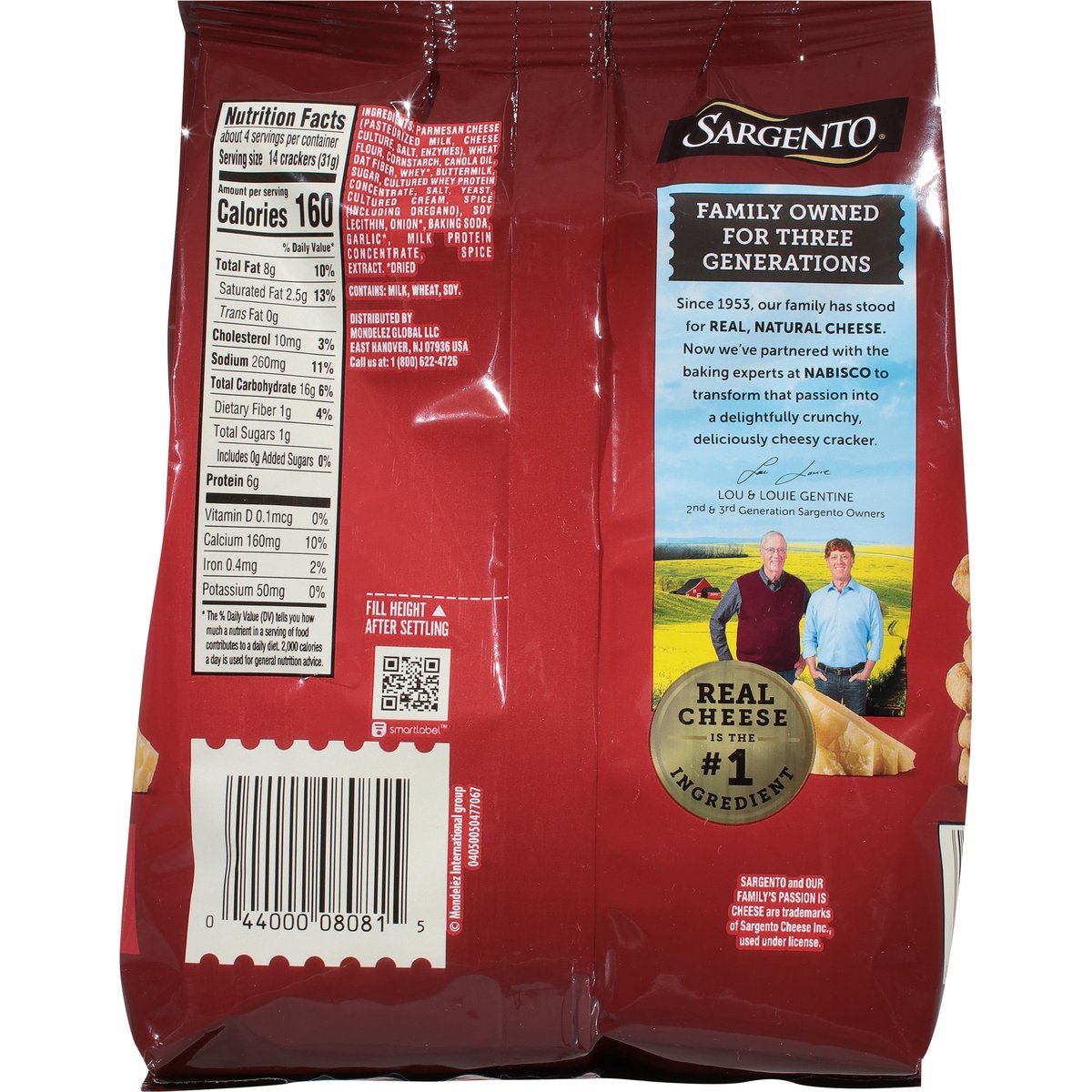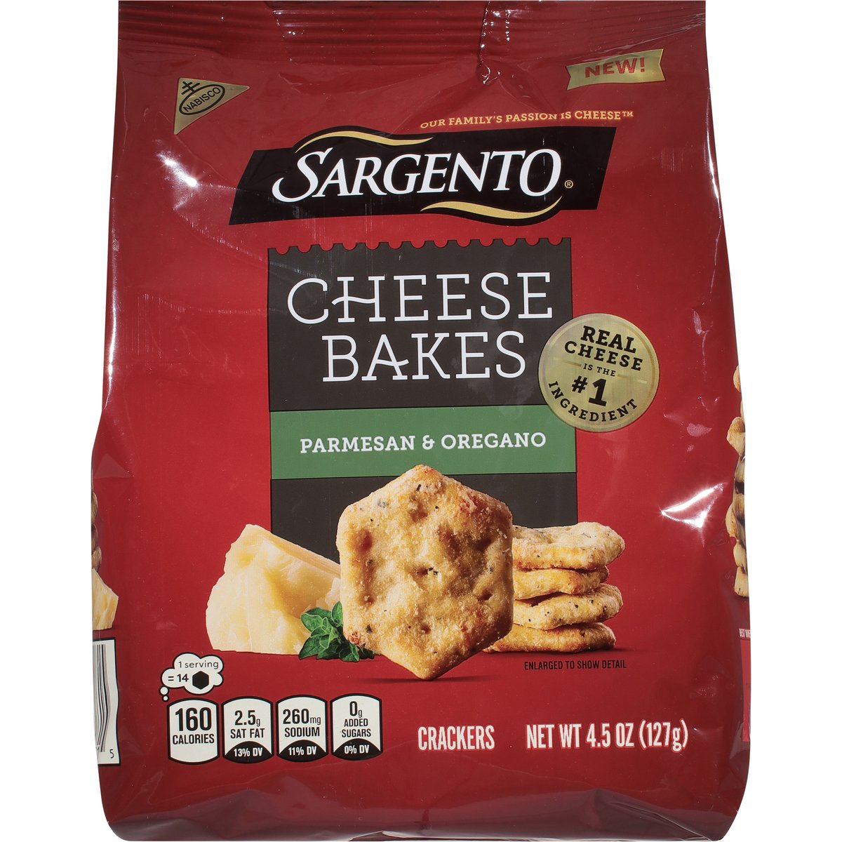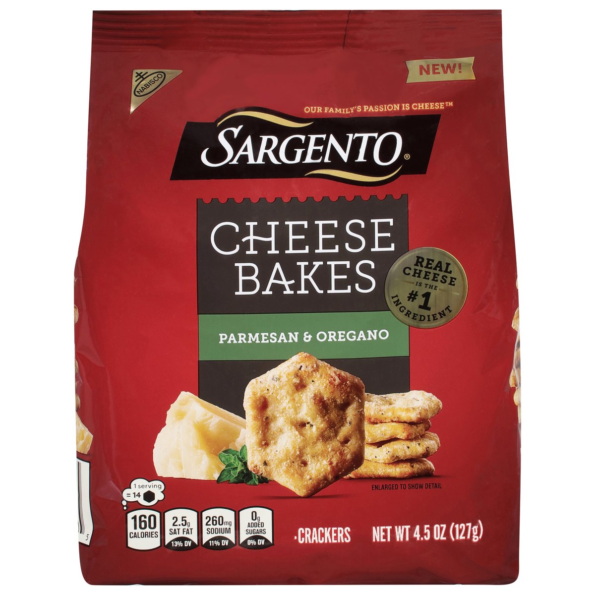 1 Serving = 14: 160 calories; 2.5 g sat fat (13%DV); 260 mg sodium (11% DV) 0 g added sugars (0% DV). New!. Our family's passion is cheese. Family owned for three generations. Since 1953, our family has stood for real, natural cheese. Now we've partnered with the baking experts at Nabisco to transform that passion into a delightfully crunchy, deliciously cheesy cracker. For Joure. Lou & Louie Gentine 2nd & 3rd generation Sargento owners SmartLabel. Call us at: 1 (800) 622-4726.