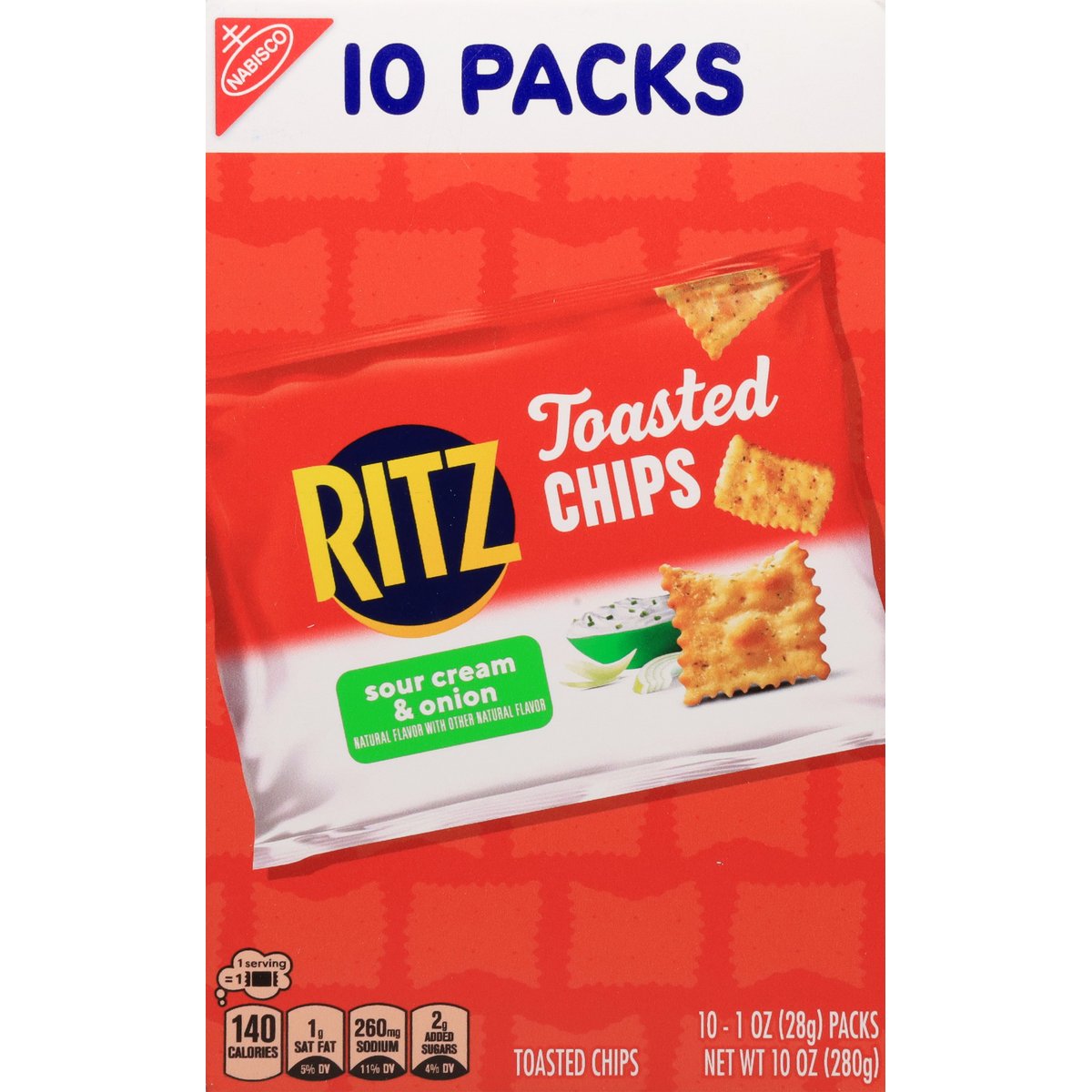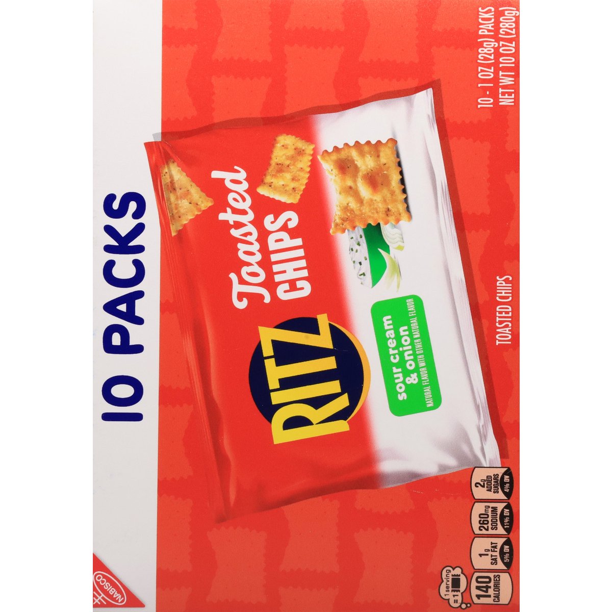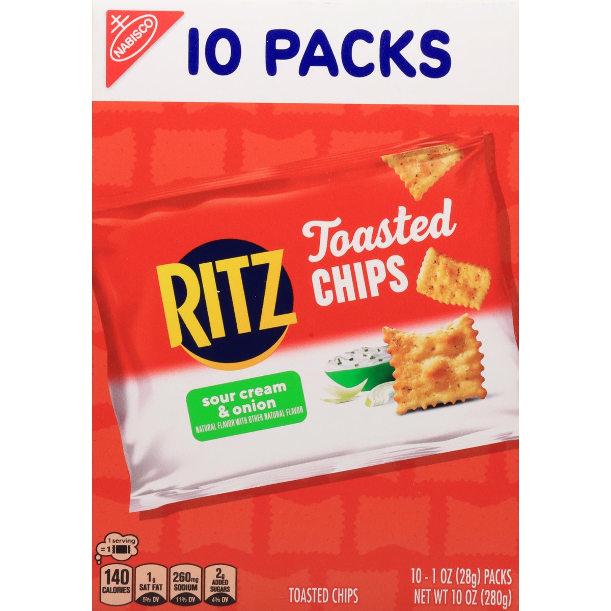 Natural flavor with other natural flavor. 1 Serving = 1: 140 calories; 1 g sat fat (5% DV); 260 mg sodium (11% DV); 2 g added sugars (4% DV). 40% Less fat than the leading regular fried potato chip. Ritz Toasted Chips Sour Cream & Onion have 6 g of fat per 28 g serving compared with 10 g per 28 g serving of the leading regular fried potato chip. Contains a bioengineered food ingredient. Snack time, anytime. how2recycle.info. SmartLabel. Visit us at: ritzcrackers.com 1-800-622-4726 please have package available. Try these packs: Ritz toasted chips original, Ritz toasted chips sour cream & onion.