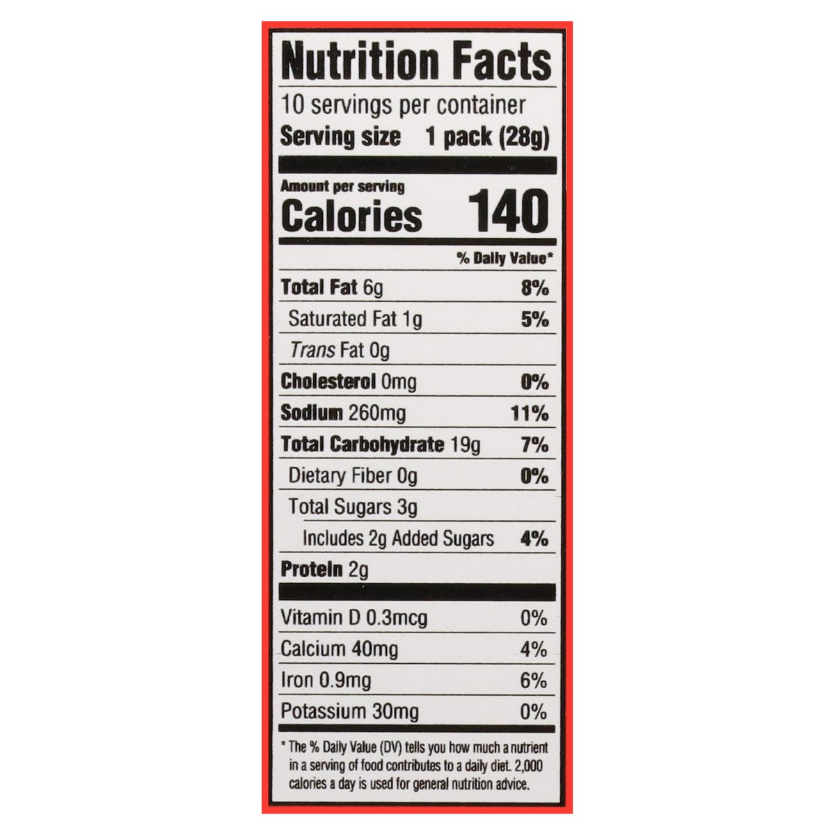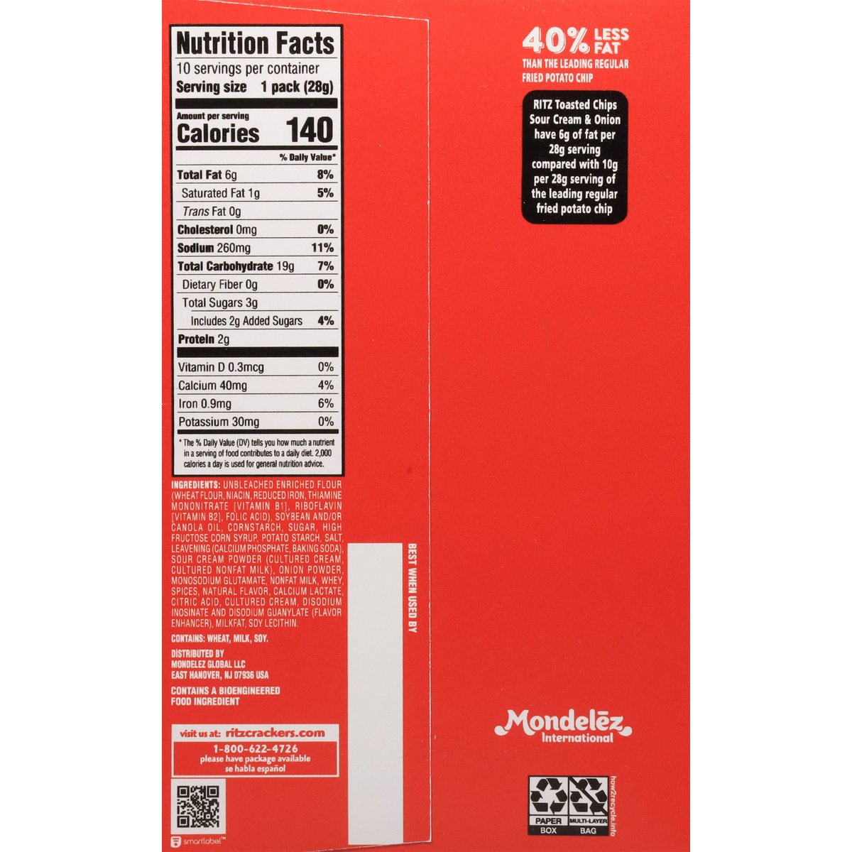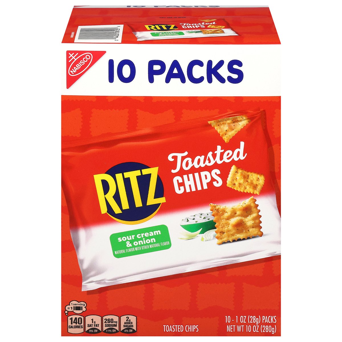 Natural flavor with other natural flavor. 1 Serving = 1: 140 calories; 1 g sat fat (5% DV); 260 mg sodium (11% DV); 2 g added sugars (4% DV). 40% Less fat than the leading regular fried potato chip. Ritz Toasted Chips Sour Cream & Onion have 6 g of fat per 28 g serving compared with 10 g per 28 g serving of the leading regular fried potato chip. Contains a bioengineered food ingredient. Snack time, anytime. how2recycle.info. SmartLabel. Visit us at: ritzcrackers.com 1-800-622-4726 please have package available. Try these packs: Ritz toasted chips original, Ritz toasted chips sour cream & onion.