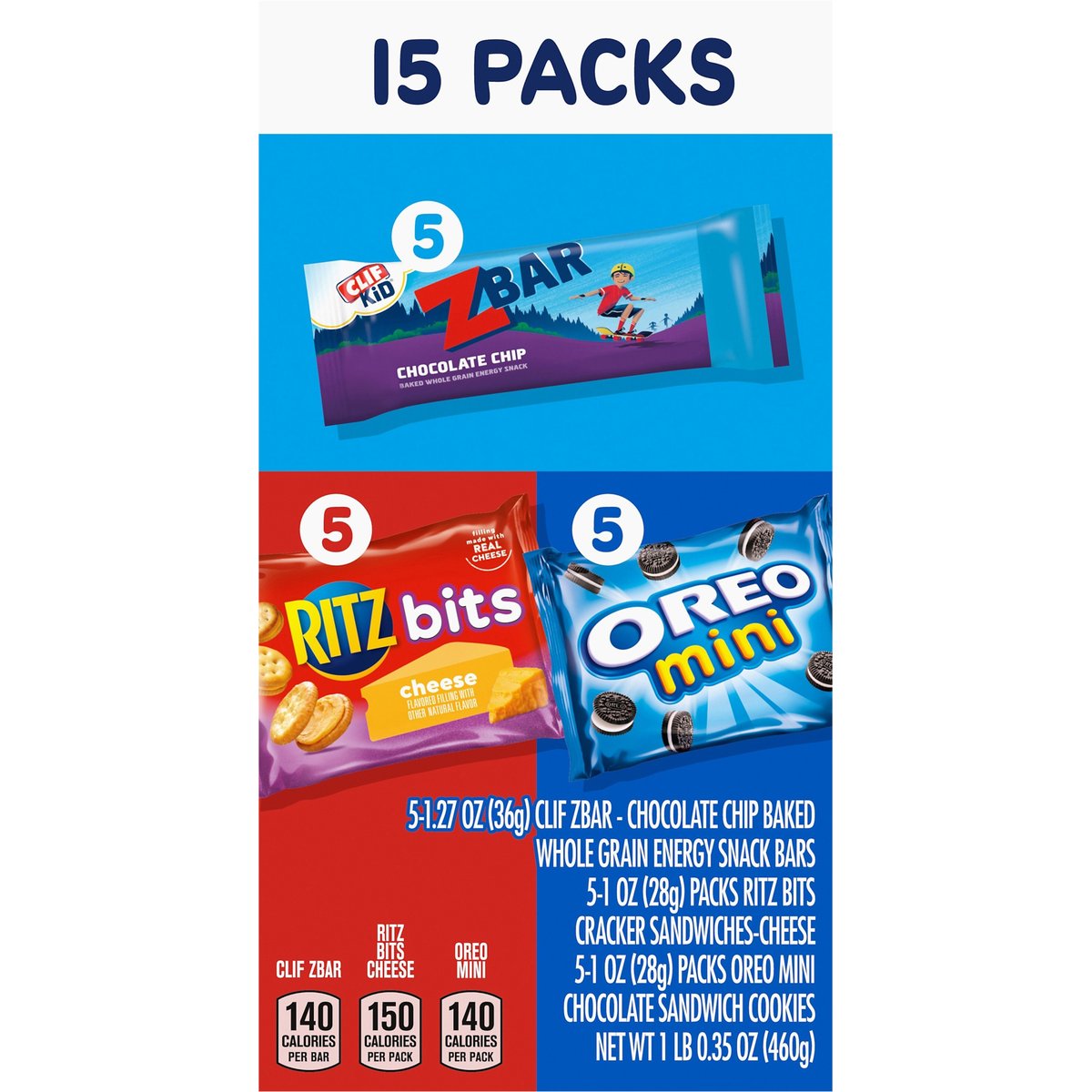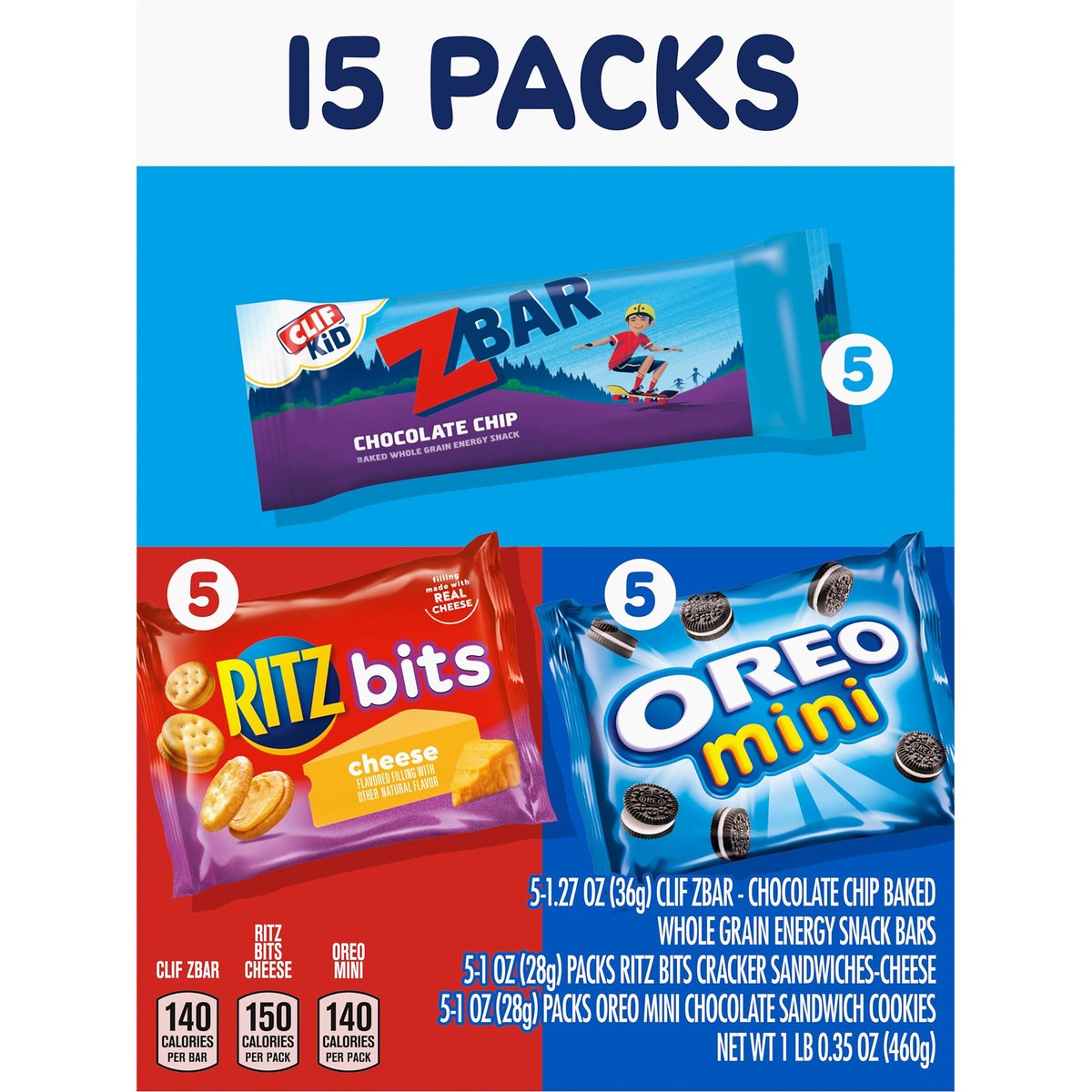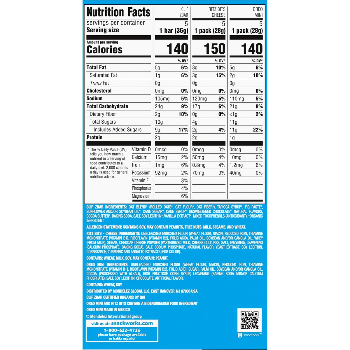 5 Zbar chocolate chip; 5 Ritz bits cheese; 5 Oreo mini. Clif Zbar: 140 calories per pack. Ritz Bits Cheese: 150 calories per pack. Oreo Mini: 140 calories per pack. Clif Zbar Certified Organic by QAI. Oreo mini and Ritz bits contain a bioengineered food ingredient. Clif Zbar: Baked whole grain energy snack. Ritz Bits: Filling made with real cheese. Snack time, anytime. snackworks.com. SmartLabel. Visit us at: snackworks.com. 1-800-622-4726. Please have package available. Try These Packs: 20 Packs: 5 Oreo mini; 5 Ritz bits; 5 Nutter Butter bites; 5 Mini chips ahoy! Zbar iced oatmeal cookie. Oreo Mini Made in Mexico.