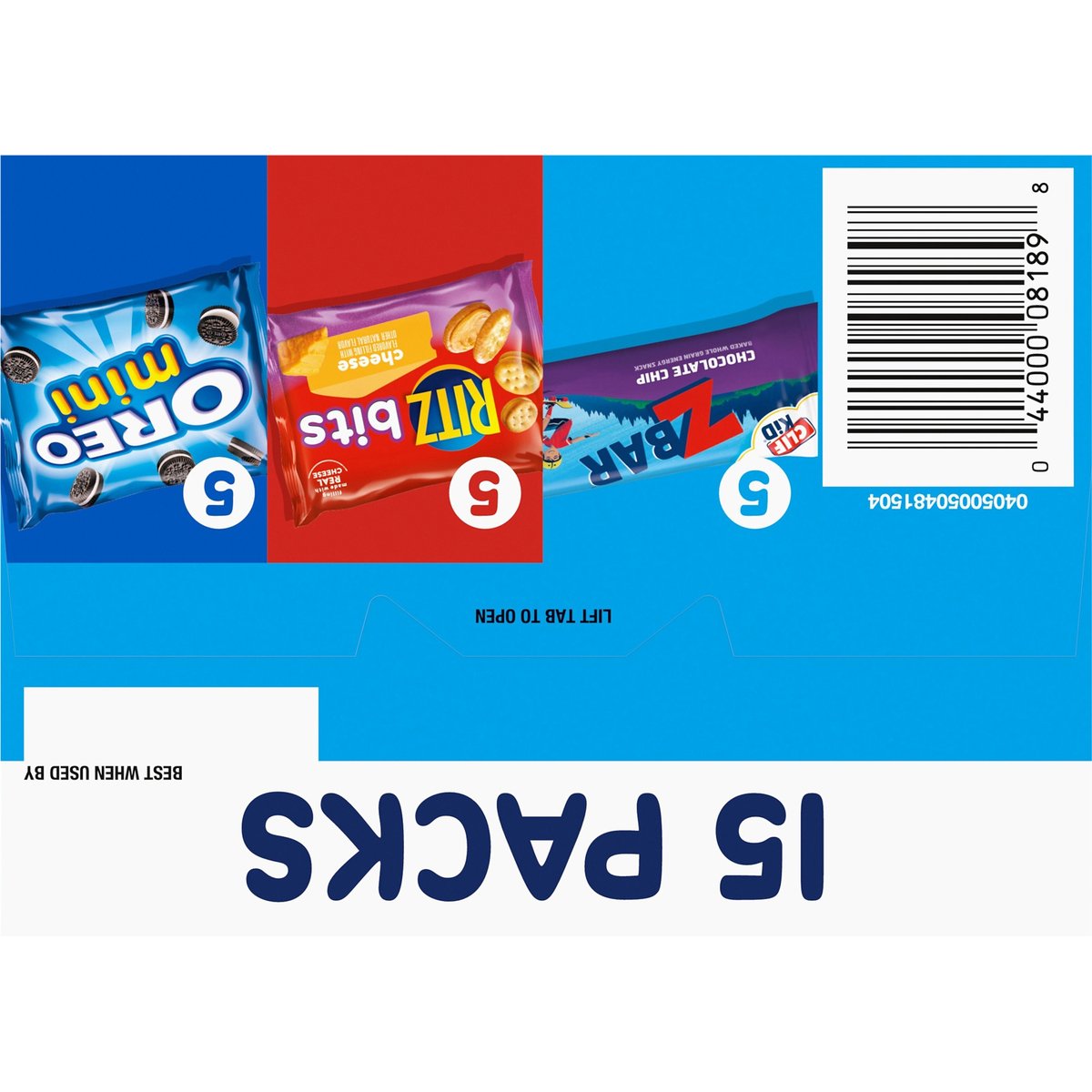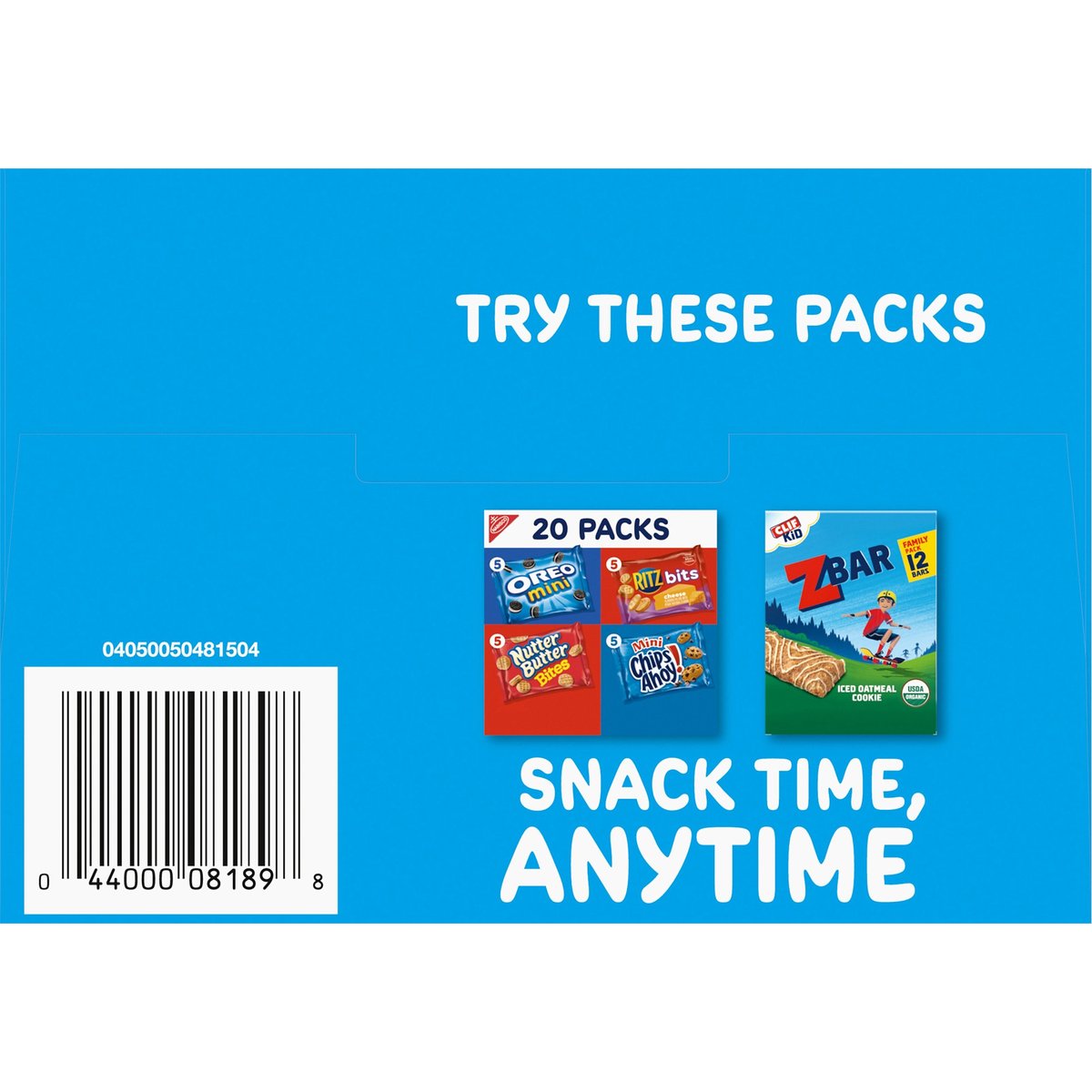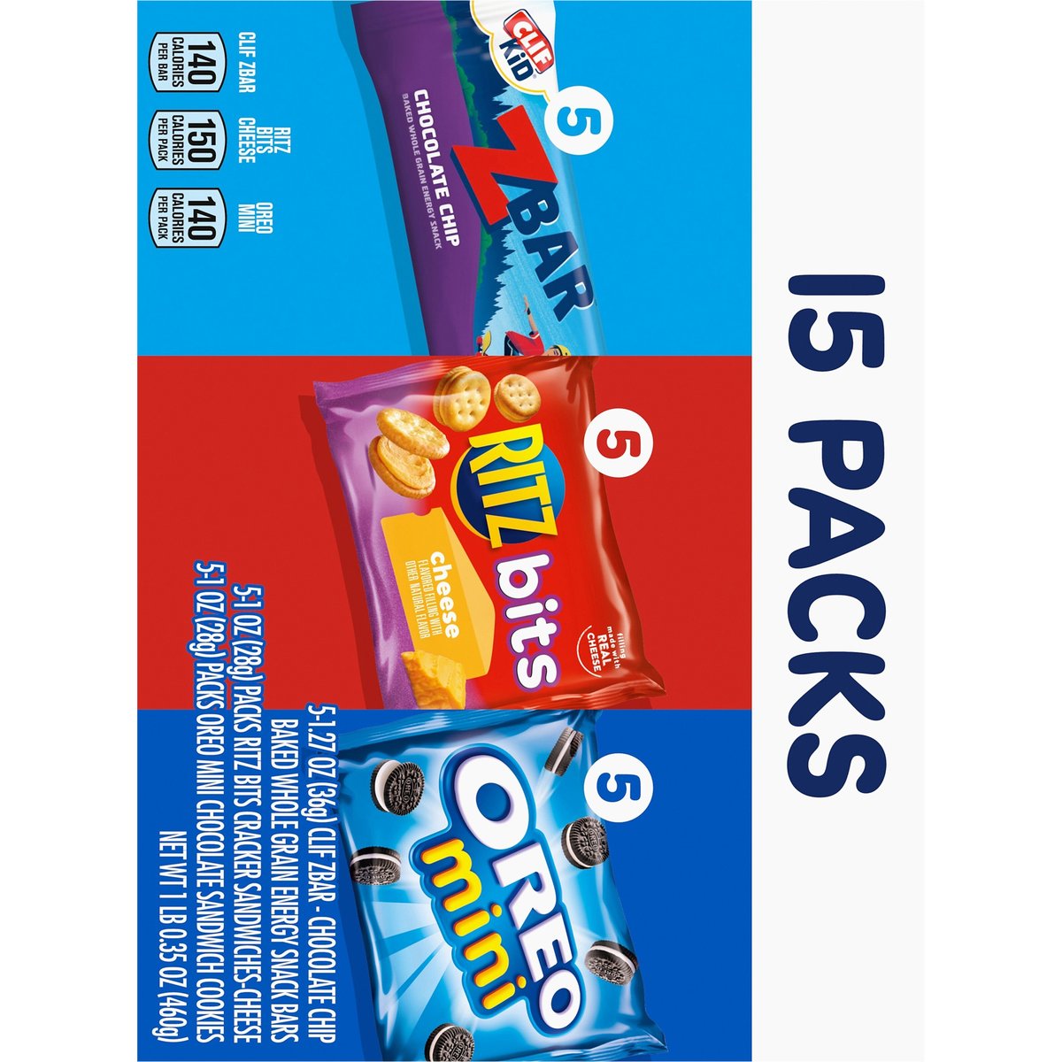 5 Zbar chocolate chip; 5 Ritz bits cheese; 5 Oreo mini. Clif Zbar: 140 calories per pack. Ritz Bits Cheese: 150 calories per pack. Oreo Mini: 140 calories per pack. Clif Zbar Certified Organic by QAI. Oreo mini and Ritz bits contain a bioengineered food ingredient. Clif Zbar: Baked whole grain energy snack. Ritz Bits: Filling made with real cheese. Snack time, anytime. snackworks.com. SmartLabel. Visit us at: snackworks.com. 1-800-622-4726. Please have package available. Try These Packs: 20 Packs: 5 Oreo mini; 5 Ritz bits; 5 Nutter Butter bites; 5 Mini chips ahoy! Zbar iced oatmeal cookie. Oreo Mini Made in Mexico.