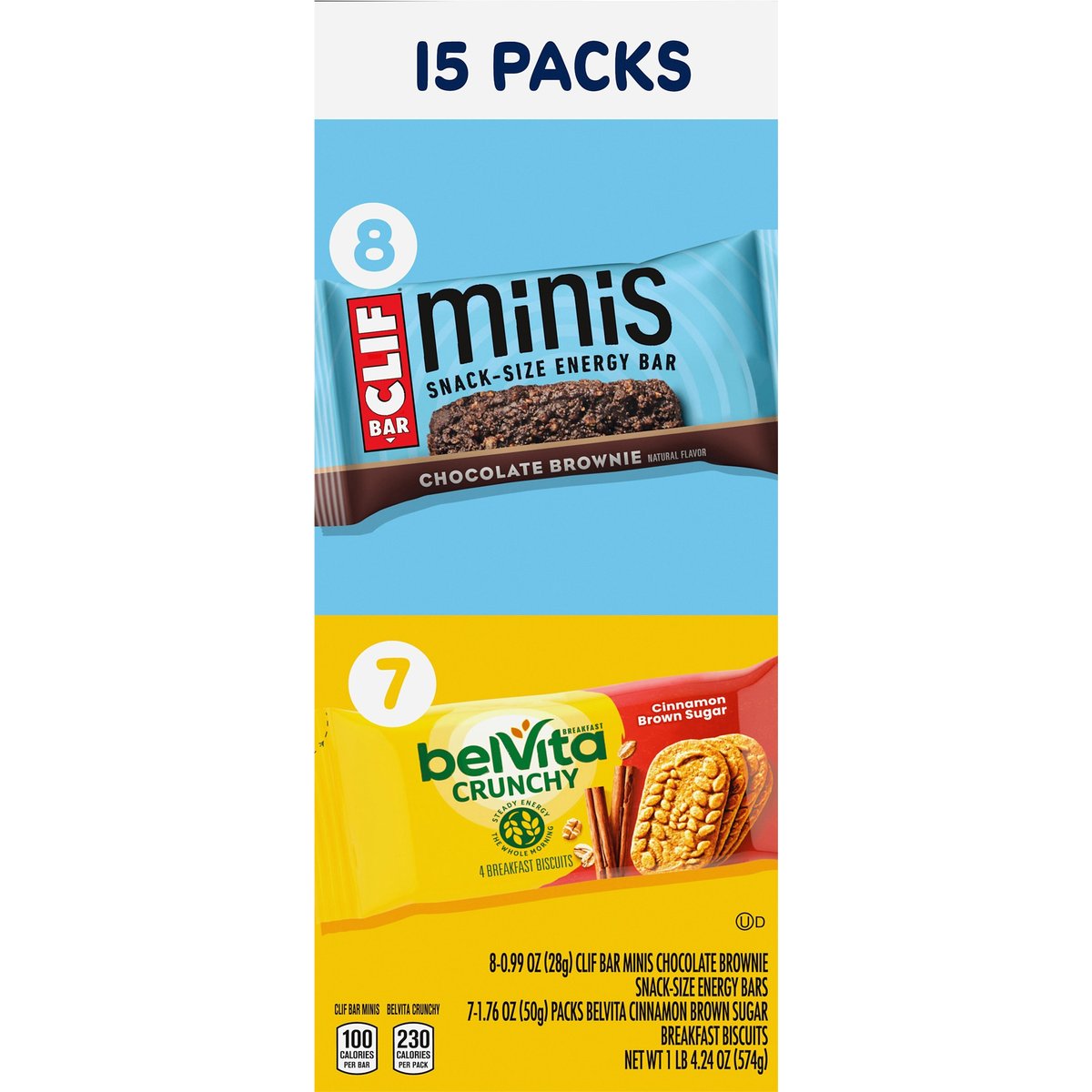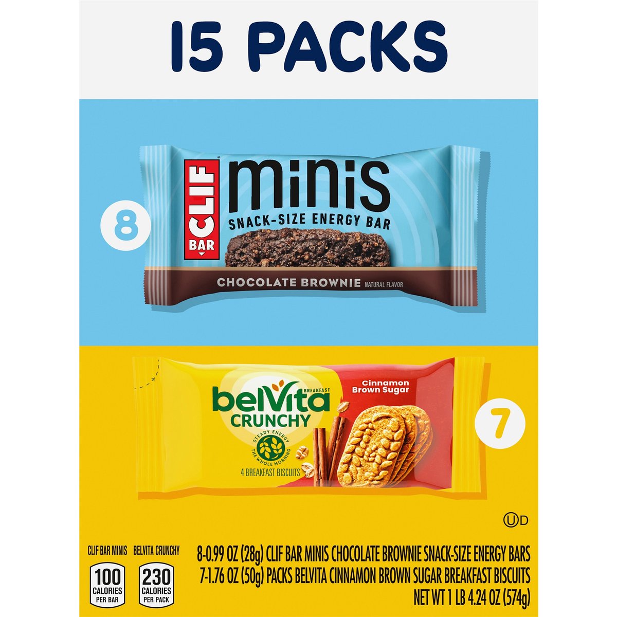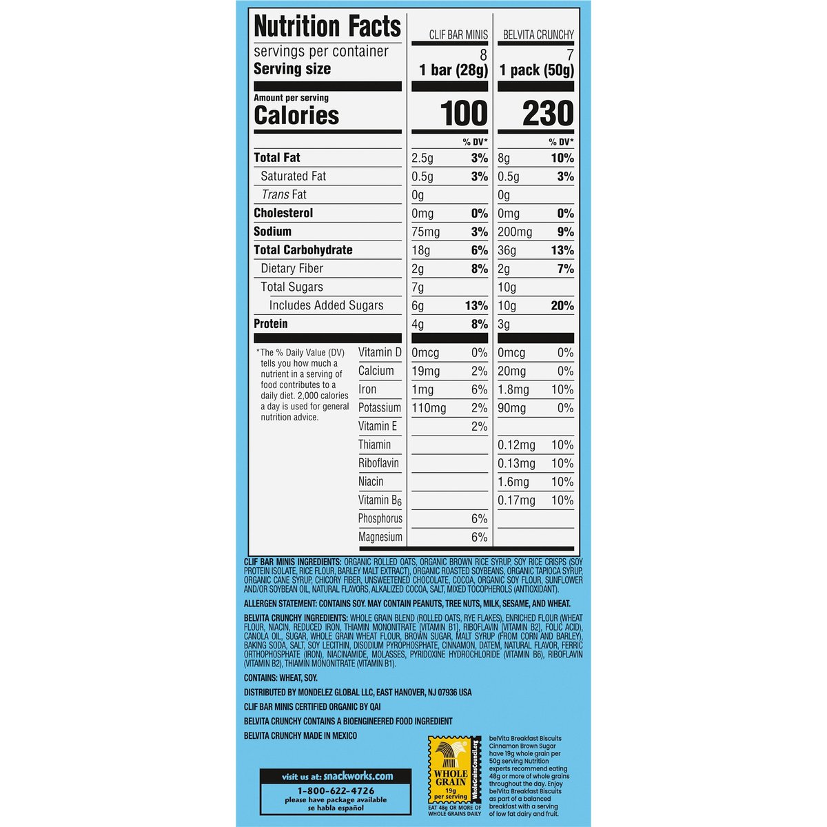 8-0.99 oz (28 g) Clif Bar Minis Chocolate Brownie Snack-size Energy Bars. 7-1.76 oz (50 g) Packs Belvita Cinnamon Brown Sugar Breakfast Biscuits. Clif Bar Minis Chocolate Brownie: Natural flavor. Clif Bar Minis: 100 calories per bar. Belvita Crunchy: 230 calories per pack. Clif Bar Minis: Look for whole grains. WholeGrainCouncil.org. Belvita Crunchy: Look for whole grains. WholeGrainCouncil.org. Belvita Crunchy: Contains a bioengineered food ingredient. Belvita Crunchy: Steady energy the whole morning. Snack time, anytime. snackworks.com. SmartLabel. Visit us at: snackworks.com. 1-800-622-4726. Please have package available. Try These Packs: Mini chocolate chip; breakfast biscuits. Belvita Crunchy Made in Mexico.