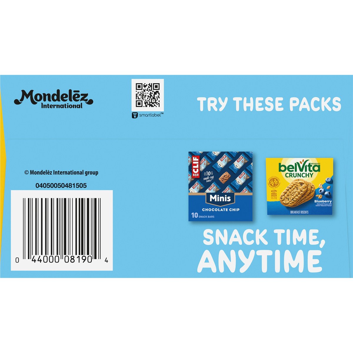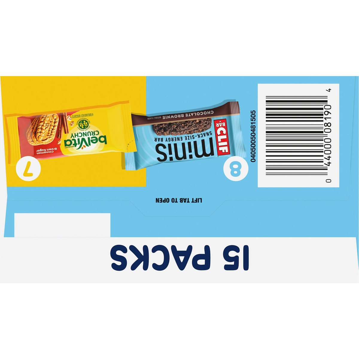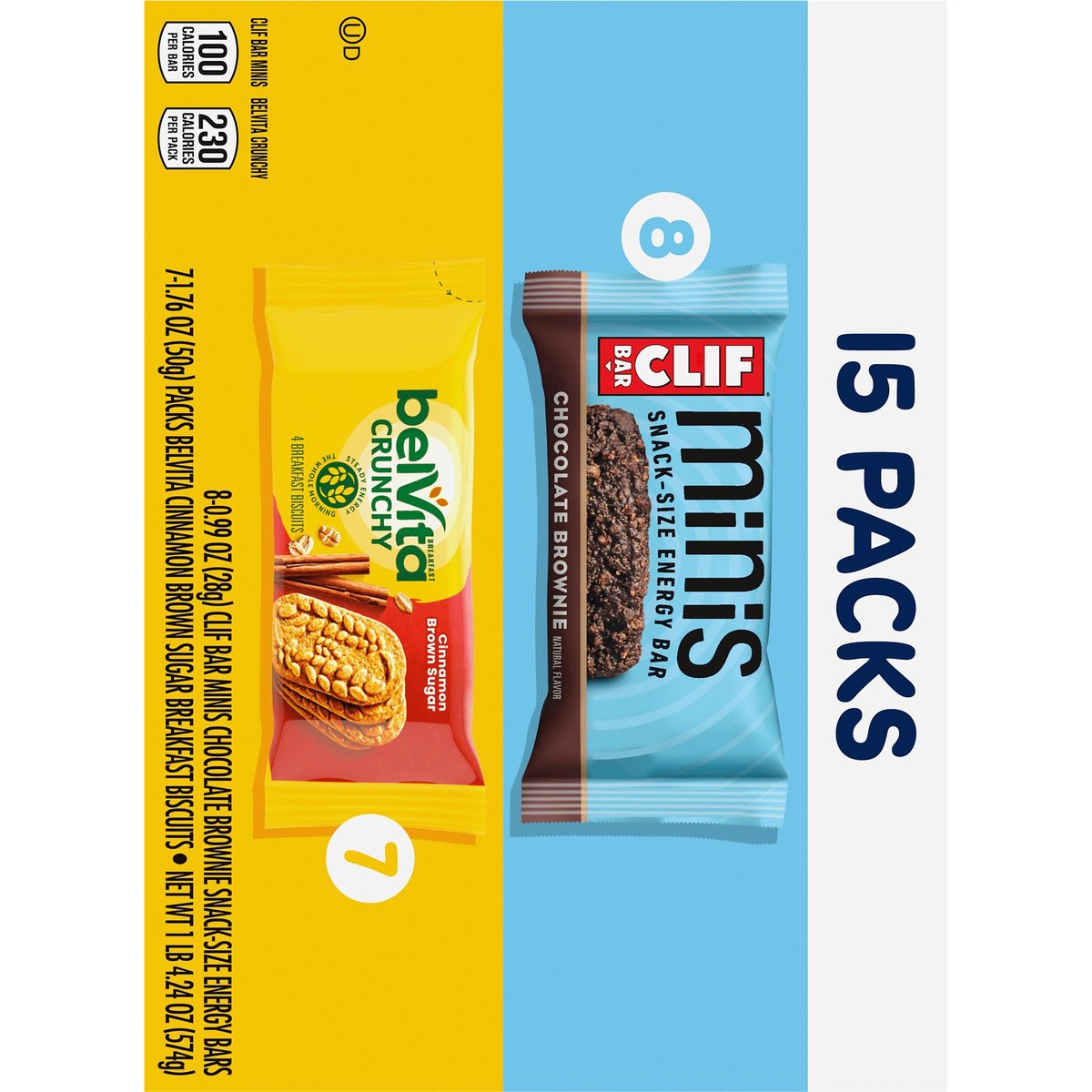 8-0.99 oz (28 g) Clif Bar Minis Chocolate Brownie Snack-size Energy Bars. 7-1.76 oz (50 g) Packs Belvita Cinnamon Brown Sugar Breakfast Biscuits. Clif Bar Minis Chocolate Brownie: Natural flavor. Clif Bar Minis: 100 calories per bar. Belvita Crunchy: 230 calories per pack. Clif Bar Minis: Look for whole grains. WholeGrainCouncil.org. Belvita Crunchy: Look for whole grains. WholeGrainCouncil.org. Belvita Crunchy: Contains a bioengineered food ingredient. Belvita Crunchy: Steady energy the whole morning. Snack time, anytime. snackworks.com. SmartLabel. Visit us at: snackworks.com. 1-800-622-4726. Please have package available. Try These Packs: Mini chocolate chip; breakfast biscuits. Belvita Crunchy Made in Mexico.