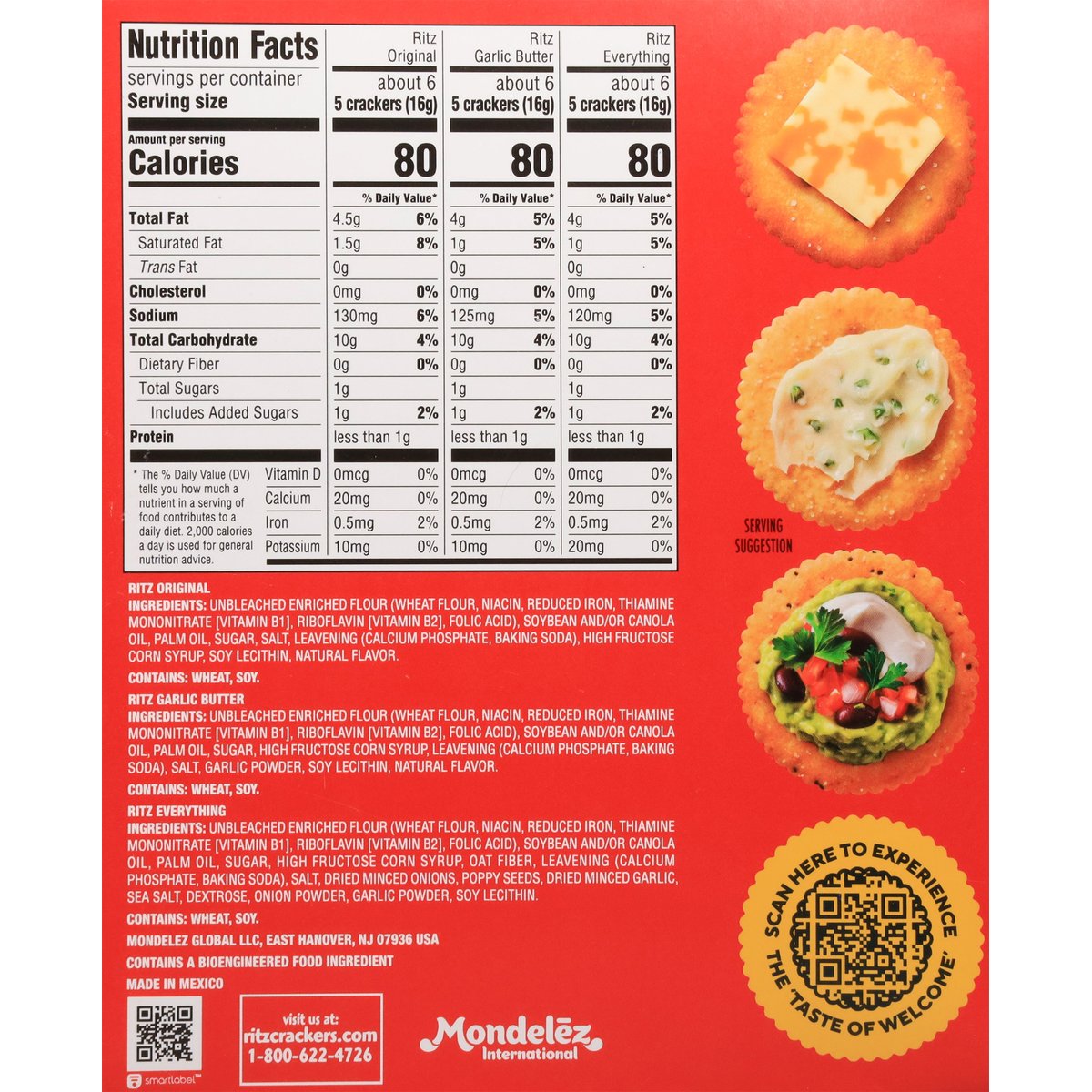 3 Flavors Variety: The Original; Garlic Butter; Everything: Baked with onion, poppy seeds, garlic & sea salt. Garlic Butter: Naturally flavored. Ritz Original: 80 calories per 5 crackers. Ritz Garlic Butter: 80 calories per 5 crackers. Ritz Everything: 80 calories per 5 crackers. Contains a bioengineered food ingredient. Perfect for tasty versatility. Ritz crackers are perfect for any snacking occasion. SmartLabel. Scan to experience the taste of welcome. Visit us at: ritzcrackers.com. 1-800-622-4726. Made in Mexico.