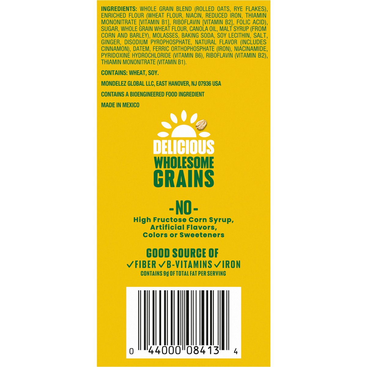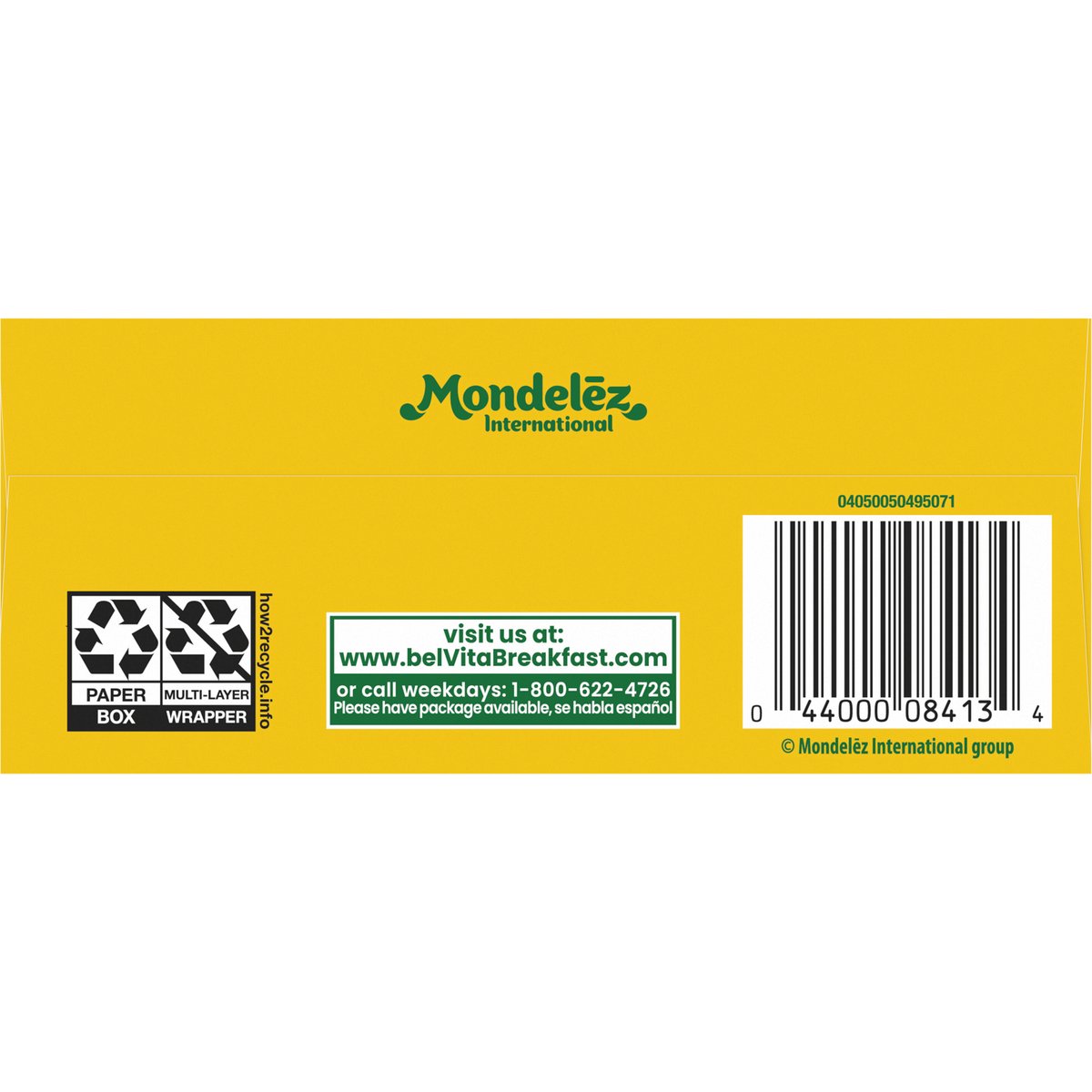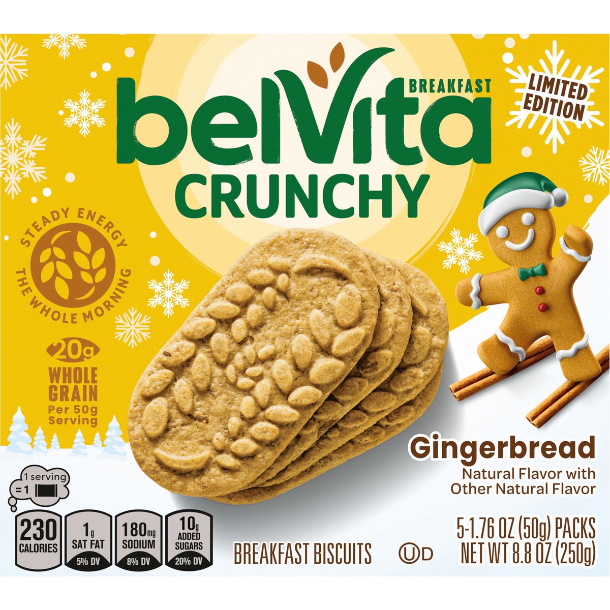 Limited Edition Natural flavor with other natural flavor. No high fructose corn syrup, artificial flavors, colors or sweeteners. 1 Serving = 1 Pouch: 230 calories; 1 g sat fat (5% DV); 180 mg sodium (8% DV); 10 g added sugars (20% DV). Contains 9 g of total fat per serving. 20 g whole grain per 50 g serving. Whole Grain 20 g per serving. Eat 28 g or more of whole grains daily. wholegrainscouncil.org. belVita Breakfast Biscuits Gingerbread have 20 g whole grain per 50 g serving. Nutrition experts recommend eating 48g or more of whole grains throughout the day. Enjoy belVita Breakfast Biscuits as part of a balanced breakfast with a serving of low fat dairy and fruit. Good source of fiber, B-vitamins, iron. Contains a bioengineered food ingredient. Steady energy the whole morning. Gingerbread is here to spread some festive cheer! Belvita Breakfast Biscuits are a delicious, convenient breakfast choice, baked with selected wholesome grains. They contain slow-release carbs that break down gradually in the body, to deliver delicious, steady energy all morning long. Delicious wholesome grains. www.belvitabreakfast.com. how2recycle.info. SmartLabel. Check out the rest of the family belVita family. Instagram: @belVita. Visit Us at: www.belvitabreakfast.com or call Weekdays: 1-800-622-4726. Please have package available. Made in Mexico.