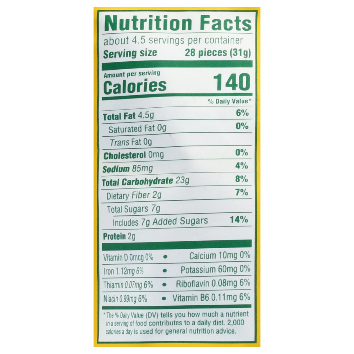 Natural flavor with other natural flavor. 1 Serving = 28: 140 calories; 0 g sat fat (0% DV); 85 mg sodium (4% DV); 7 g added sugars (14% DV). 13 g whole grain per 31 g serving. Whole Grain: 13 g per serving. Eat 48 g or more of whole grains daily. 13 g whole grain per 31 g serving. Nutrition experts recommend eating 48 g or more of whole grains throughout the day. Contains a bioengineered food ingredient. No high fructose corn syrup. No artificial flavors, colors or sweeteners. Re-fuel your morning with on-the-go snacking. belVita Crunchy Bites are a tasty morning snack, baked with whole grains and delicious blueberries! Great for busy mornings, these bites are an enjoyable snack wherever the morning takes you. Fill height after settling. This package is sold by weight, not by volume. Packed as full as practicable by modern automatic equipment, it contains full net weight indicated. If it does not appear full when opened, it is because contents have settled during shipping and handling. www.belVitaBreakfast.com. how2recycle.info. SmartLabel. Visit us at: www.belVitaBreakfast.com or call weekdays: 1-800-622-4726 Please have package available. Resealable for on-the-go snacking.