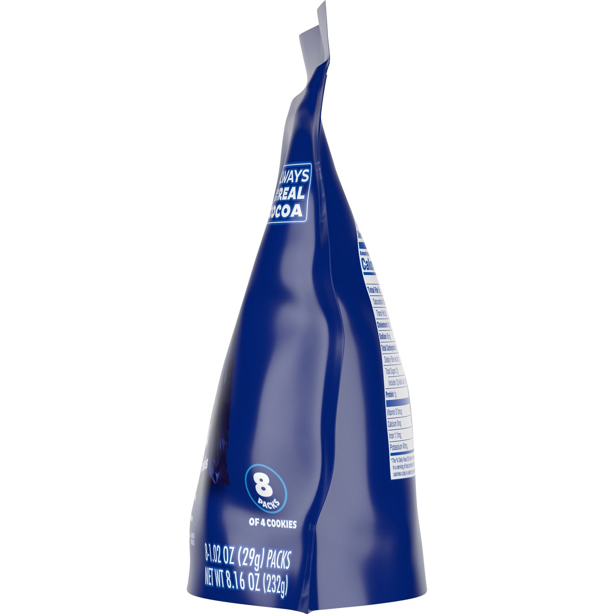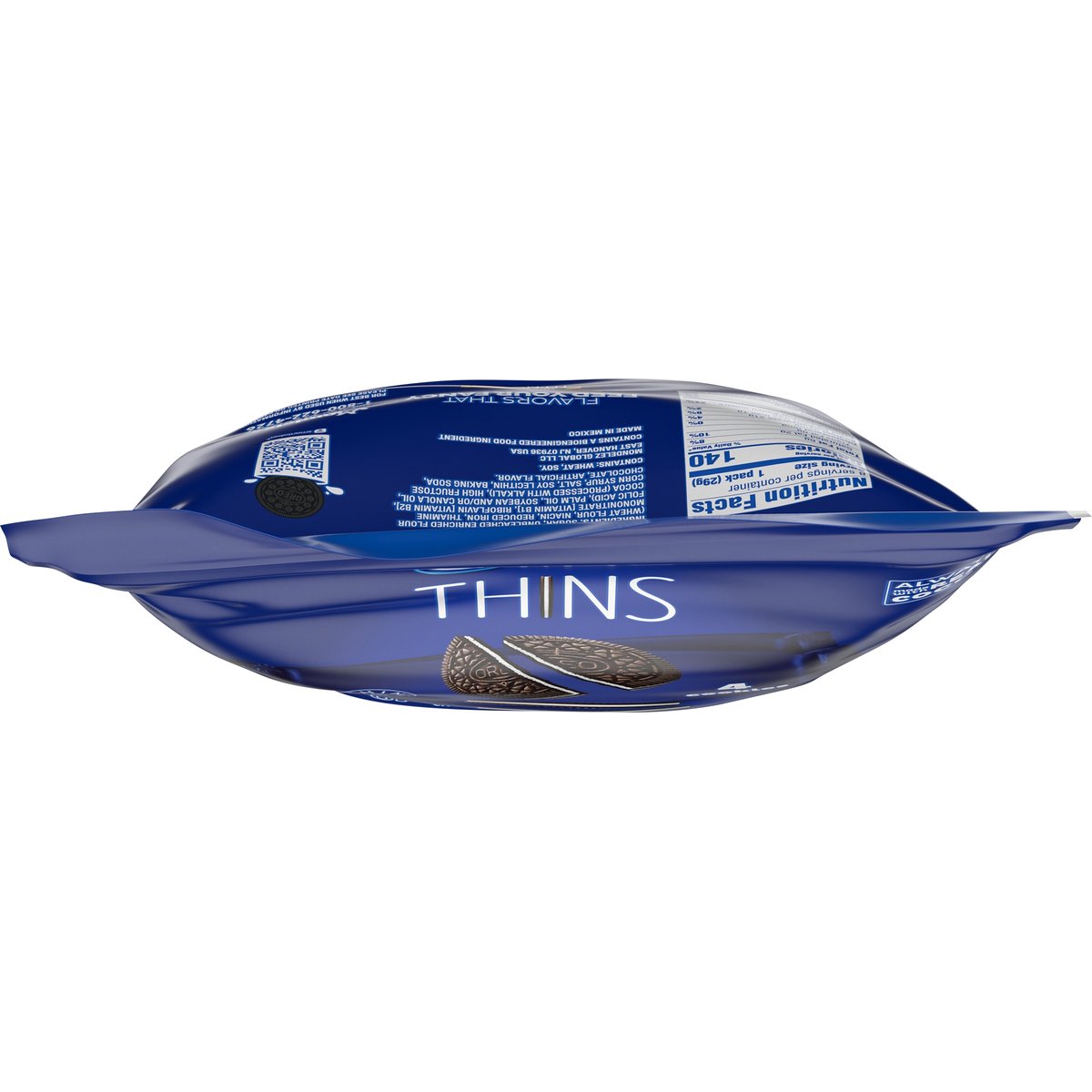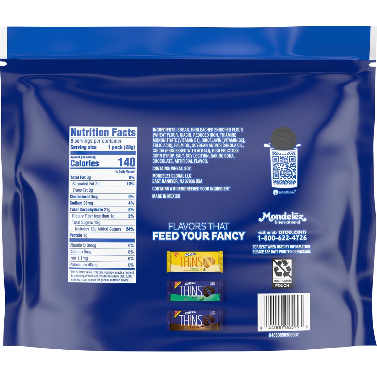 1 Serving = 1: 140 calories; 2 g sat fat (10% DV); 95 mg sodium (4% DV); 12 g added sugars (24% DV). Contains a bioengineered food ingredient. Thin & crispy. how2recycle.info. oreo.com SmartLabel. Visit us at: oreo.com. 1-800-622-4726. Flavors that feed you fancy. Cookie lemon. Cookie mint. Cookie tiramisu. Made in Mexico.