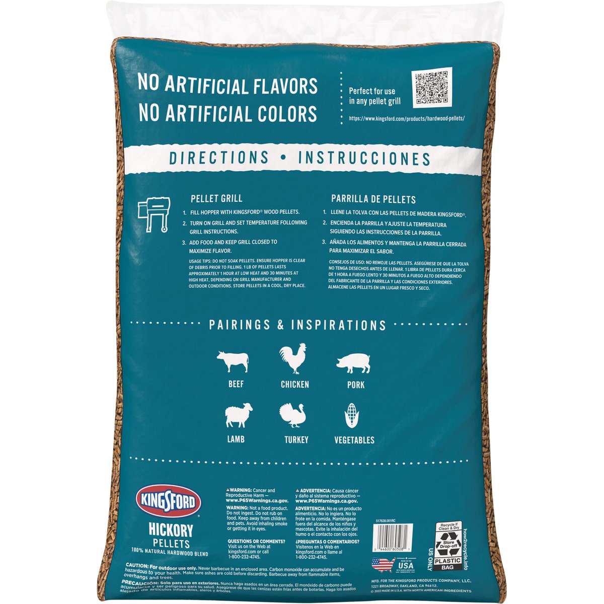100% natural hardwood blend. Great smoke flavor. No artificial flavors. America's grilling expert. No additive fillers. Excellent performance in all pellet grills. Pairings & inspirations. Beef. Chicken. Pork. Lamb. turkey. Vegetables. kingsford.com. how2recycle.info. Perfect for use in any pellet grill. https://www.kingsford.com/product/hardwood-pellets/. Questions or comments? visit us on the web at kingsford.com or call 1-800-232-4745. Made in the USA with North American ingredients.