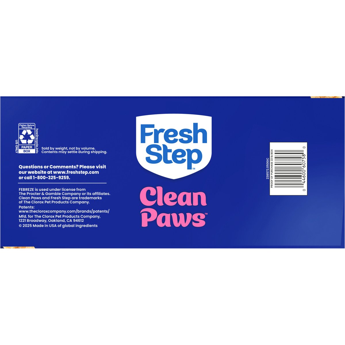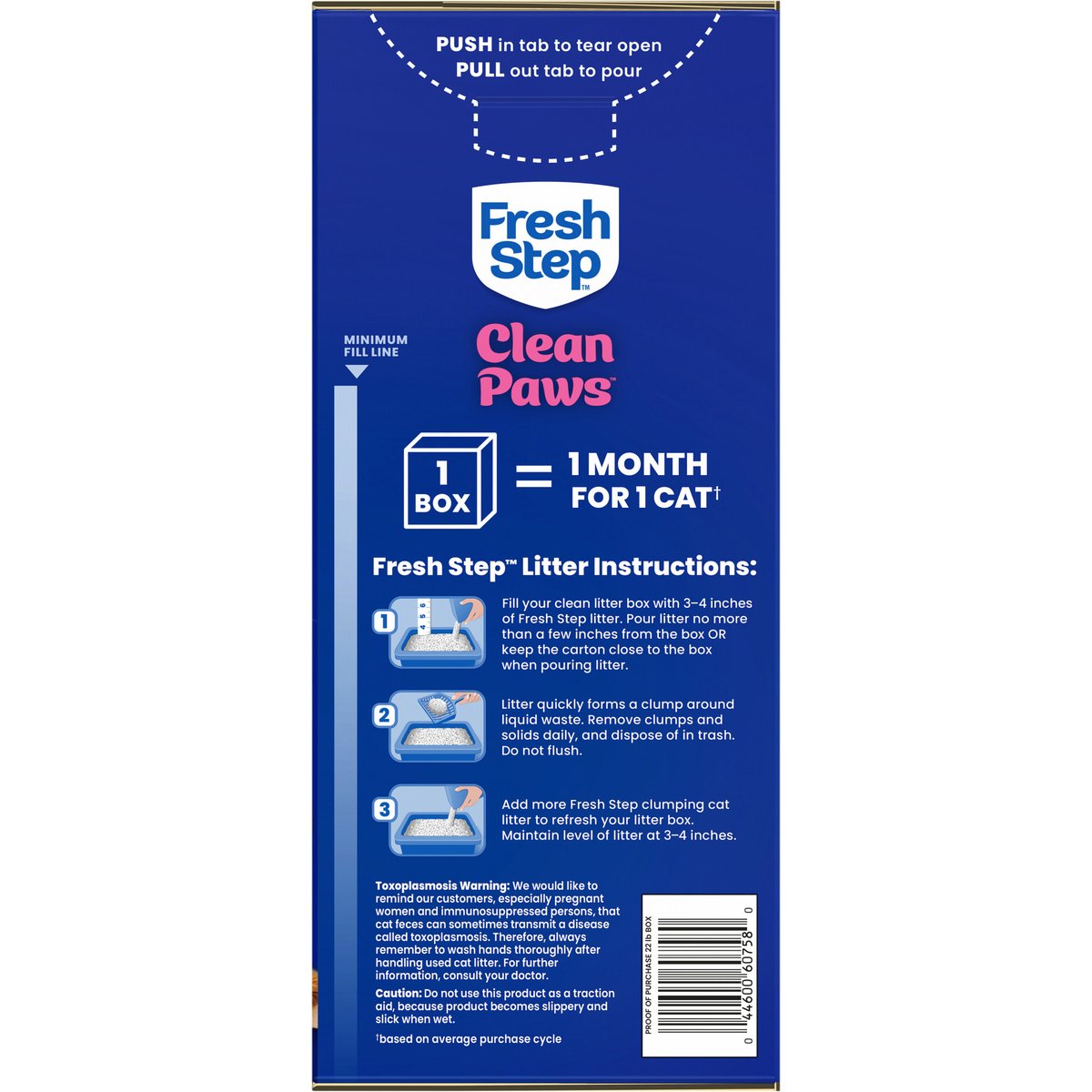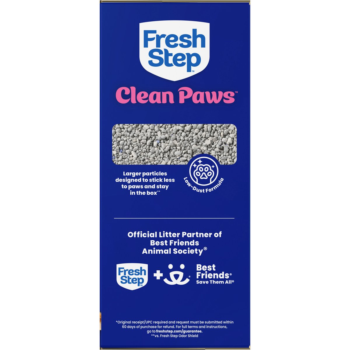 Less mess with low dust and low tracking**. Minimum fill line. 1 Box = 1 month for 1 cat(a). Larger particles designed to stick less to paws and stay in the box**. Low-Dust Formula. Official Litter Partner of Best Friends Animal Society. Fresh Step + Best Friends. Save Them All. Sold by weight, not by volume. Contents may settle during shipping. ** Vs. Fresh Step Odor Shield. (a) Based on average purchase cycle. 21 days odor control guaranteed*. * Original receipt/UPC required and request must be submitted within 60 days of purchase for refund. For full terms and instructions, go to freshstep.com/guarantee. how2recycle.info. www.freshstep.com. Questions or Comments? Please visit our website at www.freshstep.com or call 1-800-325-9259. Official Litter Partner of Best Friends Animal Society: Fresh Step + Best Friends: Save Them All. Made in USA of global ingredients.