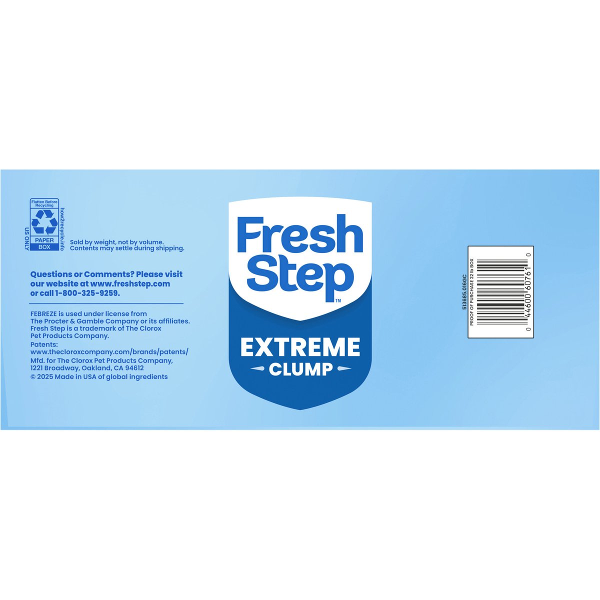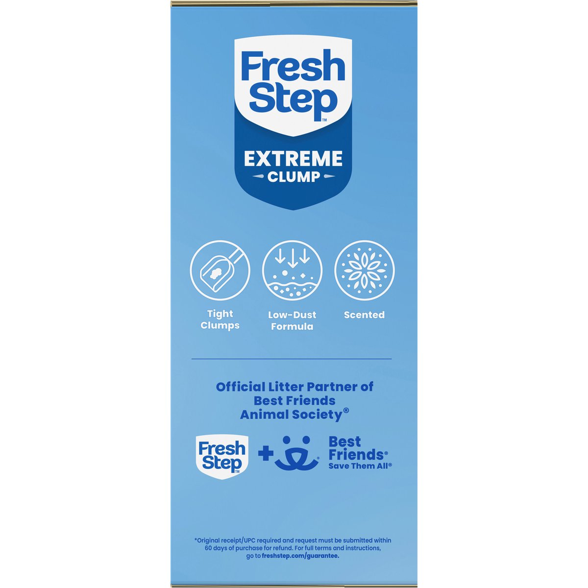 Clumps tight for clean, easy scooping. Tight clumps. Low-dust formula. Scented. Sold by weight, not by volume. Contents may settle during shipping. Odor control 15 days guaranteed *. * Original receipt/UPC required and request must be submitted within 60 days of purchase for refund. For full terms and instructions, go to freshstep.com/guarantee. how2recycle.info. www.freshstep.com. Questions or comments? Please visit our website at www.freshstep.com or call 1-800-325-9259. Made in USA of global ingredients.