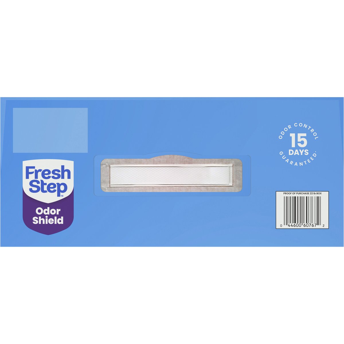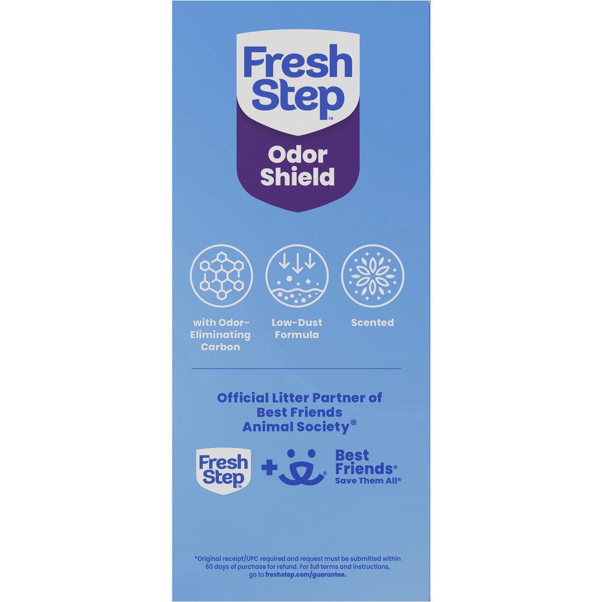 With odor-eliminating carbon. Low-dust formula. Scented. Sold by weight, not by volume. Contents may settle during shipping. Odor control 15 days guaranteed *. * Original receipt/UPC required and request must be submitted within 60 days of purchase for refund. For full terms and instructions, go to freshstep.com/guarantee. how2recycle.info. www.freshstep.com. Questions or comments? Please visit our website at www.freshstep.com or call 1-800-325-9259. Made in USA of global ingredients.