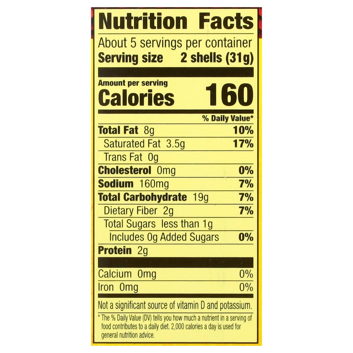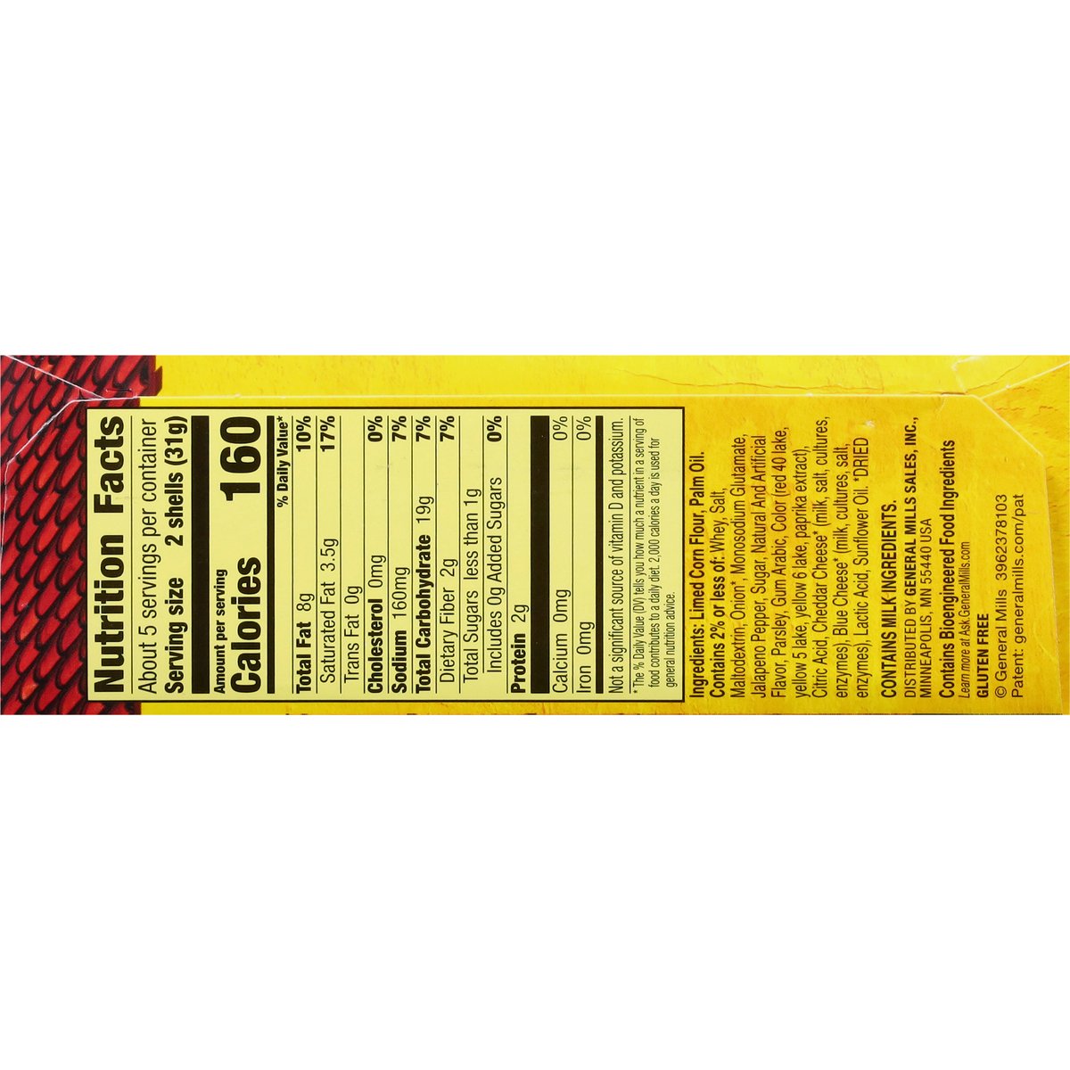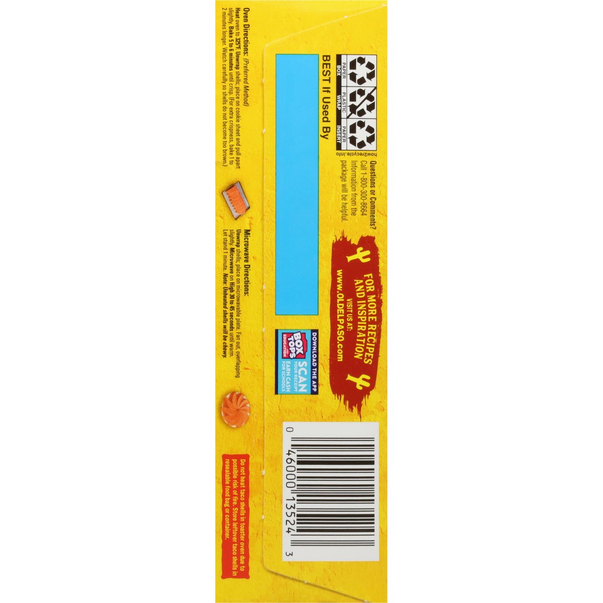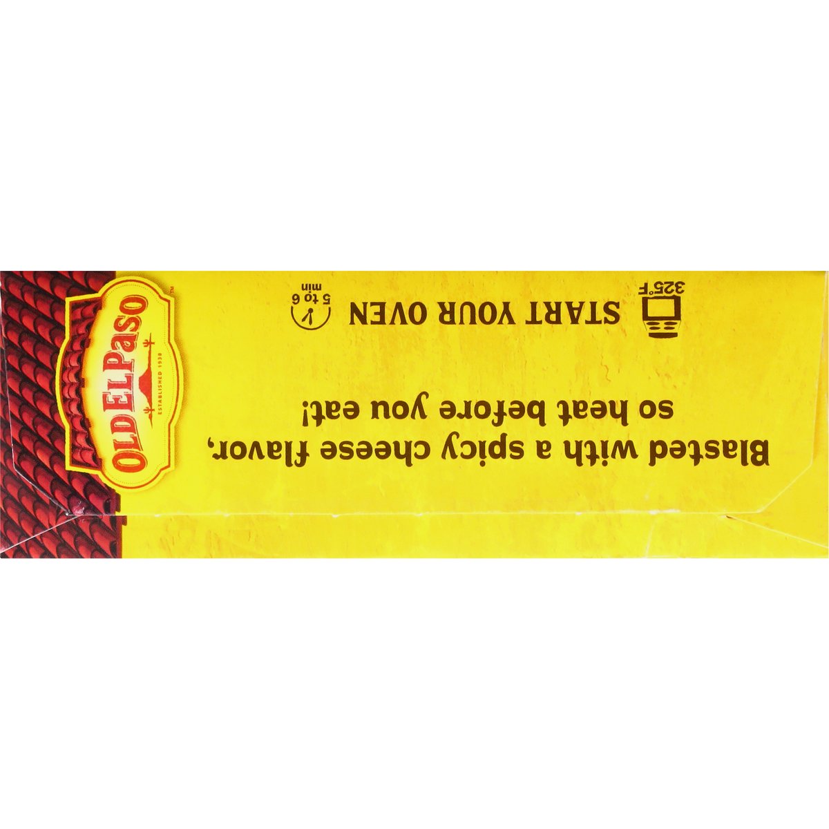Per 2 Slices: 160 calories; 3.5 g sat fat (17% DV); 160 mg sodium (7% DV); Less than 1 g total sugars. Gluten free. Contains bioengineered food ingredients. Learn more at Ask.GeneralMills.com. Established 1938. Shells stand up! Blasted with a spicy cheese flavor, so heat before you eat! www.OLDELPASO.com. how2recyle.info. Questions or comments? Call 1-800-300-8664 Information from the package will be helpful. For more recipes and inspiration visit us at: www.oldelpaso.com. Boxs Tops for Education: Download the app. Scan your receipt. Earn cash for schools. Product of Mexico.