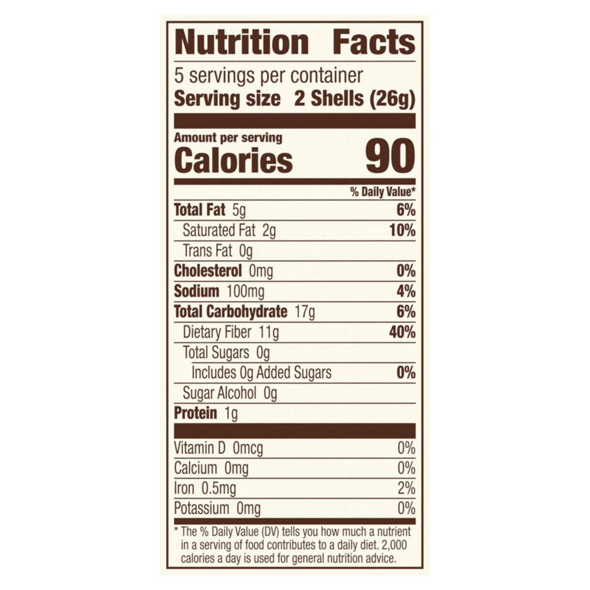 Per Two Shells: 6 g net carbs; 90 calories. 6 g net carbs = 17 g total carbs - 11 g fiber - 0 g sugar alcohol. Per 2 Shells: 90 calories; 2 g sat fat (10% DV); 100 mg sodium (4% DV); 0 g added sugars (0% DV). Gluten free. Contains bioengineered food ingredients. Learn more at Ask.GeneralMills.com. Improved taste & crunch*. Established 1938. The Old El Paso crunchy taco shells you know and love, now with less net carbs! Nourish your cravings with the flavorful crunch of carb advantage crunchy taco shells. For max crunch, heat 'em up! * Compared to prior recipe. www.oldelpaso.com. how2recycle.info. Questions or comments? Call 1-800-828-3291. Information from the package will be helpful. For more recipes and inspiration visit us at: www.oldelpaso.com. Box Tops for Education: Download the app. Scan your receipt. Earn cash for schools.