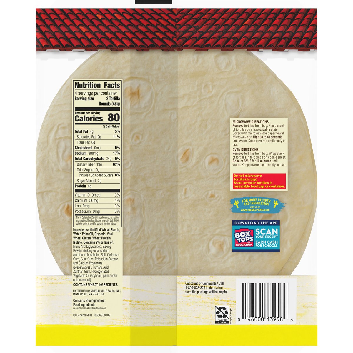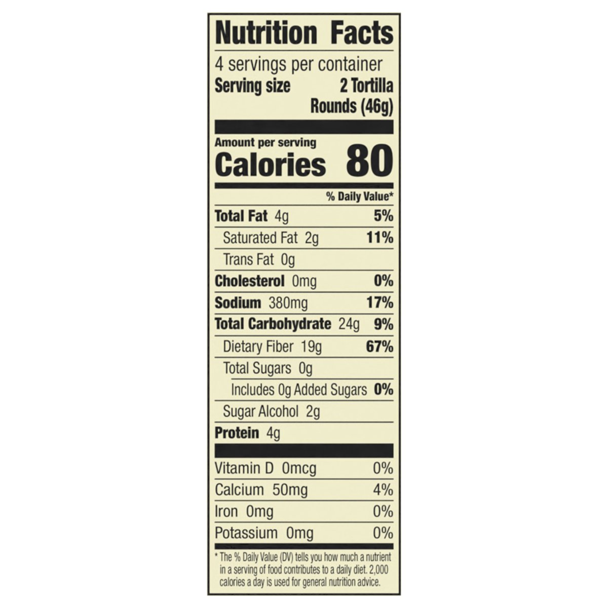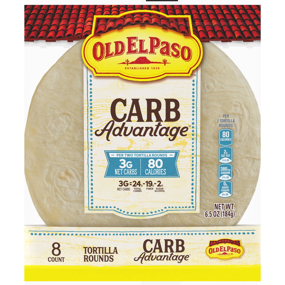 Per Two Tortilla Rounds: 3 g net carbs. 80 calories. 3 g net carbs = 24 g total carbs - 19 g fiber - 2 g sugar alcohol. Per 2 Tortilla Rounds: 80 calories; 2 g sat fat (11% DV); 380 mg sodium (17% DV); 0 g added sugars (0% DV). Contains bioengineered food ingredients. Learn more at Ask.GeneralMills.com. Established 1938. Carb advantage. www.oldelpaso.com. how2recycle.info. For more recipes and inspiration. Visit us at: www.oldelpaso.com. Questions or Comments? Call 1-800-828-3291 information from the package will be helpful. Box Tops for Education: Download the app. Scan your receipt. Earn cash for schools.