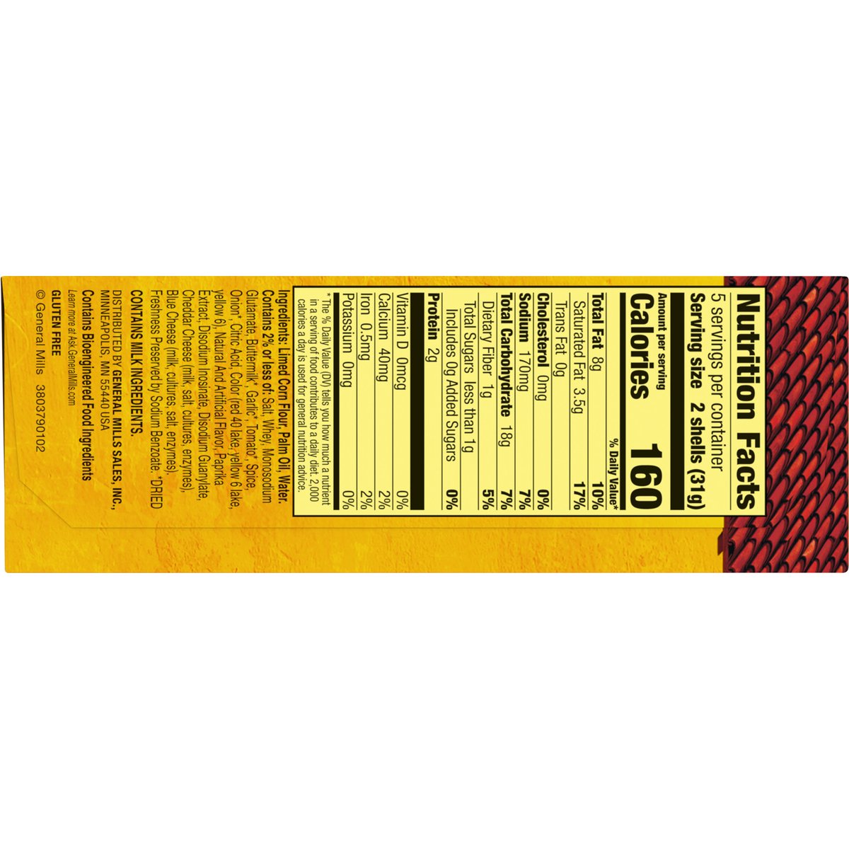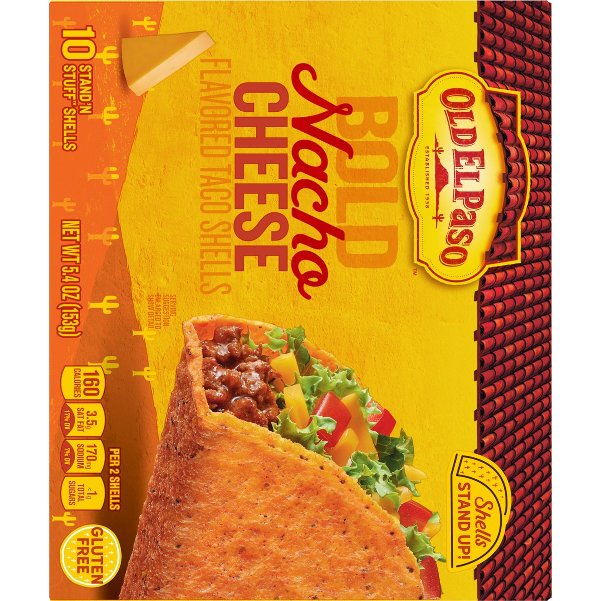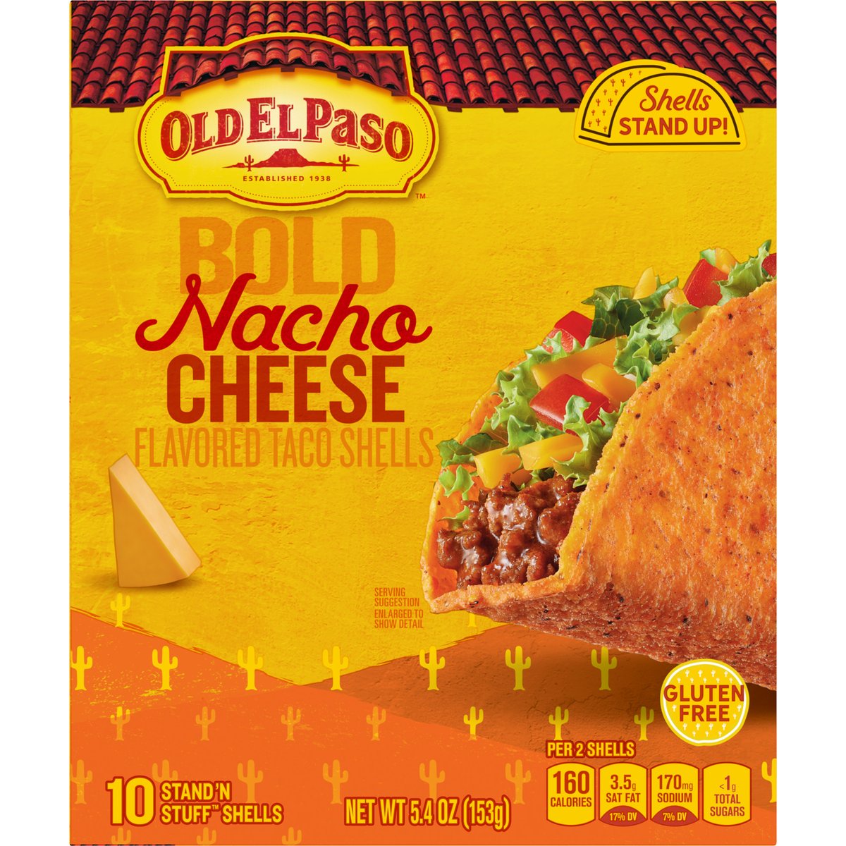 Nacho cheese flavored taco shells. Per 2 Shells: 160 calories; 3.5 g sat fat (17% DV); 170 mg sodium (7% DV); <1 total sugars. Gluten free. Contains bioengineered food ingredients. Learn more at Ask.GeneralMills.com. Established 1938. Shells stand up! Blasted with cheesy flavor, so heat before you eat! www.oldelpaso.com. how2recycle.info. Questions or Comments? Call 1-800-828-3291. Information from the package will be helpful. For more recipes and inspiration visit us at: www.oldelpaso.com. Box Tops for Education: Download the app. Scan your receipt. Earn cash for schools.