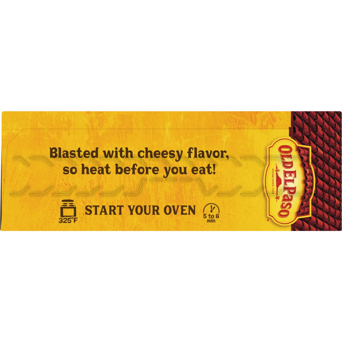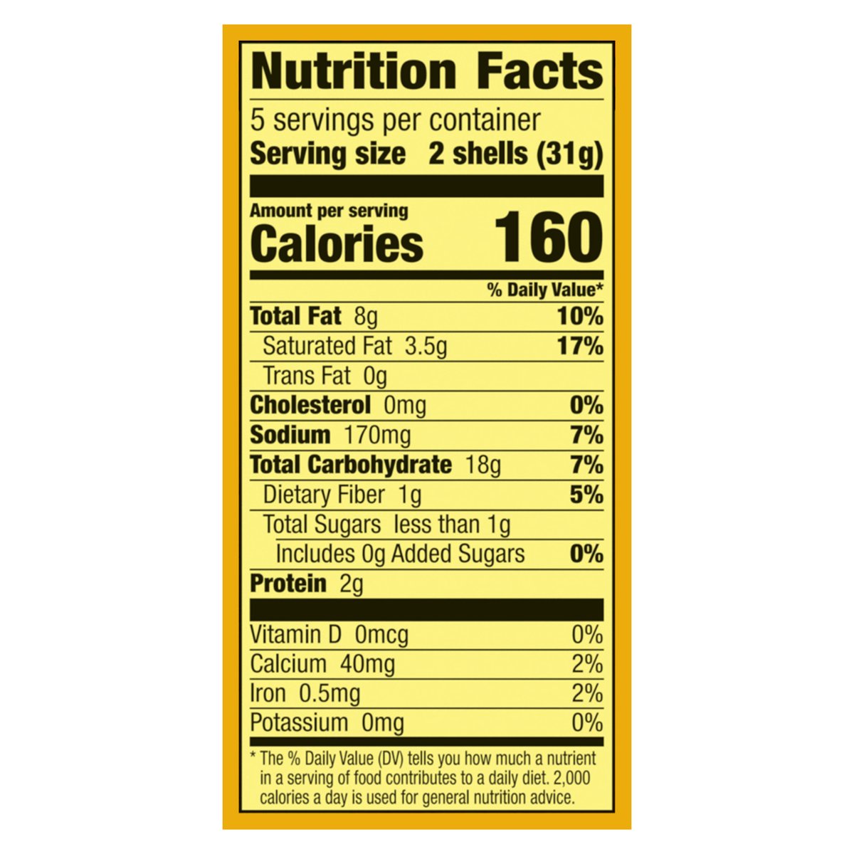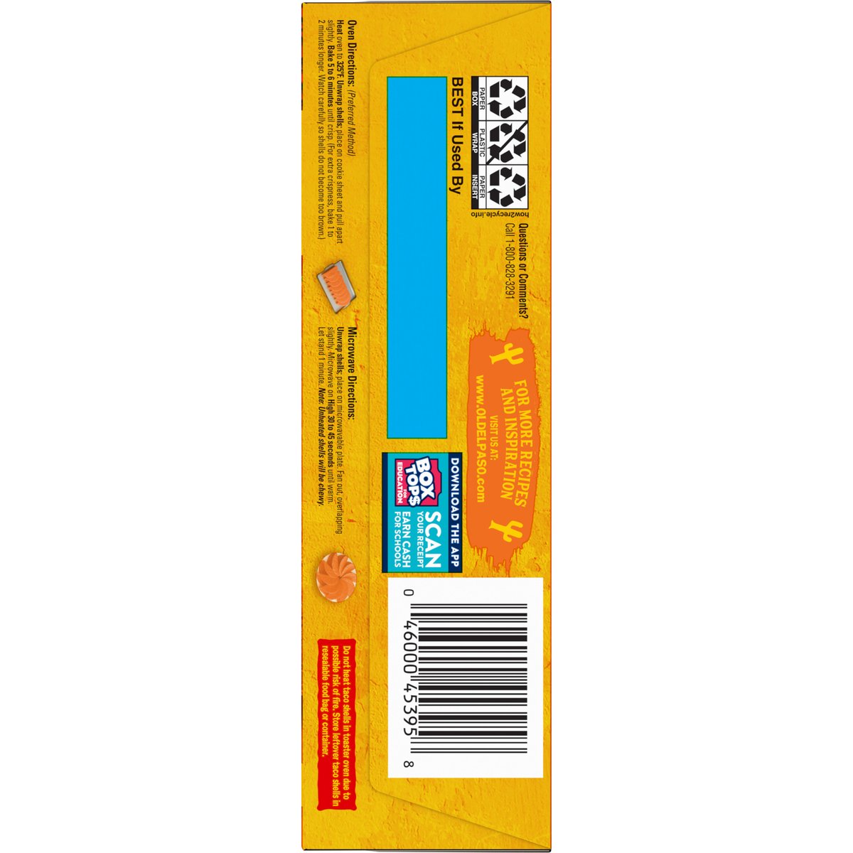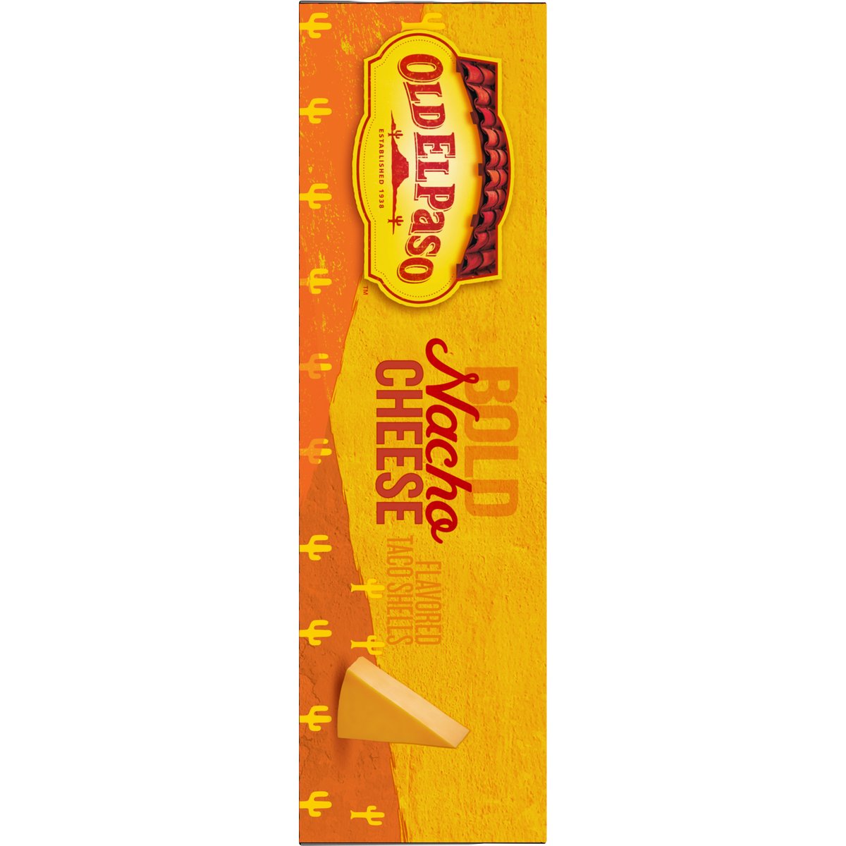 Nacho cheese flavored taco shells. Per 2 Shells: 160 calories; 3.5 g sat fat (17% DV); 170 mg sodium (7% DV); <1 total sugars. Gluten free. Contains bioengineered food ingredients. Learn more at Ask.GeneralMills.com. Established 1938. Shells stand up! Blasted with cheesy flavor, so heat before you eat! www.oldelpaso.com. how2recycle.info. Questions or Comments? Call 1-800-828-3291. Information from the package will be helpful. For more recipes and inspiration visit us at: www.oldelpaso.com. Box Tops for Education: Download the app. Scan your receipt. Earn cash for schools.