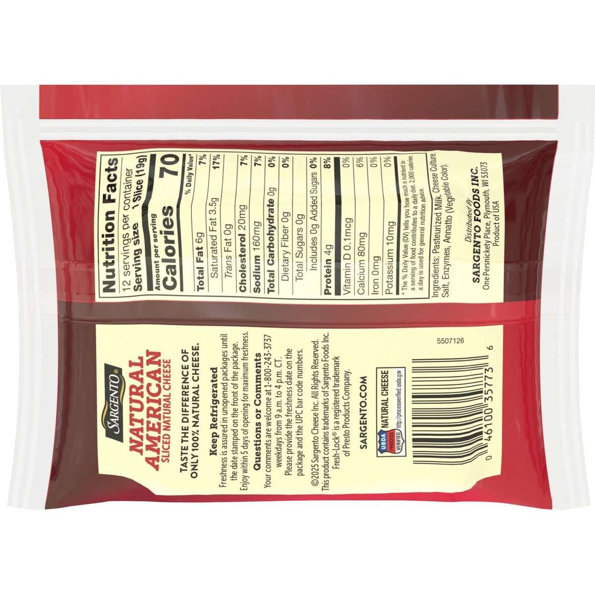Our family's passion is cheese. Taste the difference of only 100% natural cheese. USDA Process Verified. Natural Cheese. http://processverified.usda.gov. sargento.com. Questions or Comments: Your comments are welcome at 1-800-243-3737 weekdays from 9 a.m. to 4 p.m. CT. Please provide the freshness date on the package and the UPC bar code numbers. FreshLock. Click in freshness. Product of USA.