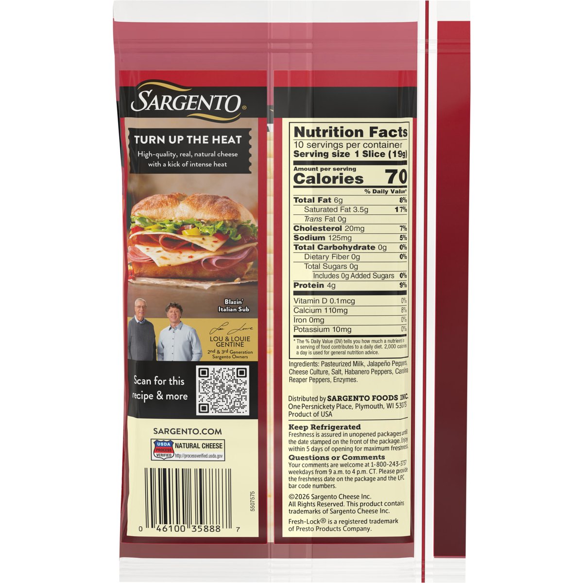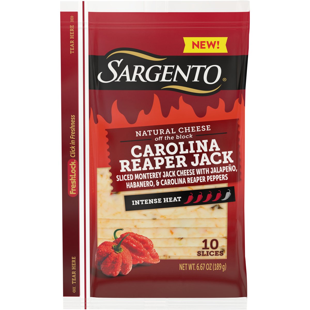 Natural cheese off the block Carolina Reaper jack sliced Monterey jack cheese with jalapeno, habanero & Carolina Reaper peppers. New! Turn up the heat. High-quality, real, natural cheese with a kick of intense heat. Blazin' Italian Sub. - Lou & Louie Gentine. 2nd & 3rd generation Sargento owners. USDA Process verified. Natural cheese. http://processverified.usd.gov. sargento.com. Scan for this recipe & more. Questions or comments. Your comments are welcome at 1-800-243-3737 weekdays from 9 a.m. to 4 p.m. CT. Please provide the freshness date on the package and the UPC bar code numbers. FreshLock. Click in freshness. Product of USA.