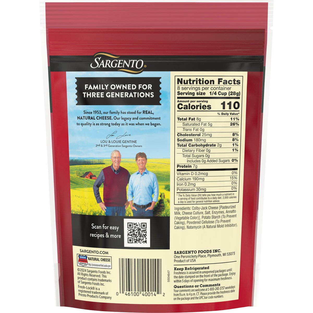 Shredded colby-jack cheese. 2 cups. Our family's passion is cheese. Family owned for three generations. Since 1953, our family has stood for real, natural cheese. Our legacy and commitment to quality is a s strong today as it was when we began. Lou & Louie Gentine. 2nd & 3rd generation Sargento owners. USDA Process Verified: Natural cheese. http://processverified.usda.gov. sargento.com. Scan for easy recipes & more. Questions or Comments: Your comments are welcome at 1-800-243-3737 weekdays from 9 am to 4 pm CT. Please provide the freshness date on the package and the UPC bar code numbers. FreshLock. Product of USA.