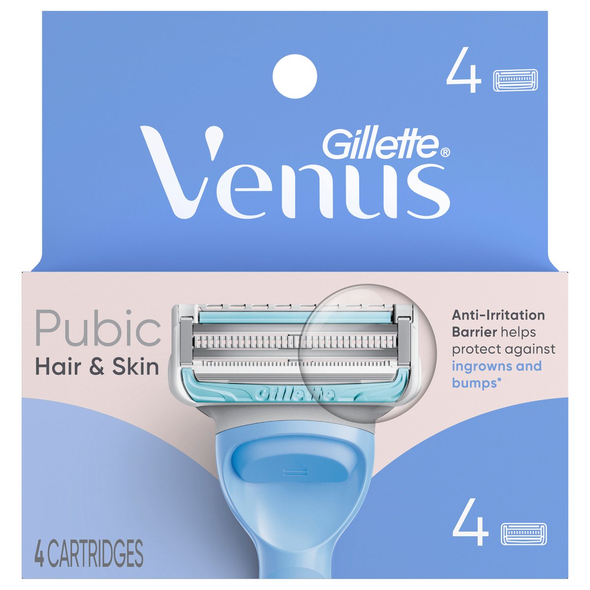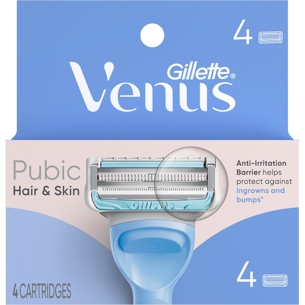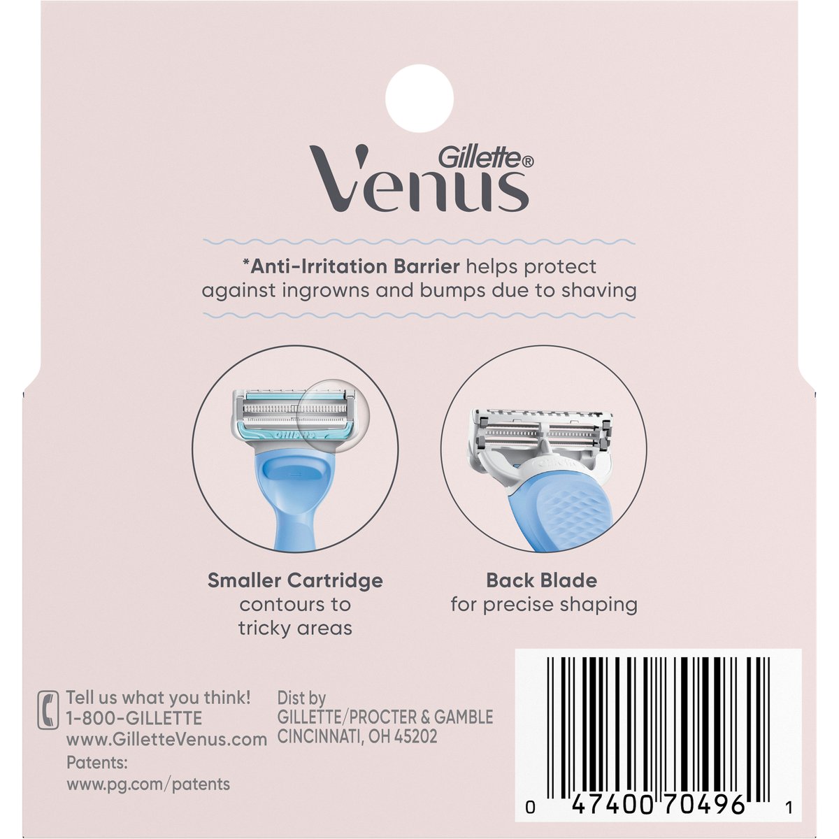 Pubic hair & skin. Anti-irritation barrier helps protect against ingrowns and bumps*. Smaller Cartridge contours to tricky areas. Back Blade for precise shaping. *Anti-Irritation Barrier helps protect against ingrowns and bumps due to shaving. www.GilletteVenus.com. www.pg.com. how2recycle.info. Tell us what you think! 1-800-GILLETTE www.GilletteVenus.com. FSC. Mix. Packaging Supporting responsible forestry.