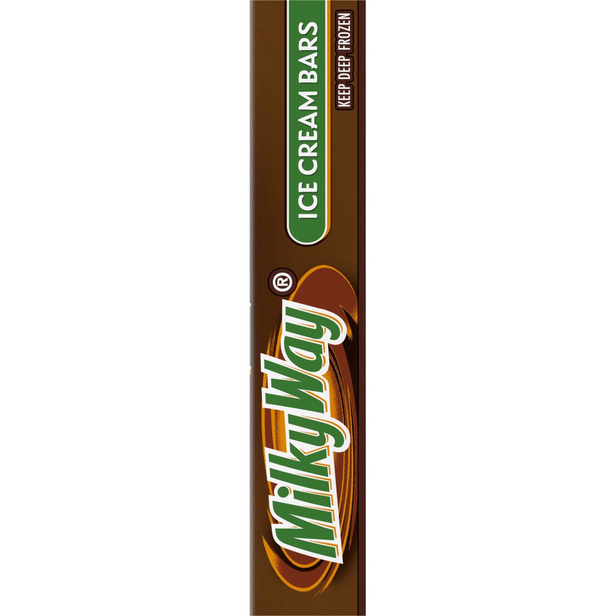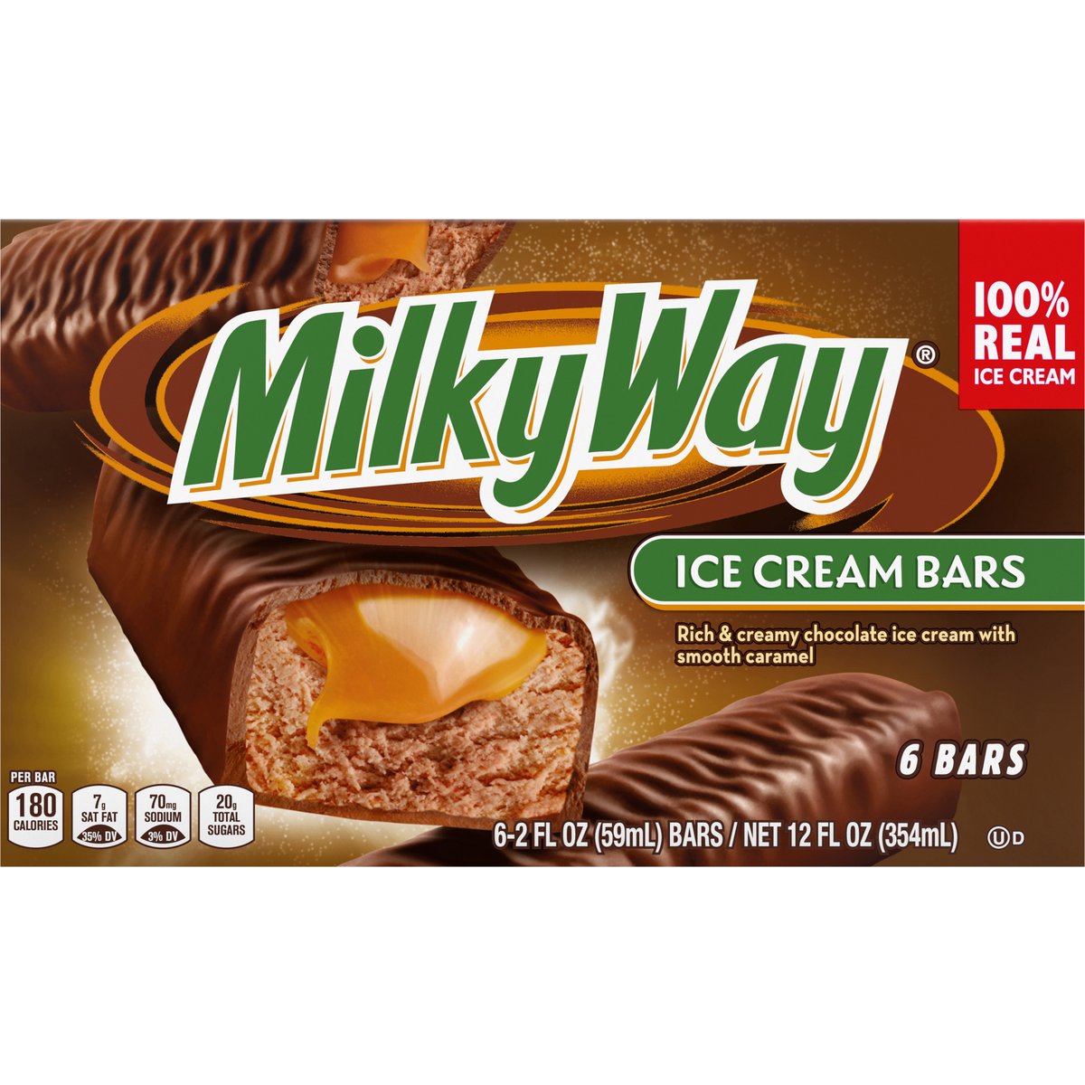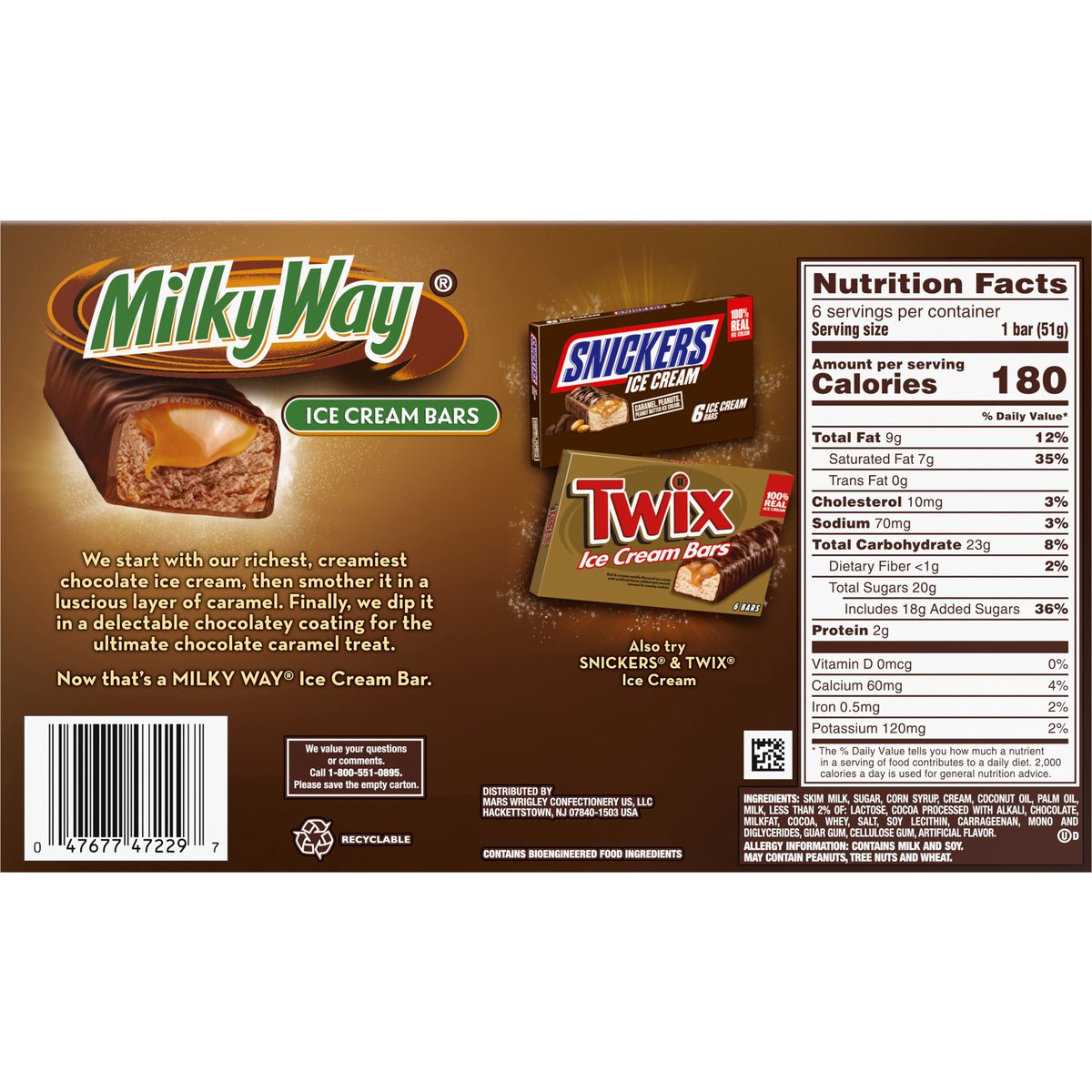 Rich & creamy chocolate ice cream with smooth caramel. Per Bar: 180 calories; 7 g sat fat (35% DV); 70 mg sodium (3% DV); 20 g total sugars. Contains bioengineered food ingredients. 100% real ice cream. We start with our richest, creamiest chocolate ice cream, then smother it in a luscious layer of caramel. Finally, we dip it in a delectable chocolatey coating for the ultimate chocolate caramel treat. Now that's a Milky Way Brand Ice Cream Bar. We value your questions or comments. Call 1-800-551-0895. Please save the empty carton. Also try Snickers Brand & Twix Brand Ice Cream. Recyclable.