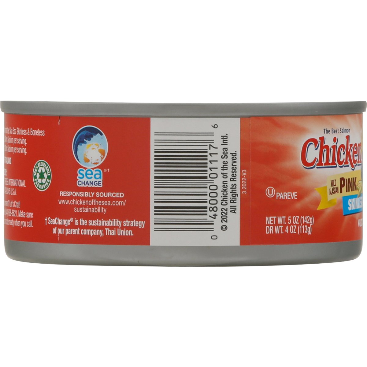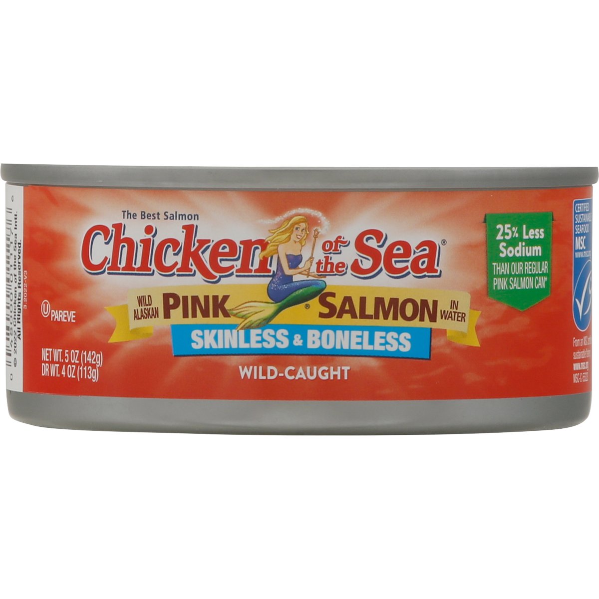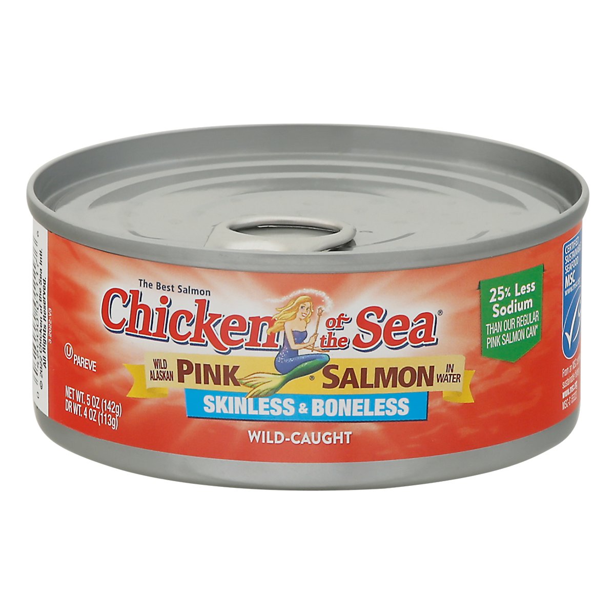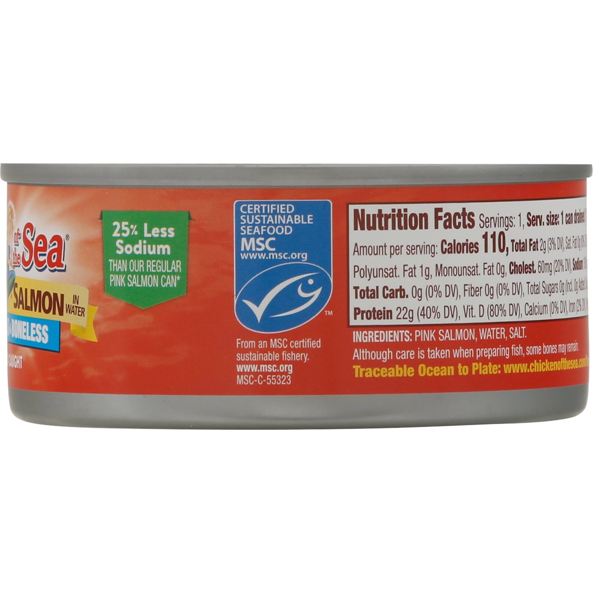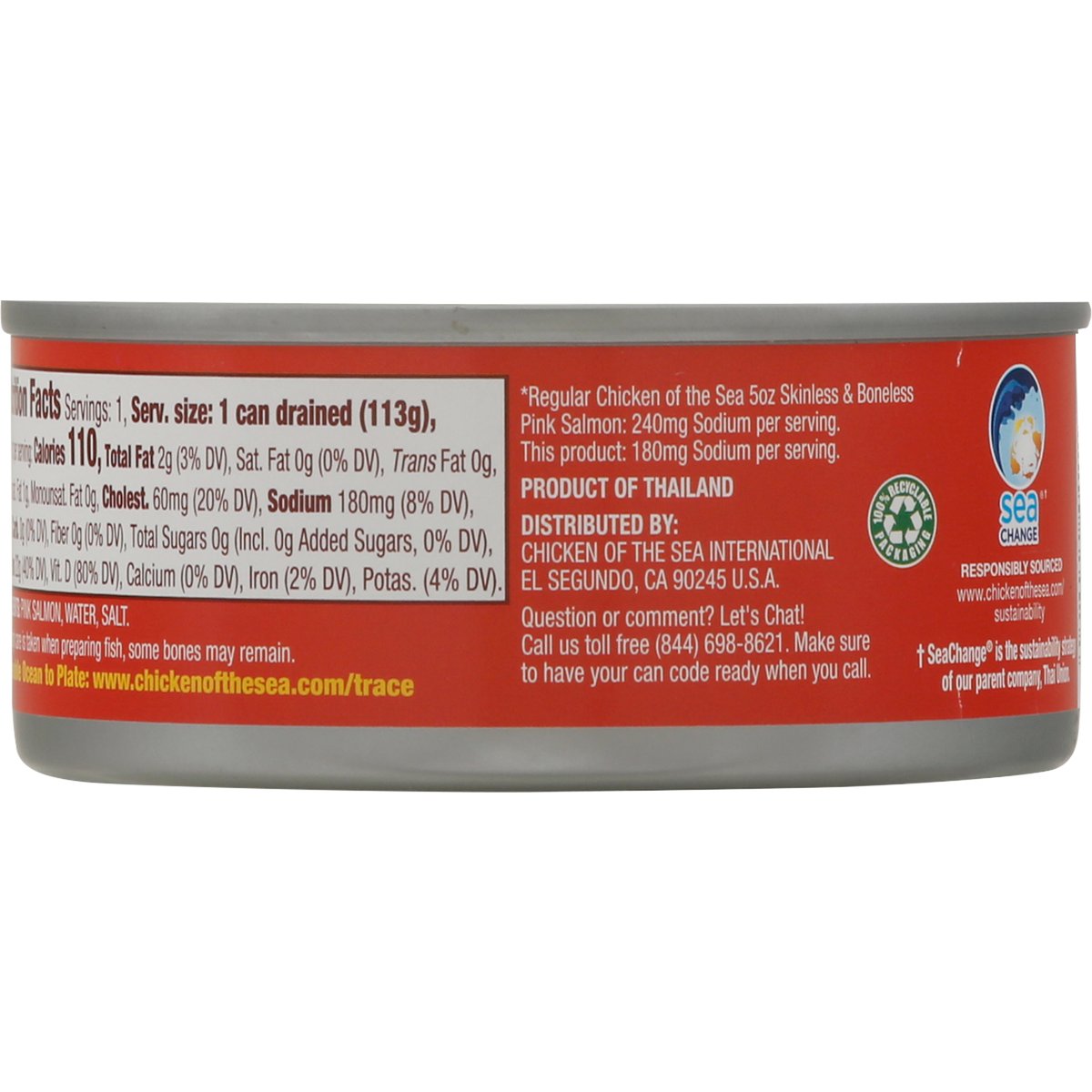 Wild Alaskan pink salmon in water. 25% less sodium than our regular pink salmon can (Regular Chicken of the Sea 5 oz Skinless & Boneless Pink Salmon: 240 mg Sodium per serving. This product: 180 mg Sodium per serving). The best salmon. www.chickenofthesea.com/trace. Question or Comment? Let's Chat! Call us toll free (844) 698-8621. Make sure to have your can code ready when you call. Traceable Ocean to plate: www.chickenofthesea.com/trace. MSC: Certified sustainable seafood. msc.org. From an MSC certified sustainable fishery. www.msc.org. Wild-caught. 100% Recyclable packaging. Sea Change (SeaChange is the sustainability strategy of our parent company, Thai Union): Responsibly sourced. www.chickenofthesea.com/sustainability. Product of Thailand.