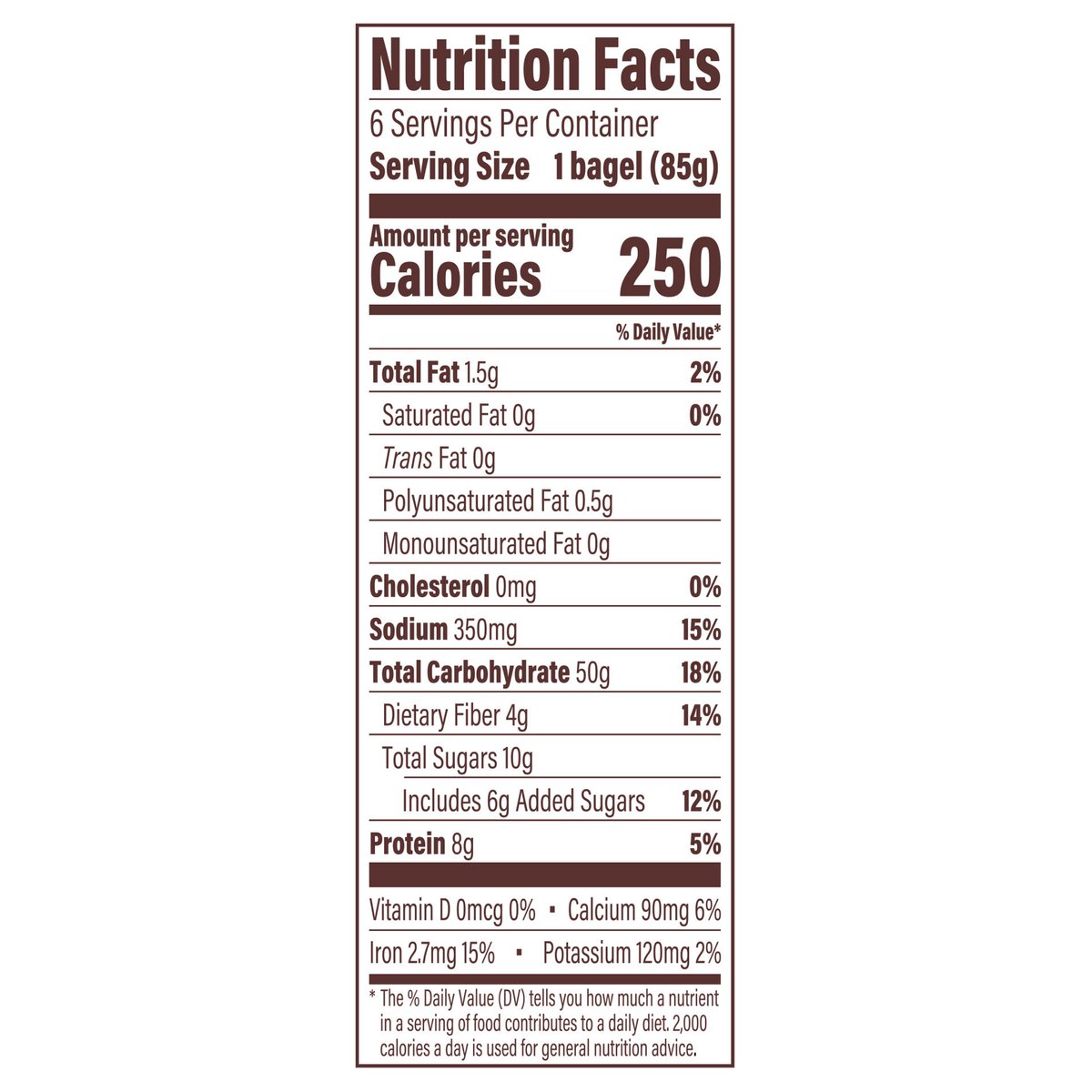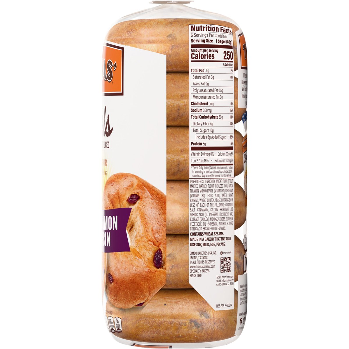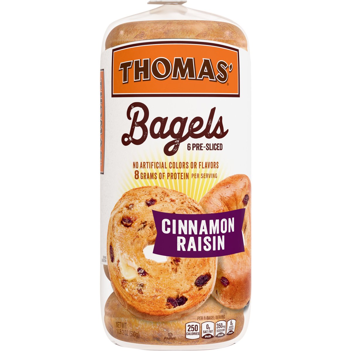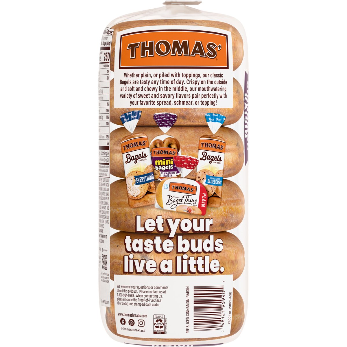 8 grams of protein per serving. Per 1 Bagel Serving: 250 calories; 0 g sat fat (0% DV); 350 mg sodium (15% DV); 6 g added sugars (12% DV). No artificial colors or flavors. Whether plain, or piled with toppings, our classic Bagels are tasty any time of day. Crispy on the outside and soft and chewy in the middle, our mouthwatering variety of sweet and savory flavors pair perfectly with your favorite spread, schmear, or topping! Let your taste buds live a little. www.thomasbreads.com. how2recycle.info. Facebook. Pinterest. Instagram. @thomasbreakfast. SmartLabel. Scan for more food information or call 1-800-432-8266. We welcome your questions or comments about this product. Please contact us at 1-800-984-0989. When contacting us, please include the Proof-of-Purchase (Bar Code) and stamped date code. Thomas Bagels Everything; Thomas Mini Bagels; Thomas Bagels naturally flavored blueberry; Thomas Bagel Thins.