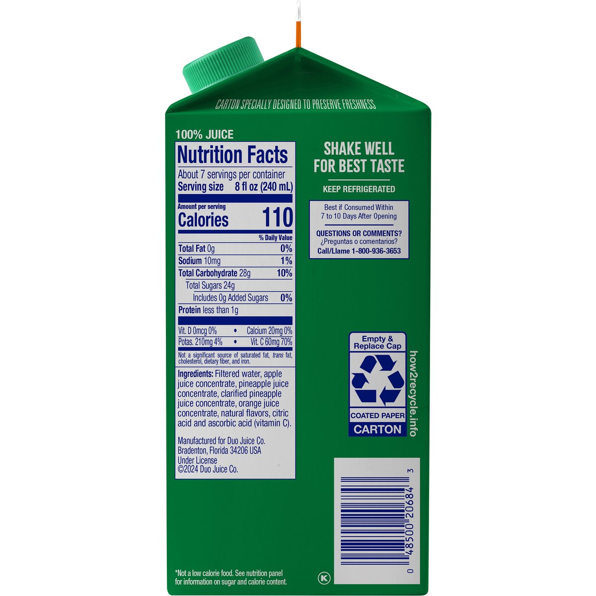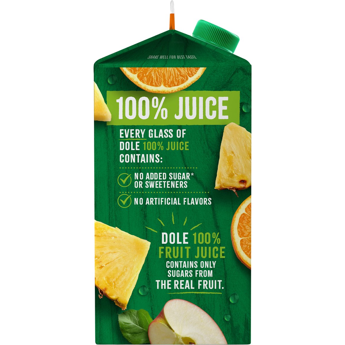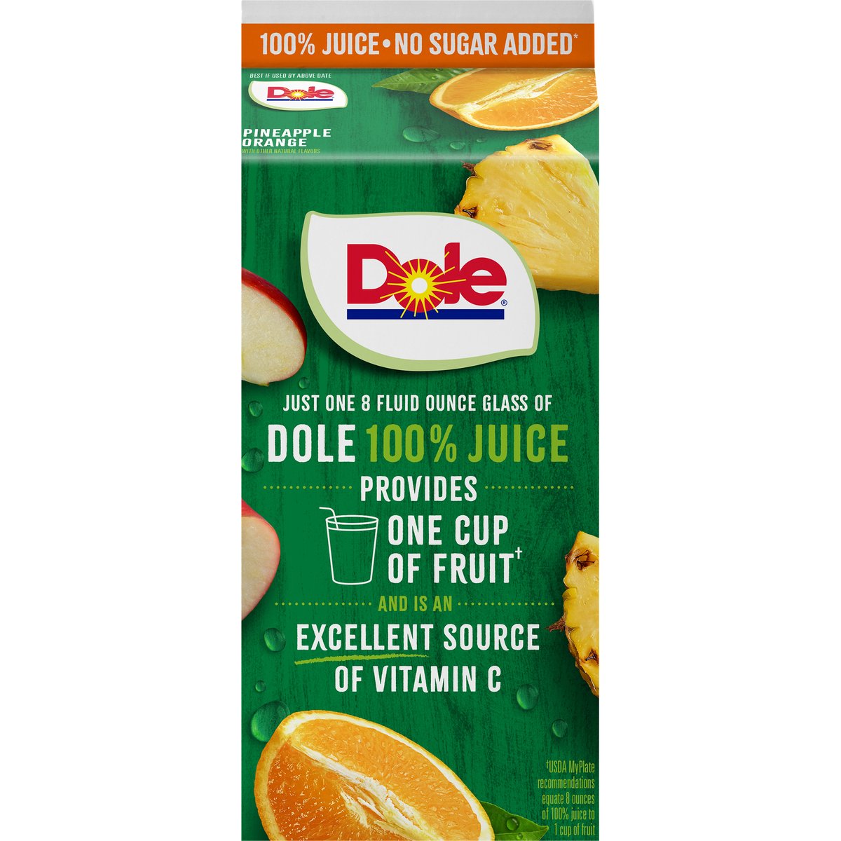Flavored blend of pineapple, apple and orange juices from concentrate with other natura flavors and ingredients. No artificial flavors. 110 calories per 8 fl oz serving. No sugar added*. * Not a low calorie food. See nutrition panel for information on sugar and calorie content. Pasteurized. Just one 8 fluid ounce glass of Dole 100% juice provides: one cup of fruit (a) and is an excellent source of vitamin C. Every glass of Dole 100% juice contains no added sugars* or sweeteners. Dole 100% fruit juice contains any sugars from the real fruit. (a) USDA MyPlate recommendations equate 8 ounces of 100% juice to 1 cup of fruit. * Not a low calorie food. See nutrition panel for information on sugar and calorie content. how2recycle.info. Questions or comments? Call 1-800-936-3653. Carton specially designed to preserve freshness.