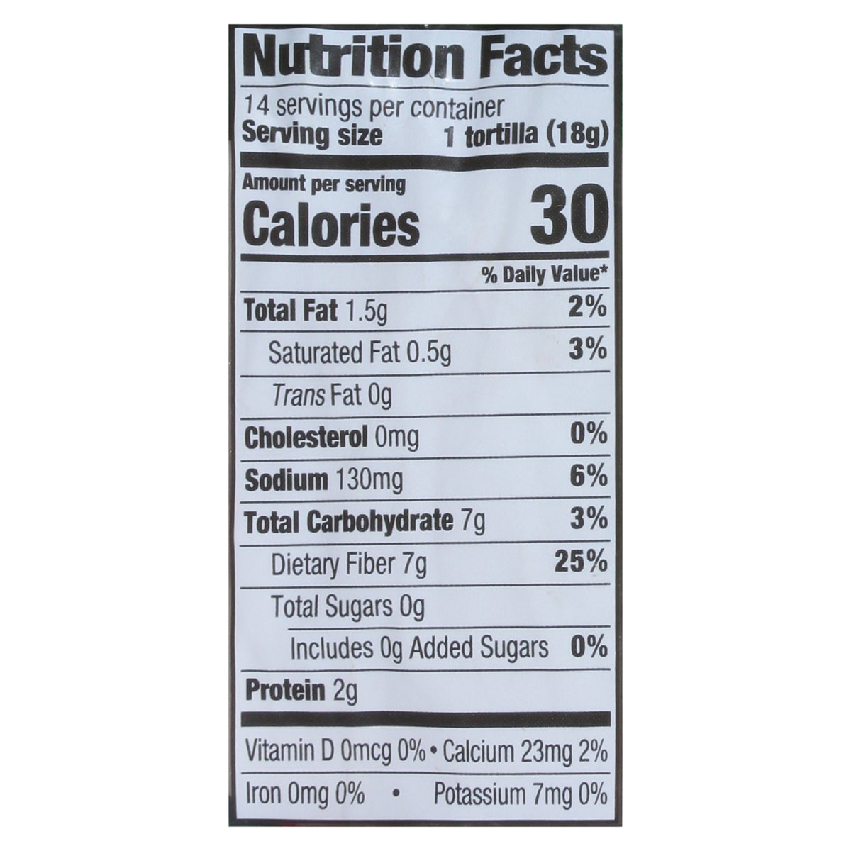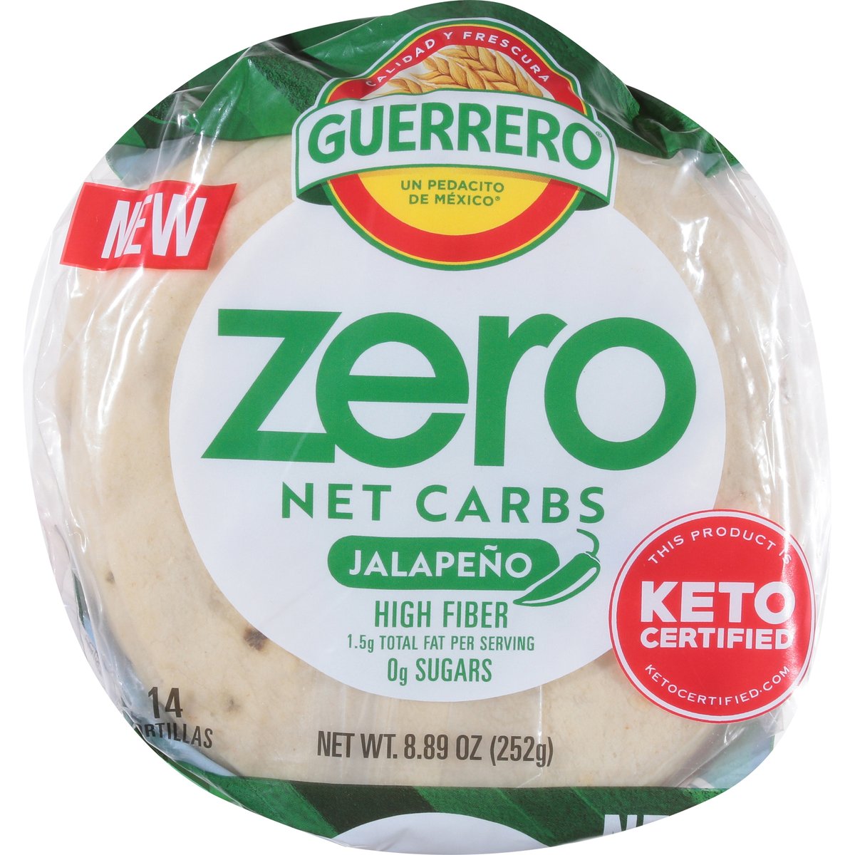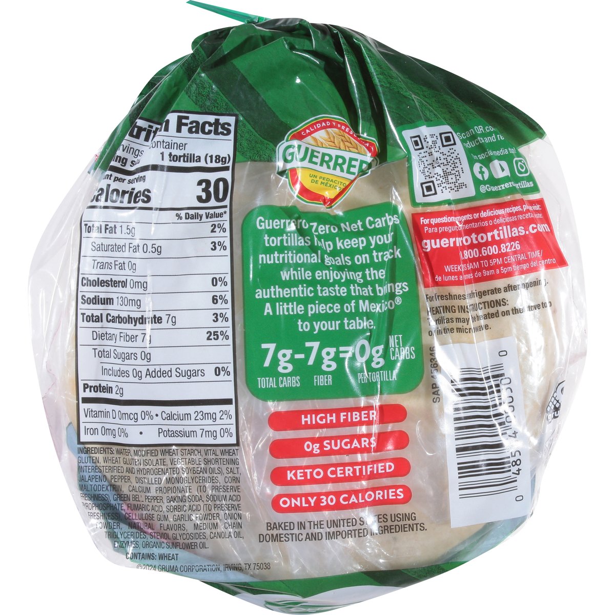 1.5 g total fat per serving. 0 g sugars. 7 g total carbs - 7 g fiber = 0 g net carbs per tortilla. 0 g sugars. Only 30 calories. Keto Certified. This product is keto certified. ketocertified.com. High fiber. New. Guerrero Zero Net Carbs tortillas help keep your nutritional goals on track while enjoying the authentic taste that brings A little piece of Mexico to your table. guerrerotortillas.com. Scan QR code for products and recipes. On social media tool. Facebook. YouTube. Instagram. @GuerreroTortillas. For questions, comments or delicious recipes, please visit: guerrerotortillas.com; 1-800-600-8226 Weekdays 9 AM to 5 PM Central Time. Baked in the United States using domestic and imported ingredients.