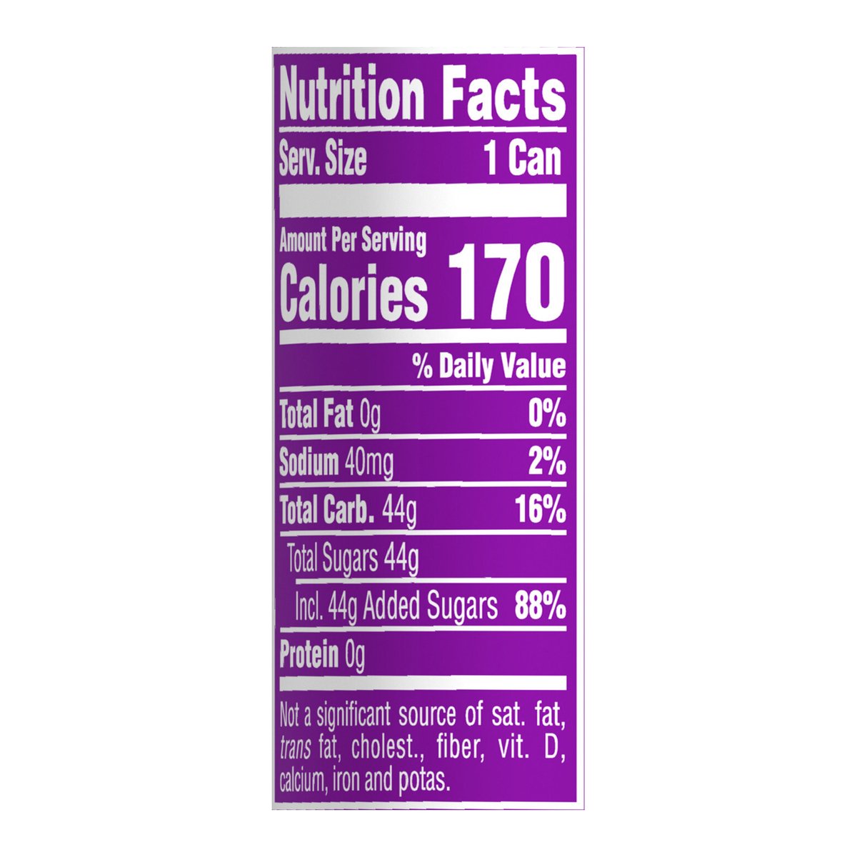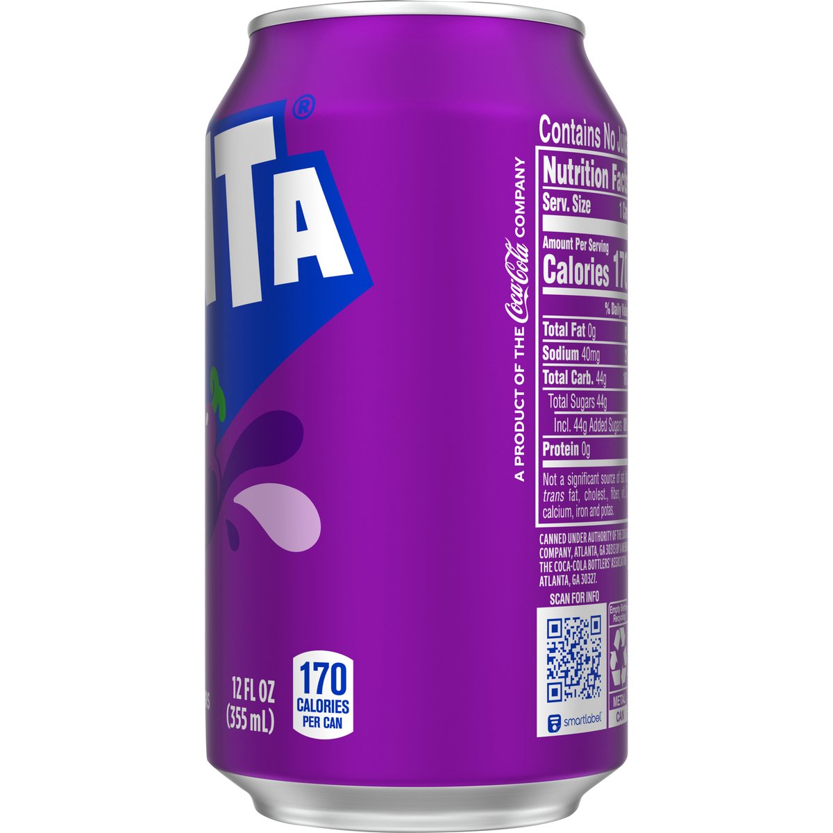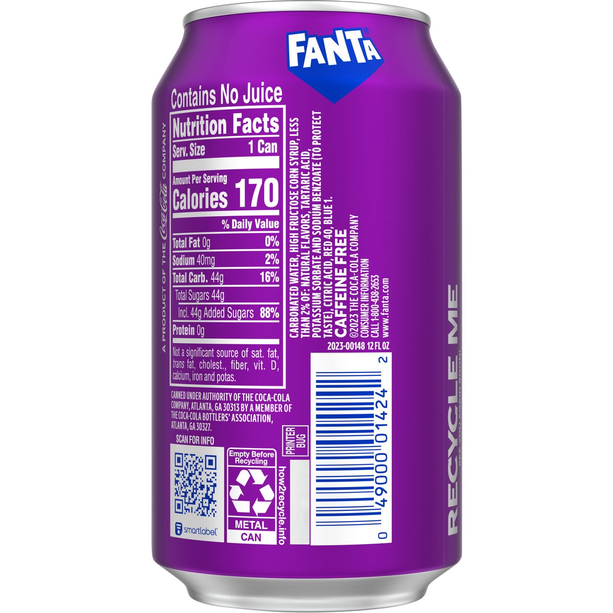 Grape flavored soda with other natural flavors. 170 calories per can. Caffeine free. A product of the Coca-Cola Company. how2recycle.info. www.fanta.com. SmartLabel: Scan for info. Consumer information call 1-800-438-2653; www.fanta.com. Recycle me. See you again soon!