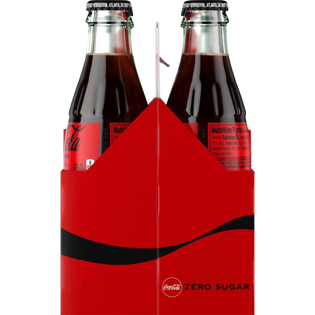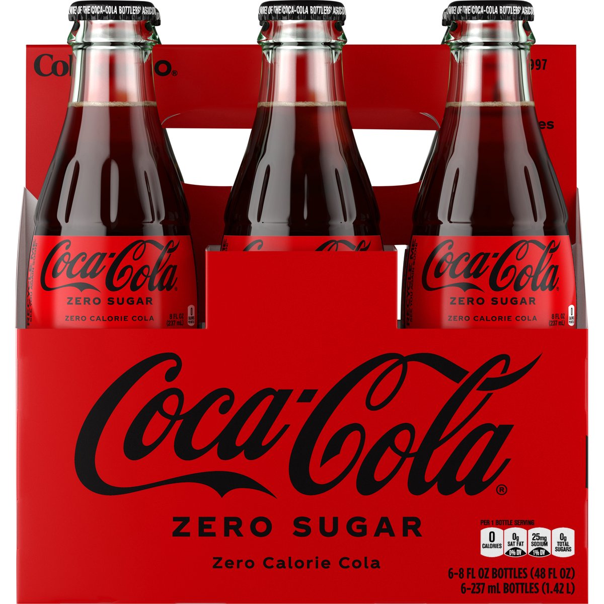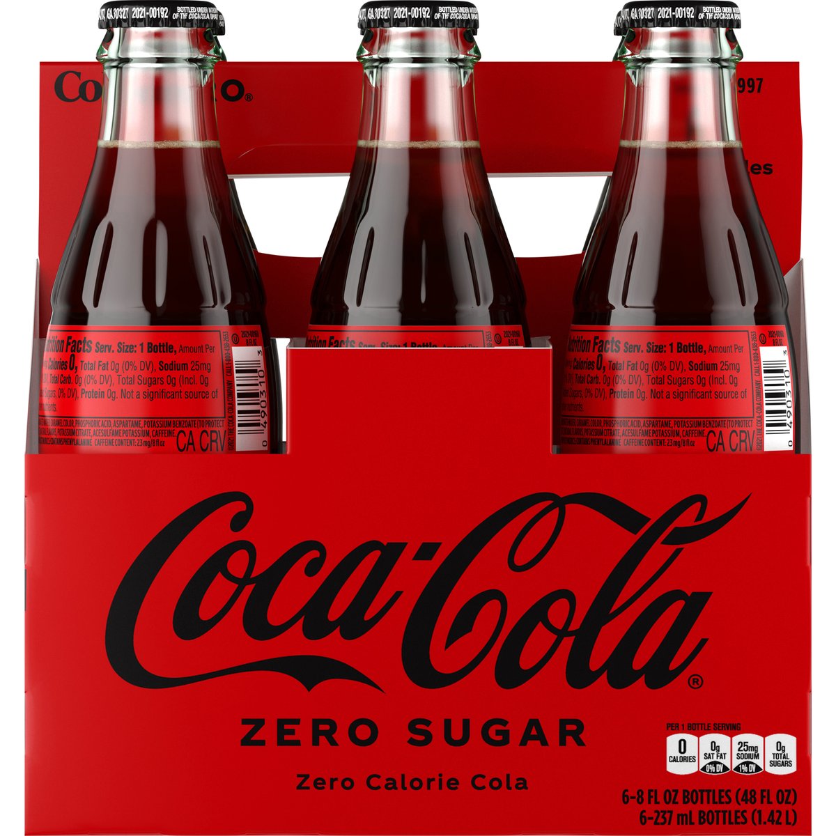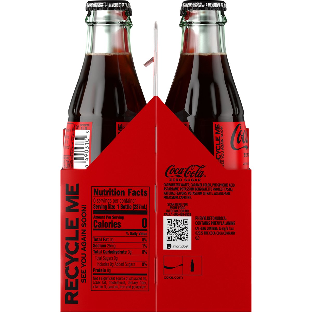 Per 1 Bottle Serving: 0 calories; 0 g sat fat (0% DV); 25 mg sodium (1% DV); 0 g sugars. Zero sugar. Zero calorie. Caffeine Content: 23 mg/8 fl oz. Now more delicious. No refill. coke.com. how2recycle.info. Scan for more food information or call 1-800-438-2653. SmartLabel.