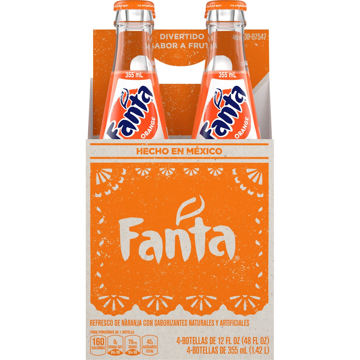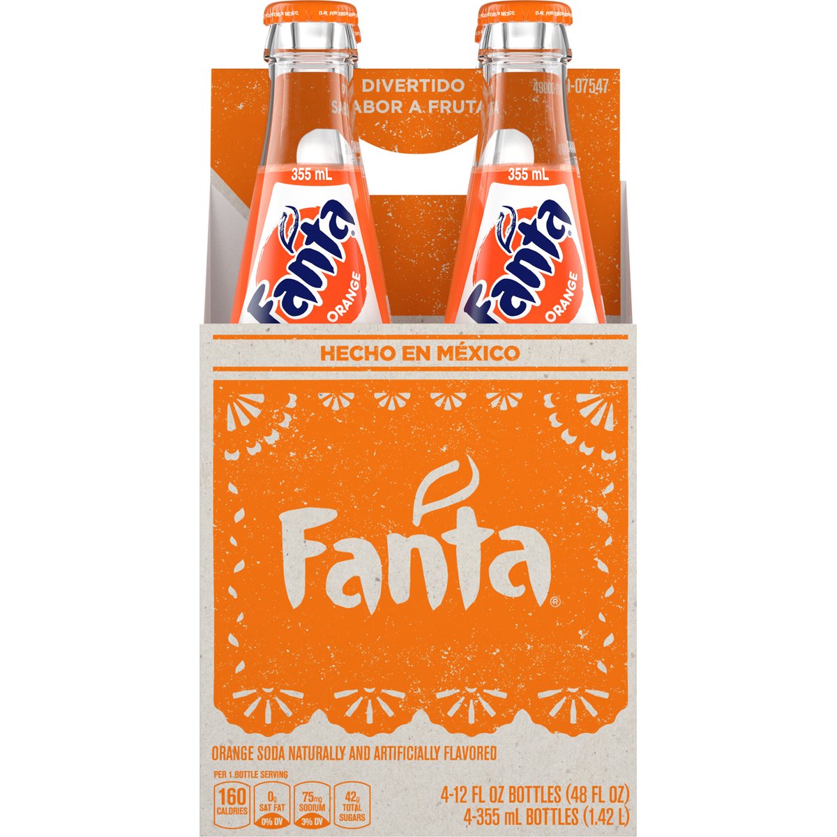 Orange soda naturally and artificially flavored. Per 1 Bottle Serving: 160 calories; 0 g sat fat (0% DV), 75 mg sodium (3% DV), 42 g total sugars. www.fanta.com. SmartLabel: Scan for more food information or call 1-800-438-2653. Please recycle. Product of Mexico.