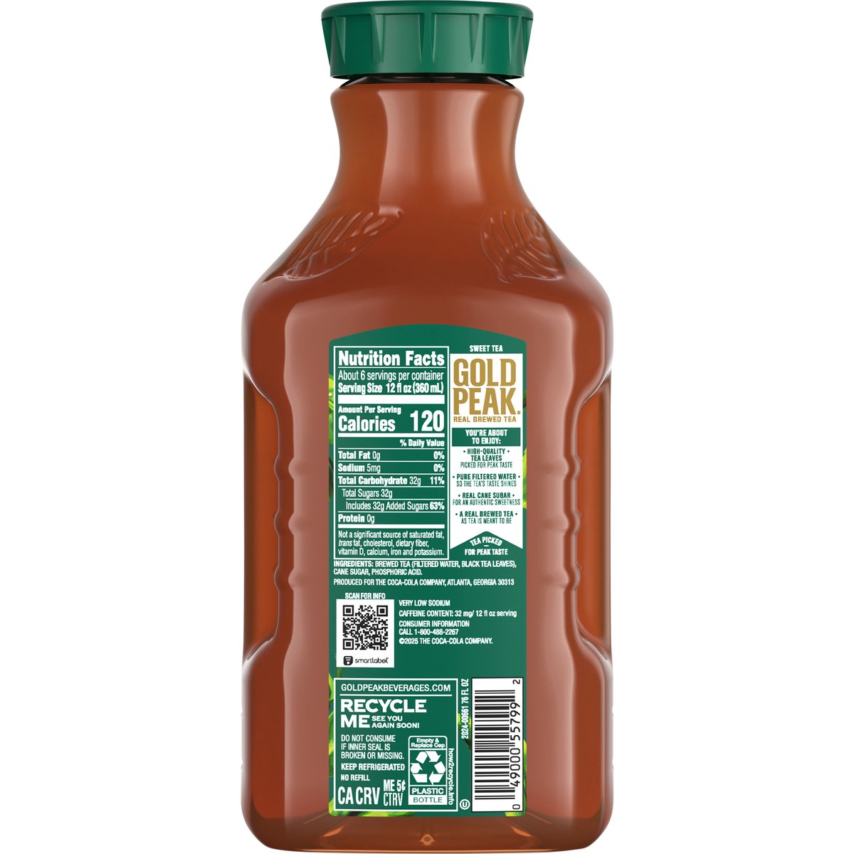 32 mg of caffeine per 12 fl oz serving. 120 calories per 12 fl oz serving. Very low sodium. Caffeine content: 32 mg/ 12 fl oz serving. Sweet tea. Real brewed tea. Tea picked for peak taste. Sweetness taste level 4. Great brewed taste. You're About to Enjoy: High-quality tea leaves picked for peak taste. Pure filtered water so the tea's taste shines. Real cane sugar for an authentic sweetness. A real brewed tea as tea is meant to be. Tea picked for peak taste. No refill. goldpeakbeverages.com. how2recycle.info. SmartLabel: Scan for info. Consumer information call 1-800-488-2267. Recycle me see you again soon!