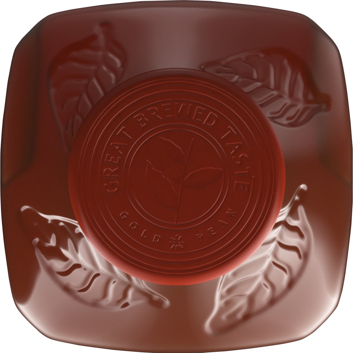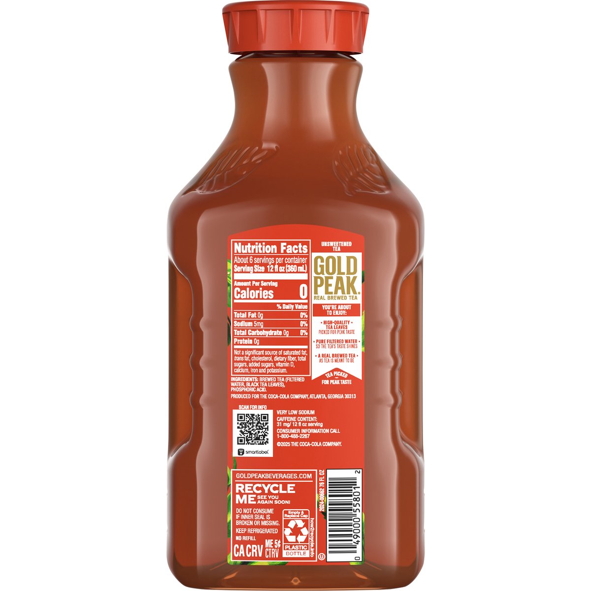 0 calories per 12 fl oz serving. 31 mg of caffeine per 12 fl oz serving. Very low sodium. Caffeine Content: 31 mg/12 fl oz serving. Tea picked for peak taste. Sweetness taste level 0. You're about to enjoy: high-quality tea leaves picked for peak taste. Pure filtered water so the tea's taste shines. A real brewed tea as tea is meant to be. No refill. how2recycle.info. goldpeakbeverages.com. SmartLabel: Scan for info. Consumer information call 1-800-488-2267. Recycle me. See you again soon!