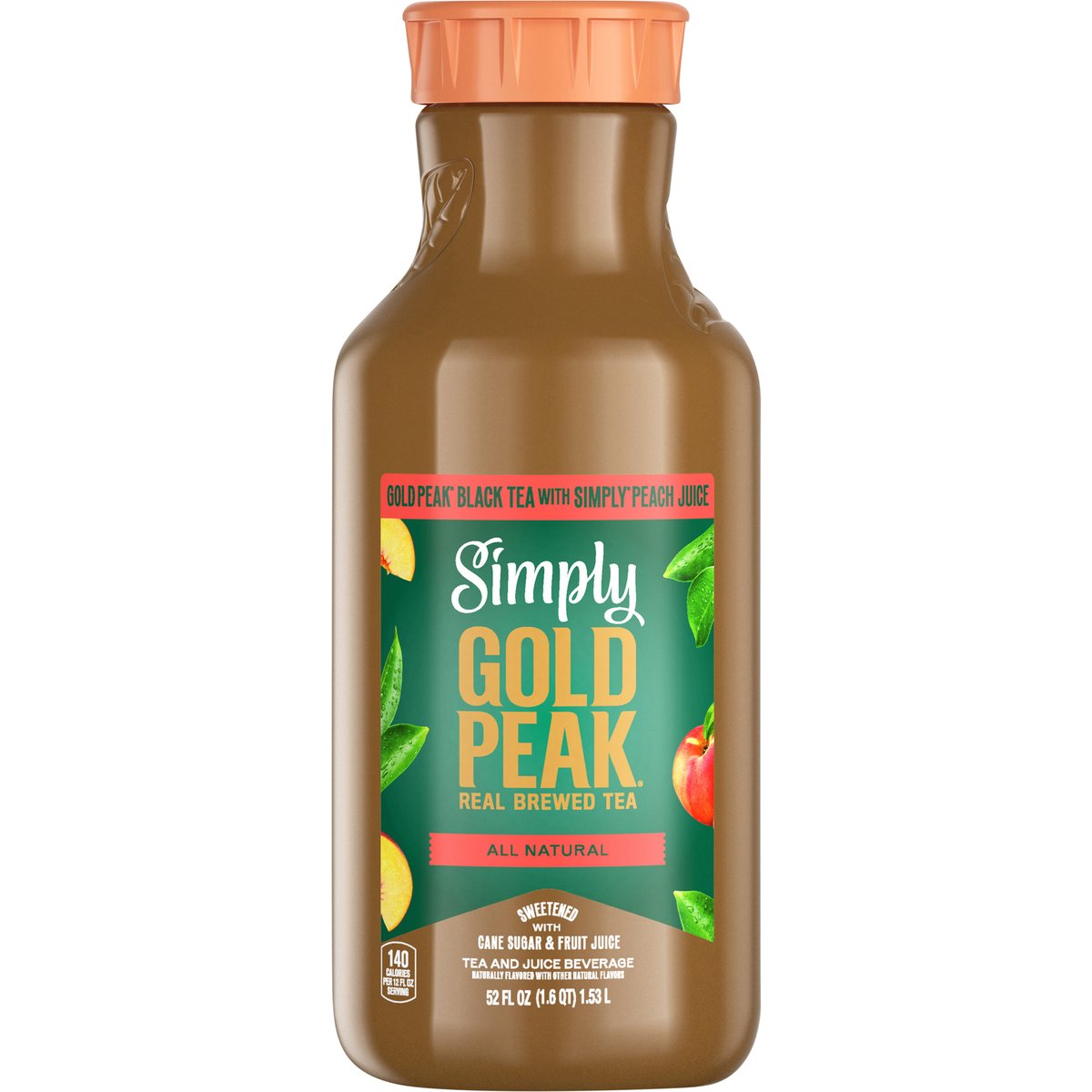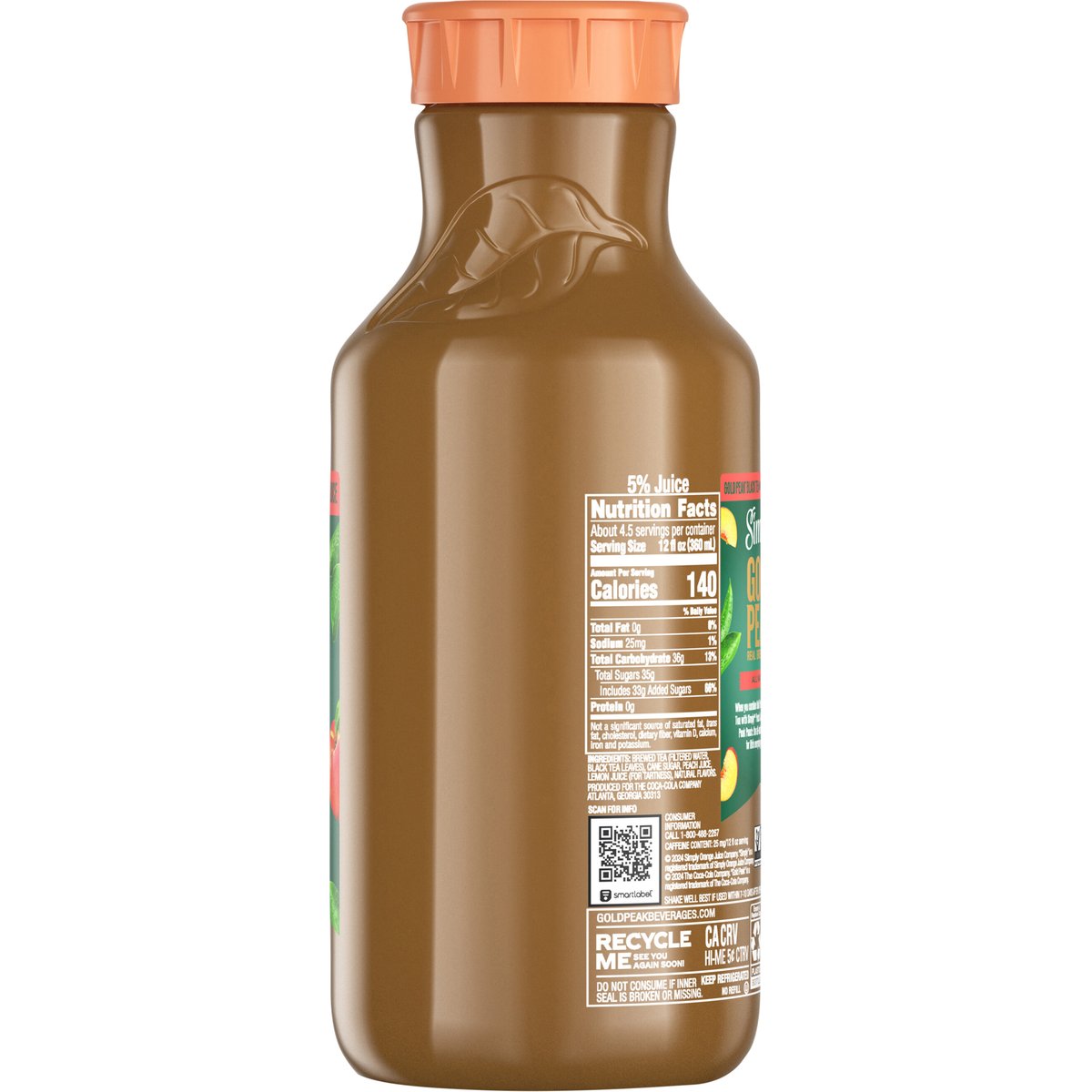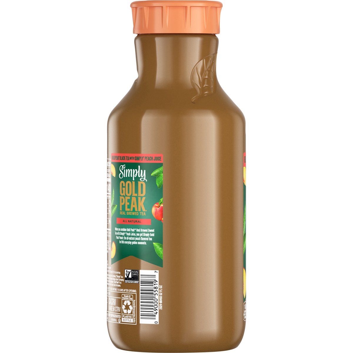 Gold Peak black tea with Simply peach juice. Sweetened with cane sugar & fruit juice. Naturally flavored with other natural flavors. 140 calories per 12 fl oz serving. Caffeine content: 25 mg/12 fl oz serving. Non-GMO Project verified. nongmoproject.org. All natural. No refill. When you combine Gold Peak Real Brewed Sweet Tea with Simply Peach Juice, you get Simply Gold Peak Peach: the all-natural peach flavored tea for life's everyday golden moments. goldpeakbeverages.com. how2recycle.info. SmartLabel: Scan for info. Consumer information call 1-800-488-2267. Recycle me see you again soon.