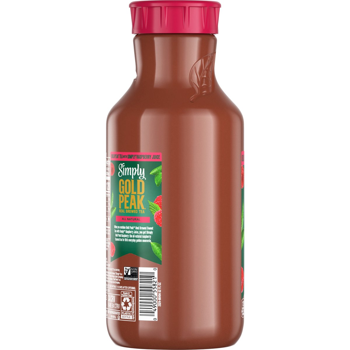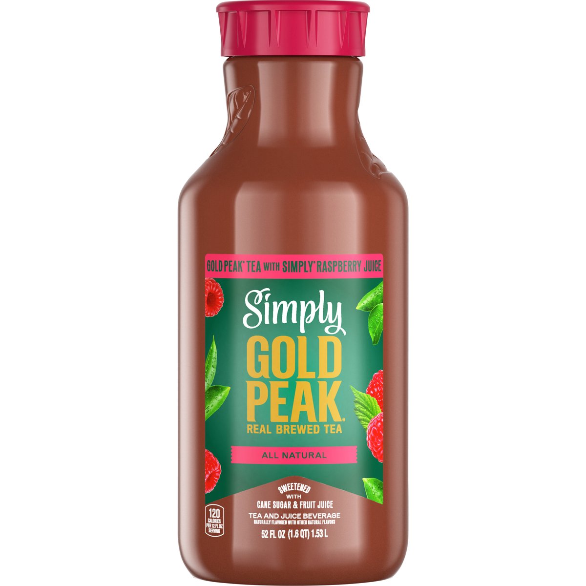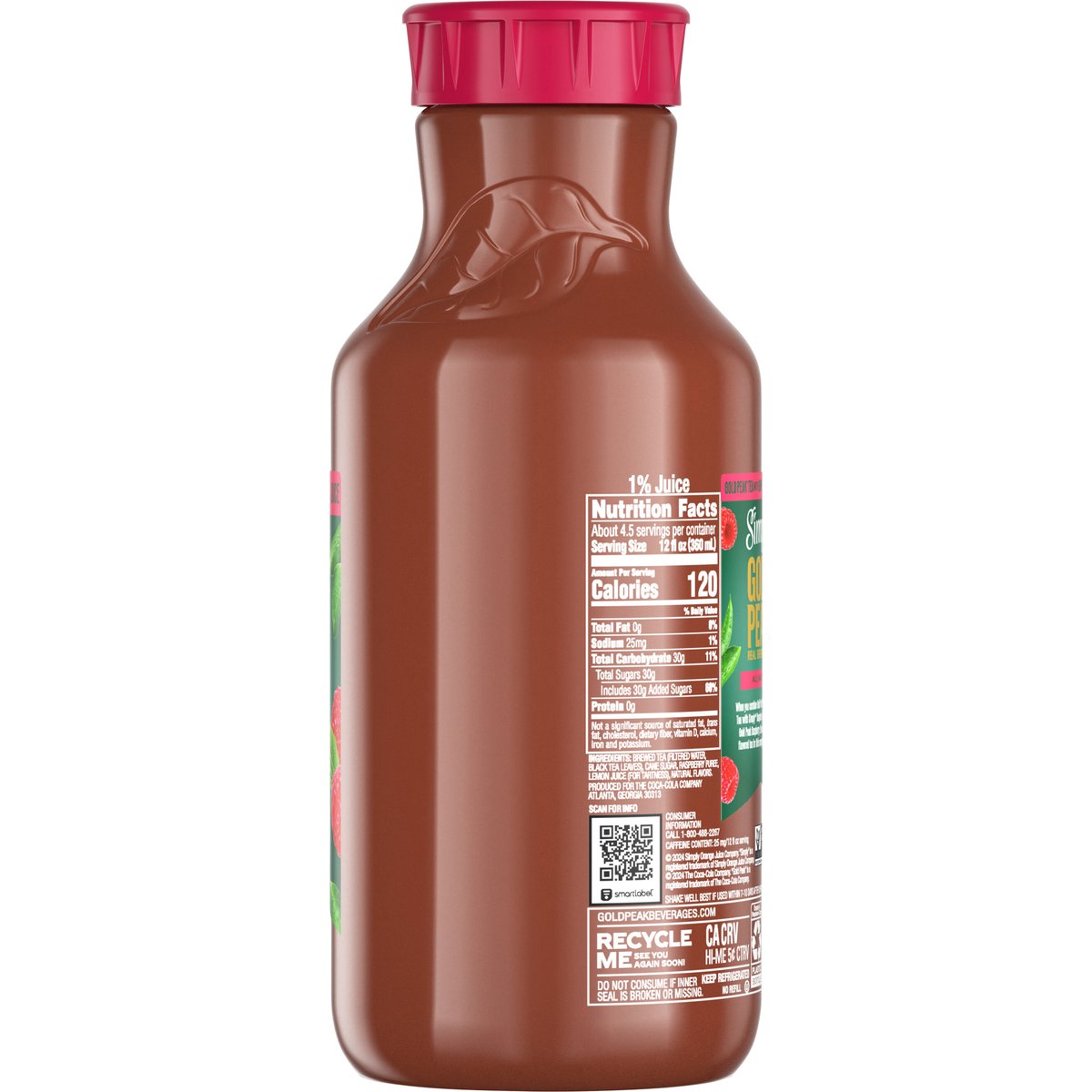 Sweetened with cane sugar & fruit juice. Naturally flavored with other natural flavors. 120 calories per 12 fl oz serving. Caffeine Content: 25 mg/12 fl oz serving. Non-GMO Project verified. nongmoproject.org. All natural. Real brewed tea. Tea and juice beverage. When you combine Gold Peak Real Brewed Sweet Tea with Simply Raspberry Juice, you get Simply Gold Peak Raspberry: the all-natural raspberry flavored tea for life's everyday golden moments. Great brewed taste. goldpeakbeverages.com. how2recycle.info. Smartlabel: Scan for info. Consumer information call 1-800-488-2267. Recycle me. See you again soon!
