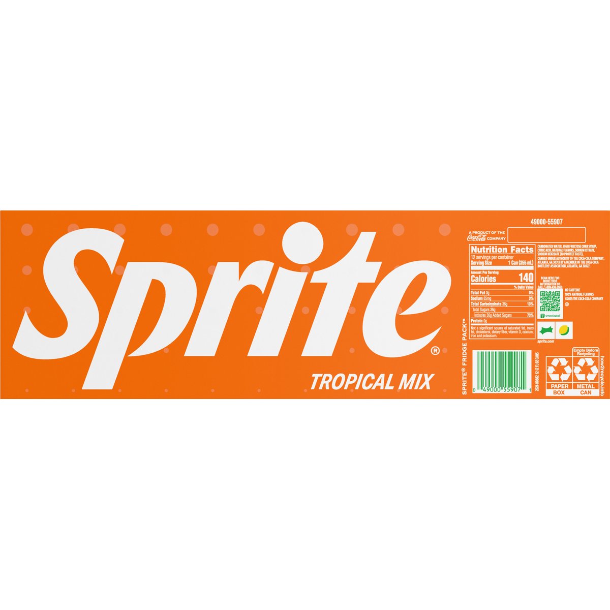 Lemon-lime & tropical flavored soda with other natural flavors. 100% Natural flavors. Per 1 Can Serving: 140 calories; 0 g sat fat (0% DV); 65 mg sodium (3% DV); 36 g total sugars. No caffeine. A product of the Coca-Cola company. sprite.com. how2recycle.info. SmartLabel: Scan for more food information or call 1-800-438-2653. Recycle me. See you again soon.