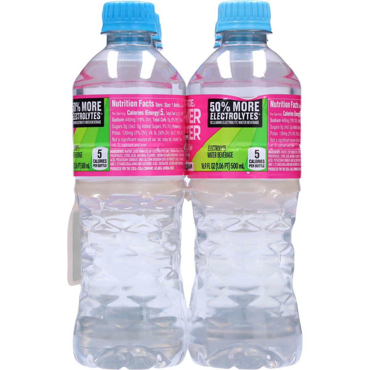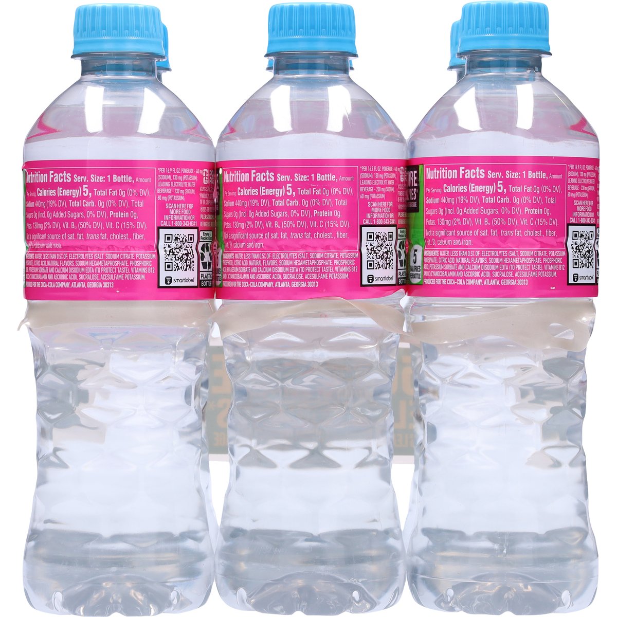 Flavored with other natural flavors. 5 calories per bottle. Zero sugar. 50% more electrolytes* vs leading electrolyte water beverage. * Per 16.9 fl oz Powerade - 440 mg (sodium), 130 mg (potassium): leading electrolyte water beverage - 230 mg (sodium). 60mg (potassium). www.powerade.com. how2recycle.info. SmartLabel: Scan for more food information or call 1-800-343-0341. Please recycle.
