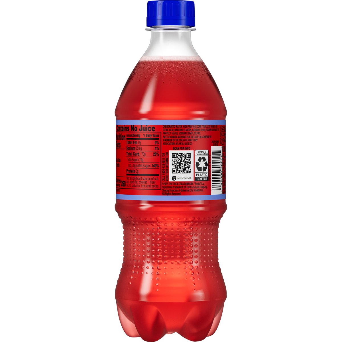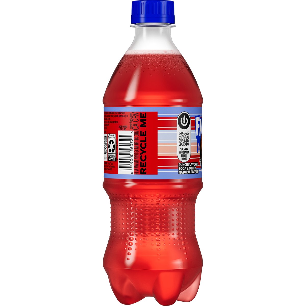 Punch flavored soda with other natural flavors. 260 calories per bottle. Caffeine free. Chucky available on digital. A product of the Coca Cola company. www.fanta.com. how2recycle.info. Scan your Fanta before they do. SmartLabel: Scan for info call 1-800-438-2653 for more food information. 1-800-438-2653. Recycle me. Recycle bottle with cap on.