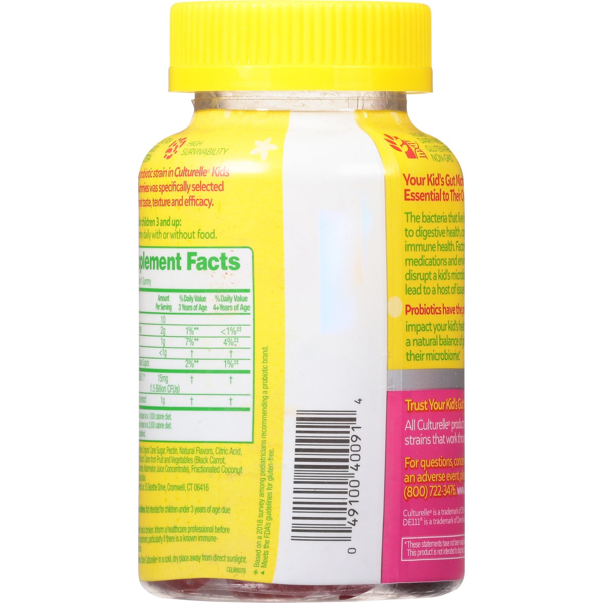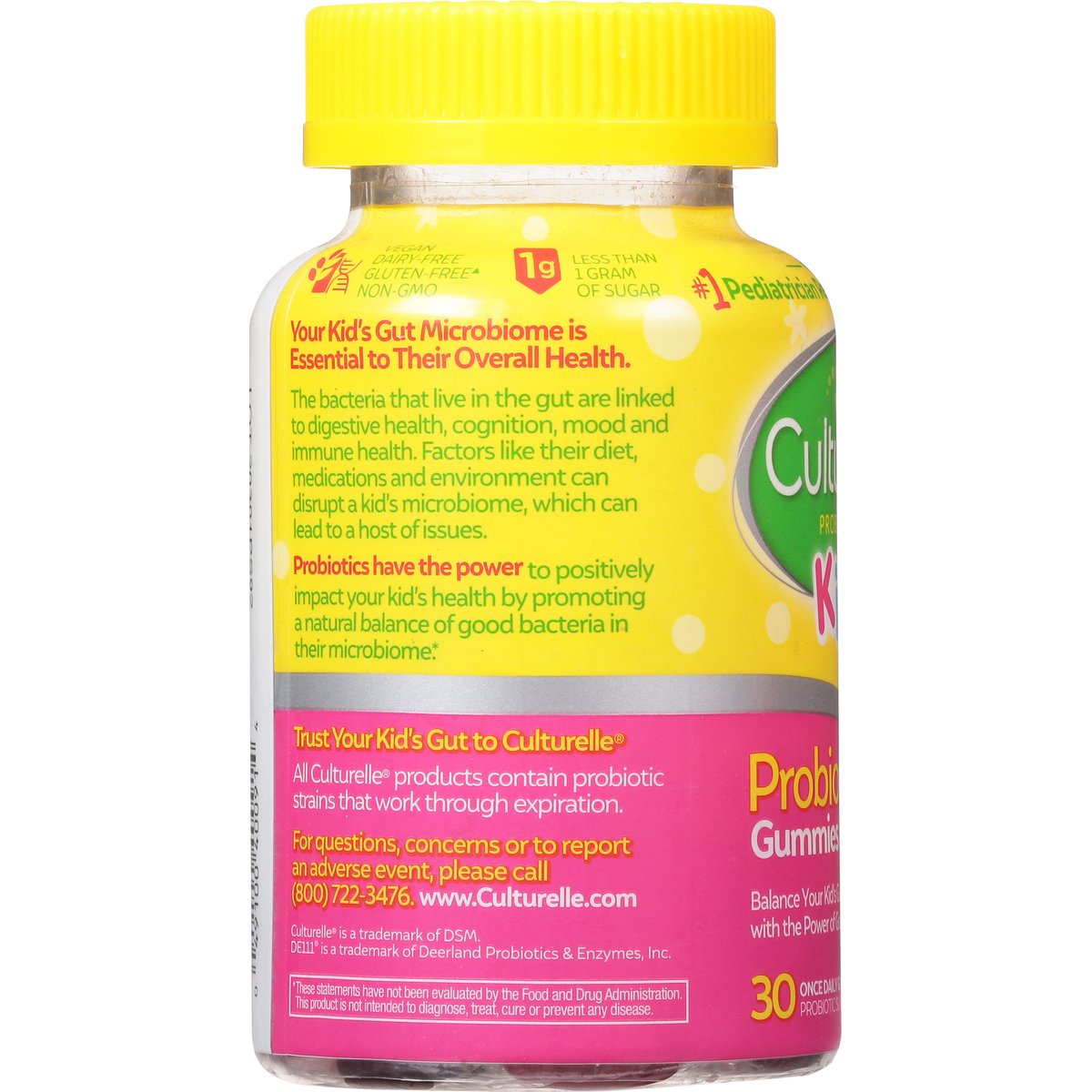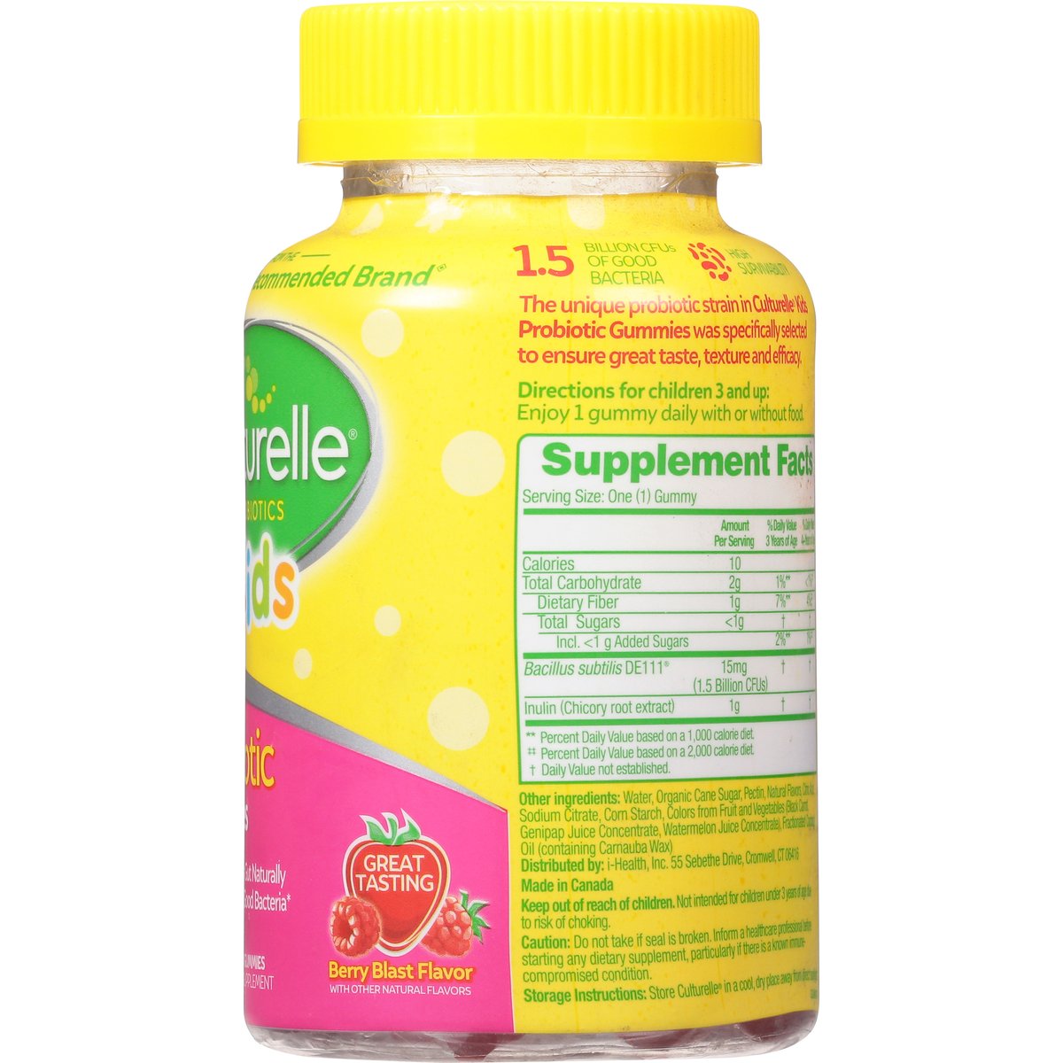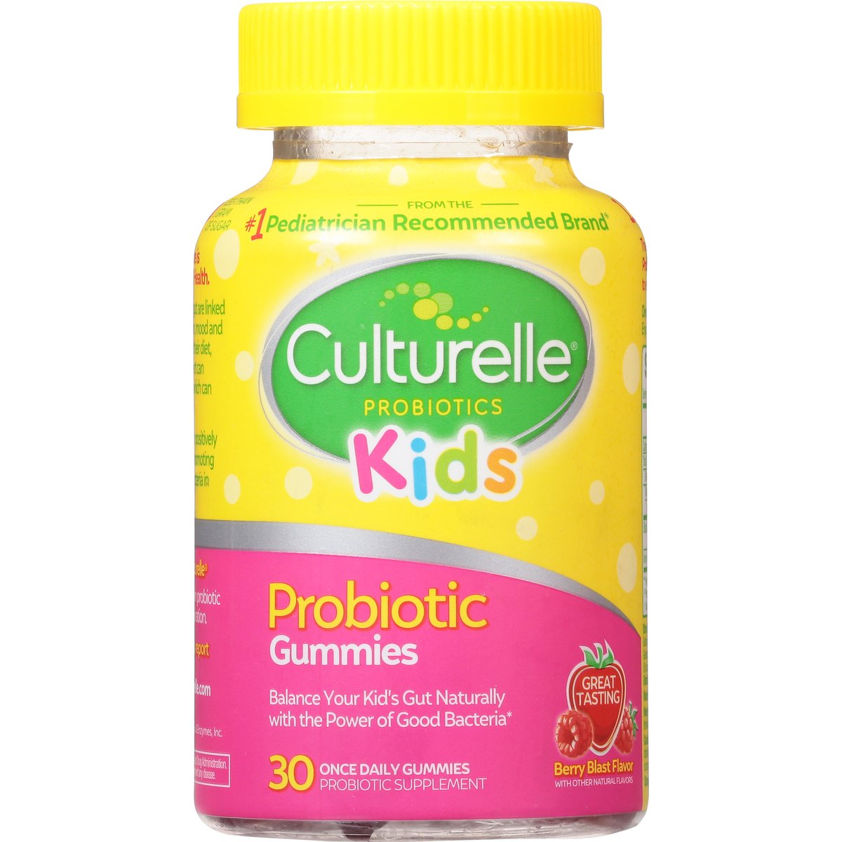 Probiotic Supplement. Berry blast flavor with other natural flavors. Less than 1 gram of sugar. Vegan. Dairy-free. Gluten-free (Meets the FDA's guidelines for gluten-free). Non-GMO. From the No. 1 Pediatrician Recommended Brand (Based on a 2018 survey among pediatricians recommending a probiotic brand). Balance your kid's gut naturally with the power of good bacteria. Great tasting. Your kid's gut microbiome is essential to their overall health. The bacteria that live in the gut are linked to digestive health, cognition, mood and immune health. Factors like their diet, medications and environment can disrupt a kid's microbiome, which can lead to a host of issues. Probiotics have the power to positively impact your kid's health by promoting a natural balance of good bacteria in their microbiome. Trust Your Kid's Gut to Culturelle: All Culturelle products contain probiotic strains that work through expiration. 1.5 Billion CFUs of good bacteria. High survivability. The unique probiotic strain in Culturelle Kids Probiotic Gummies was specifically selected to ensure great taste, texture and efficacy. www.Culturelle.com. For questions, concerns or to report an adverse event, please call (800) 722-3476. www.Culturelle.com. (These statements have not been evaluated by the Food and Drug Administration. This product is not intended to diagnose, treat, cure or prevent any disease.) Made in Canada.