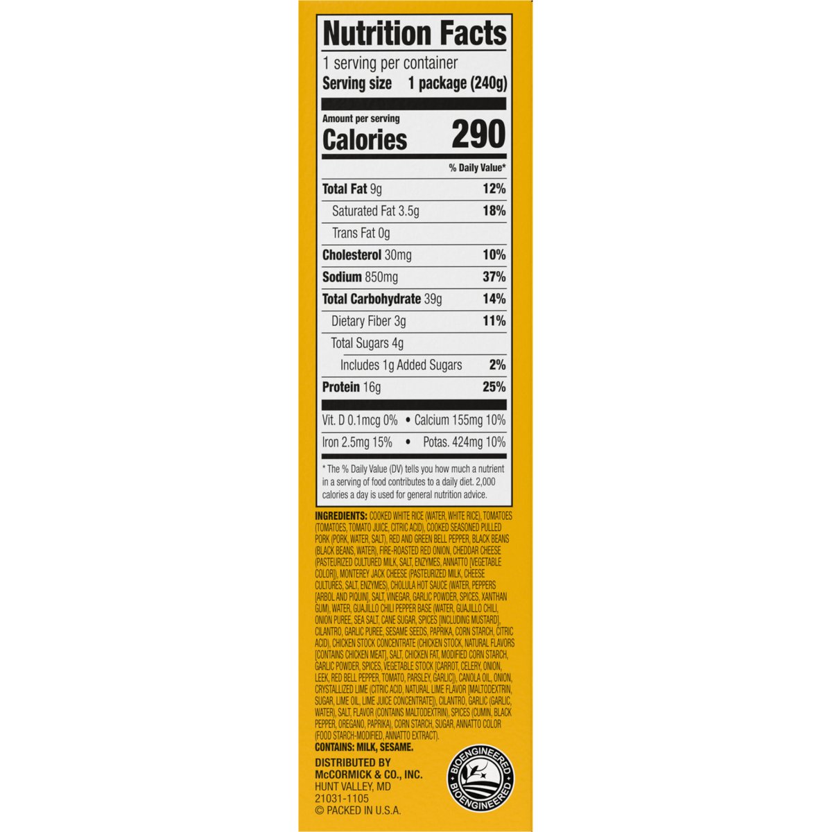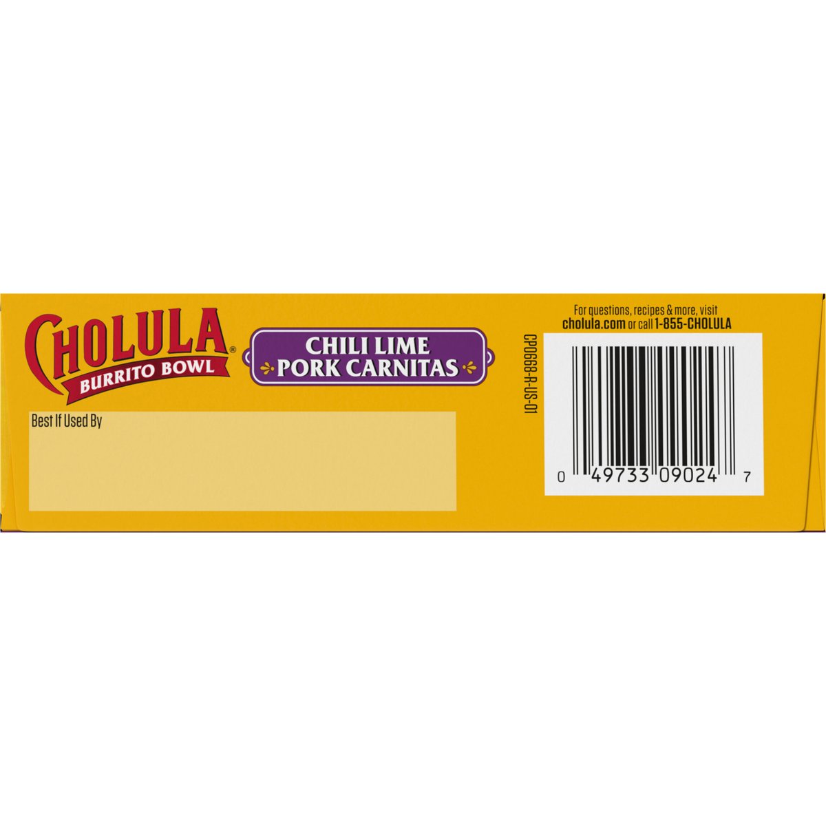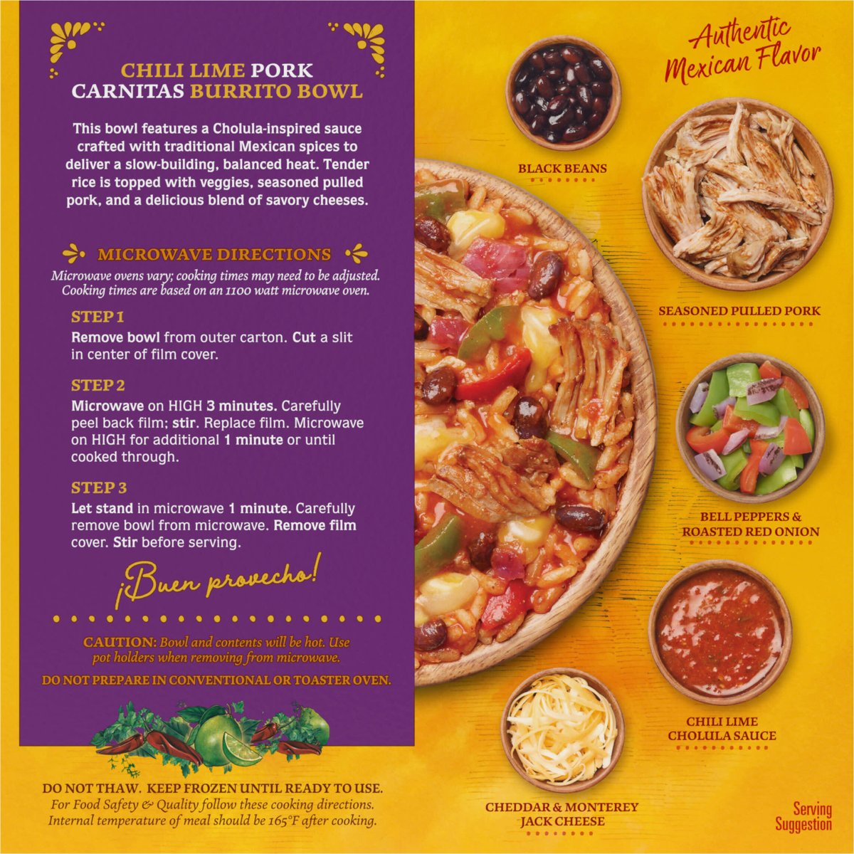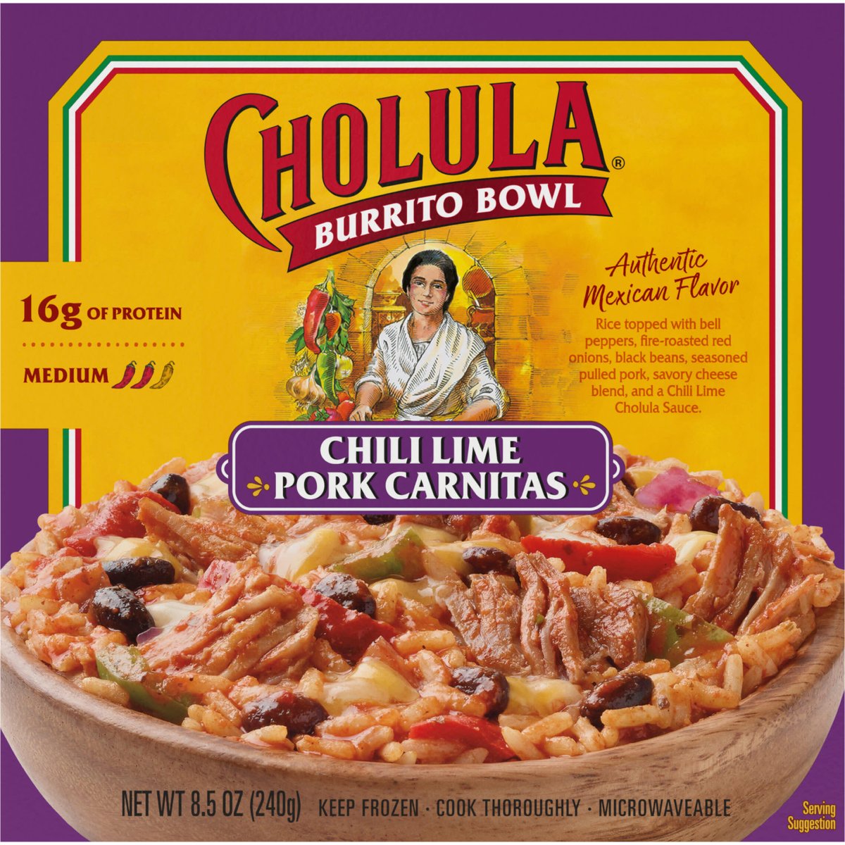 Rice topped with bell peppers, fire-roasted red onions, black beans, seasoned pulled pork, savory cheese blend, and a Chili Lime Cholula Sauce. 16 g of protein Bioengineered. Authentic Mexican Flavor Rice topped with bell peppers, fire-roasted red onions, black beans, seasoned pulled pork, savory cheese blend, and a Chili Lime Cholula Sauce. Cook thoroughly. cholula.com. For questions, recipes & more, visit cholula.com or call 1-855-Cholula. Packed in U.S.A.