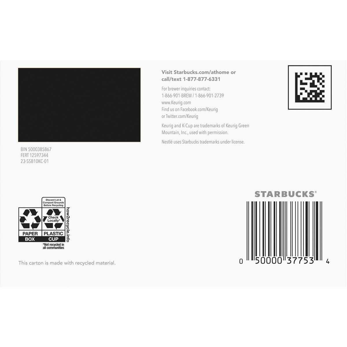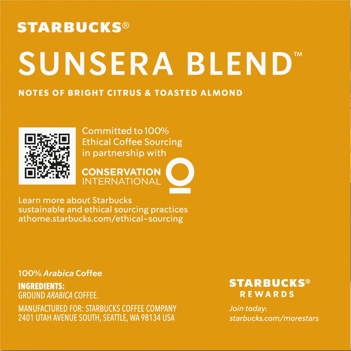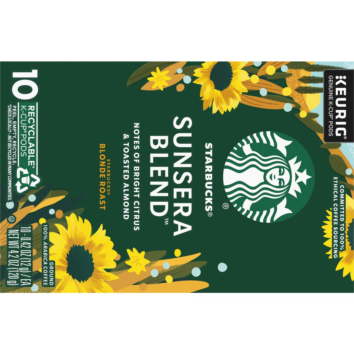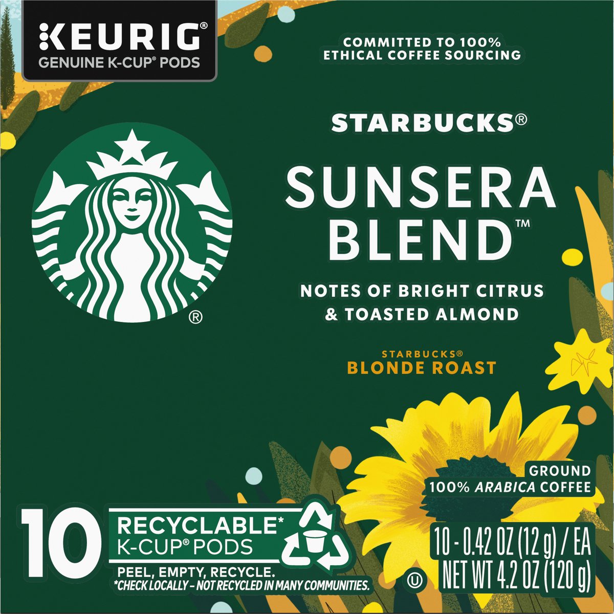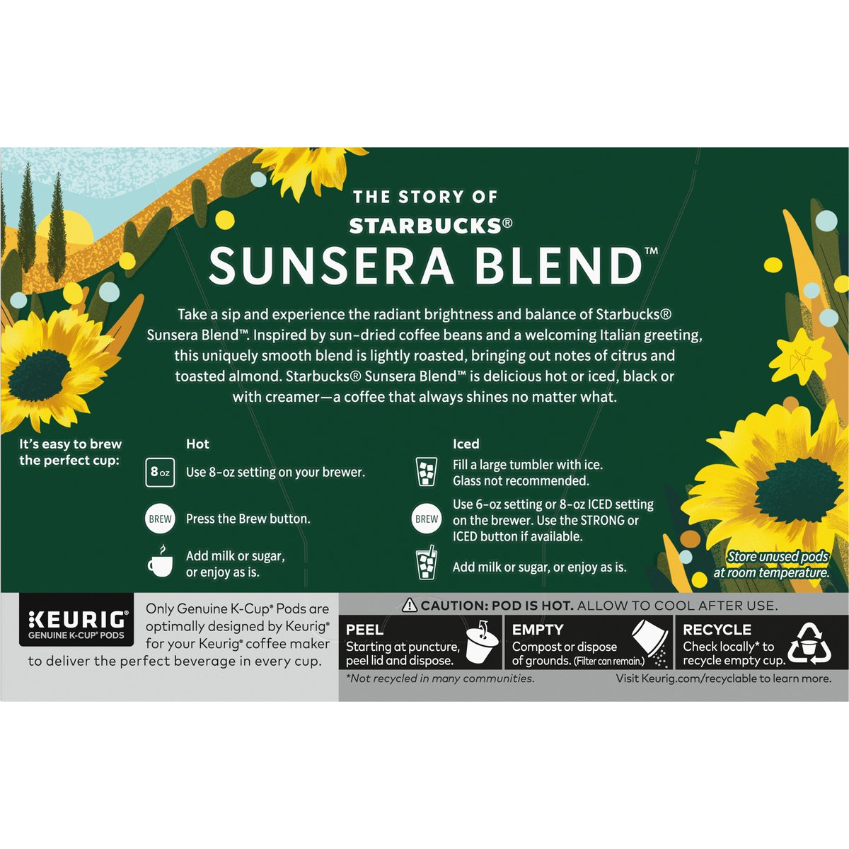 Notes of bright citrus & toasted almond. 100% arabica coffee. Genuine K-Cup pods. The story of Starbuck Sunsera Blend: Take a sip and experience the radiant brightness and balance of Starbucks Sunsera Blend. Inspired by sun-dried coffee beans and a welcoming Italian greeting, this uniquely smooth blend is lightly roasted, bringing out notes of citrus and toasted almond. Starbucks Sunsera Blend is delicious hot or iced, black or with creamer - a coffee that always shines no matter what. Only Genuine K-Cup Pods are optimally designed by Keurig for your Keurig coffee maker to deliver the perfect beverage in every cup. starbucks.com/athome. www.keurig.com. keurig.com/recyclable. how2recycle.info. starbucks.com/morestars. Find us on Facebook.com/Keurig or Twitter.com/Keurig. Visit Starbucks.com/athome or call/text 1-877-877-6331. For brewer inquiries contact: 1-866-901-Brew/1-866-901-2739 www.Keurig.com. Starbucks Rewards: Join Today: starbucks.com/morestars. This carton is made with recycled material. Committed to 100% ethical coffee sourcing. Recyclable* K-Cup pods. Peel, empty, recycle. Peel: Starting at puncture, peel lid and dispose. Empty: Compost or dispose of grounds. (Filter can remain.) Recycle: Check locally* to recycle empty cup. Visit Keurig.com/recyclable to learn more. Committed to 100% Ethical Coffee Sourcing in partnership with Conservation International. Learn more about Starbucks sustainable and ethical sourcing practices athome.starbucks.com/ethical-sourcing. * Check locally-not recycled in many communities. * Not recycled in many communities.