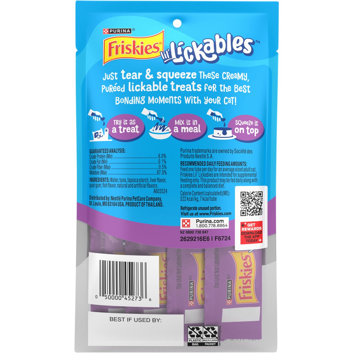 Guaranteed Analysis Calorie Content (Calculated)(ME): 522 kcal/kg, 7 kcal/tube. Handfeedable puree. Just tear & squeeze these creamy, pureed lickable treats for the best bonding moments with your cat! Friskies.com. Purina.com. how2recycle.info. Get rewards. Download the app today. Visit us at www.friskies.com. purina.com. 1.800.778.8864. Product of Thailand.