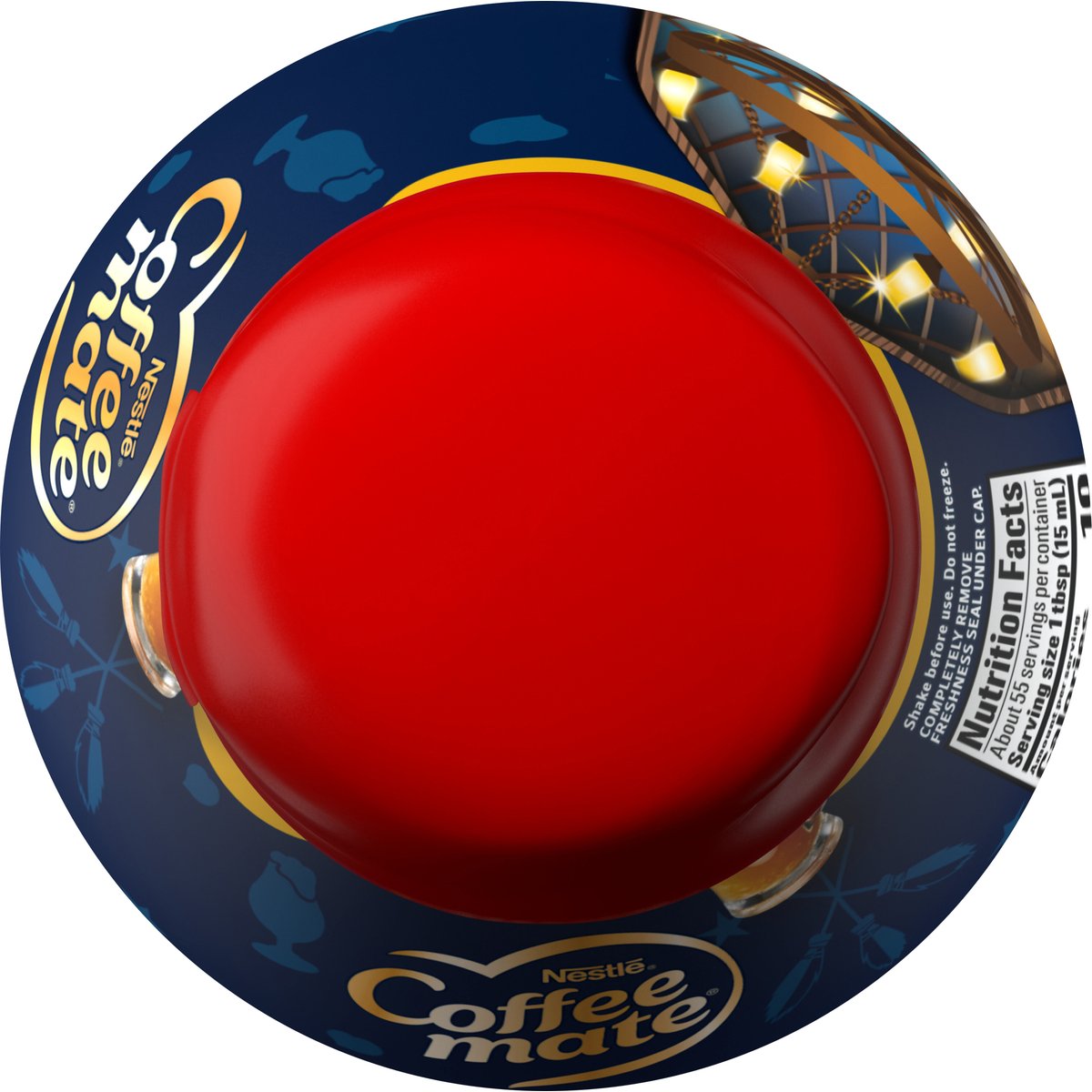 Artificial flavor. Per 1 Tbsp: 10 calories; 0 g sat fat (0% DV); 5 mg sodium (0% DV); 0 g total sugars. Gluten free. Cholesterol free. Reduced calorie*. Cholesterol-free. Calorie content has been reduced from 35 to 10 calories per serving. Thoughtful Portion: Use in moderation for your perfect cup. 1 tbsp = 10 calories. Let's Talk: For more barista inspired content visit: coffeemate.com call/text: 800.637.8534. * 70% fewer calories than regular flavored coffee mate. Ingredients derived from a bioengineered source. Raise your mug to the iconic wizarding drink! coffeemate.com. how2recycle.info. Recyclable bottle.