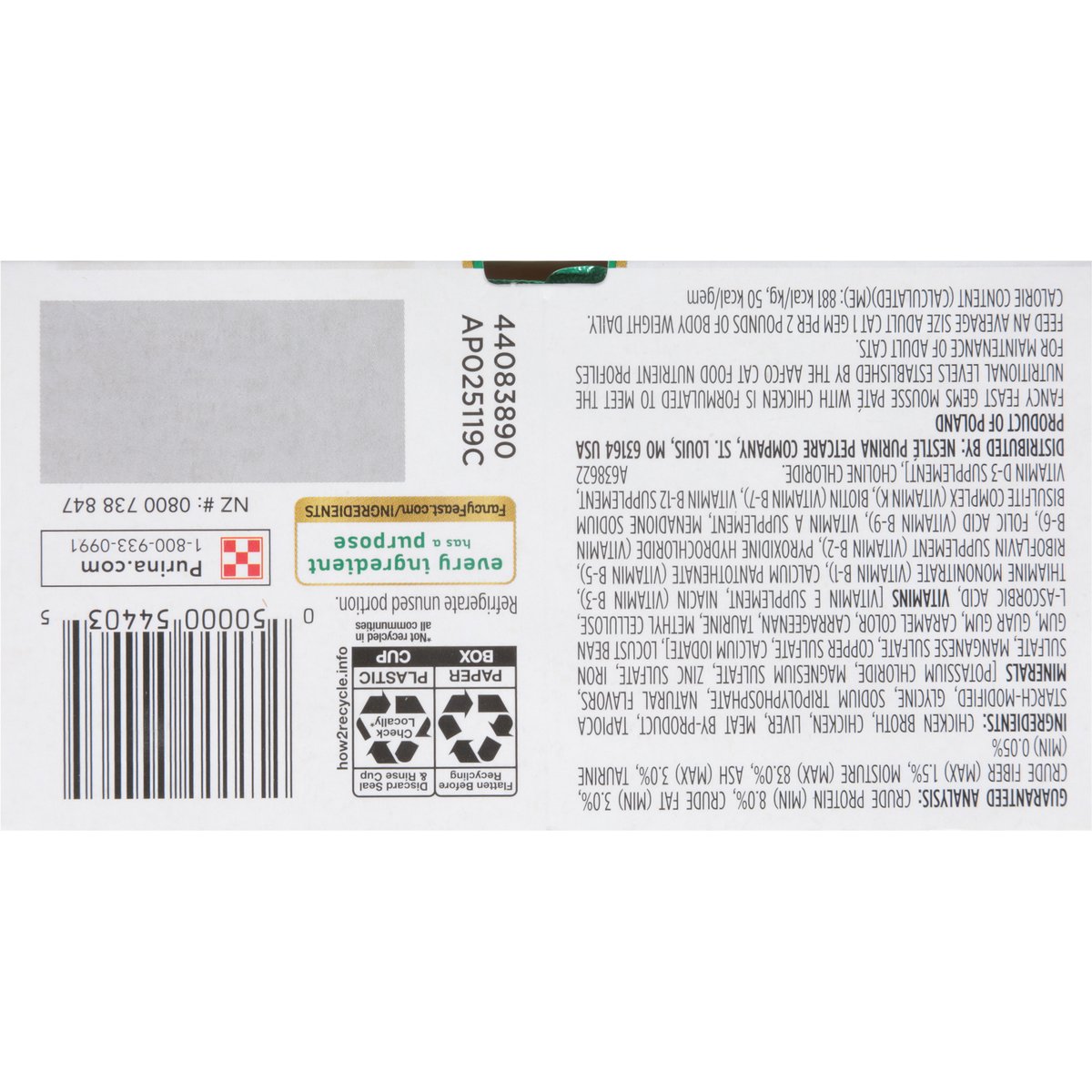 2 Entrees. Mousse pate with chicken and a halo of savory gravy. Purina.com. how2recycle.info. FancyFeast.com/ingredients. Every ingredient has a purpose. FancyFeast.com/ingredients. NZ: 0800 738 847. Product of Poland.