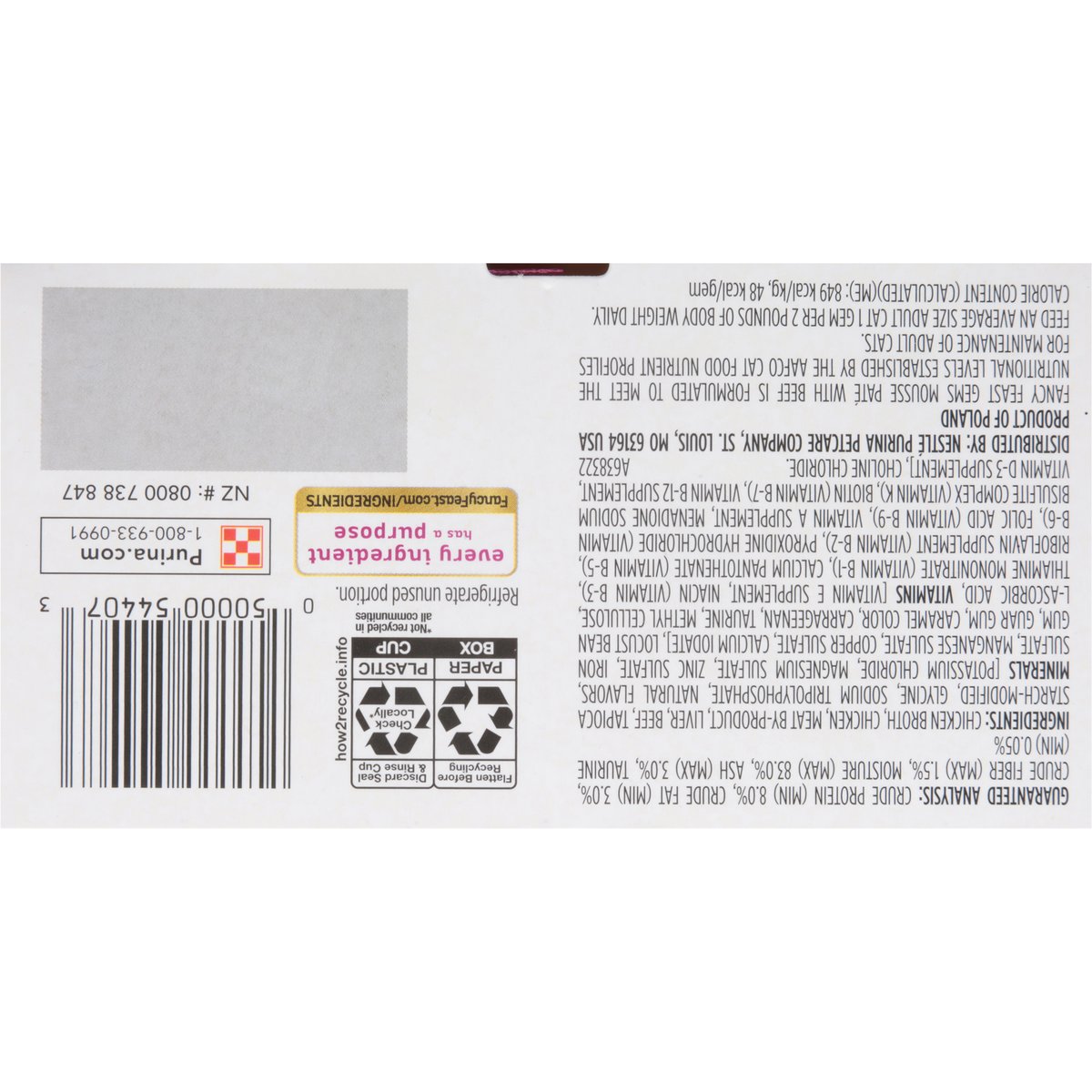 2 Entrees. Mousse pate with beef and a halo of savory gravy. how2recycle.info. FancyFeast.com/ingredients. Purina.com. Every ingredient has a purpose: FancyFeast.com/ingredients. Purina.com; 1-800-933-0991. NZ 0800 738 847. Product of Poland.